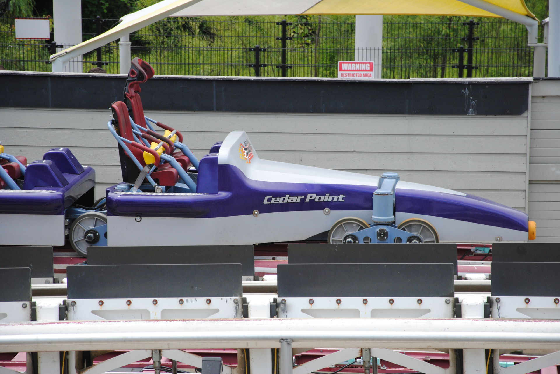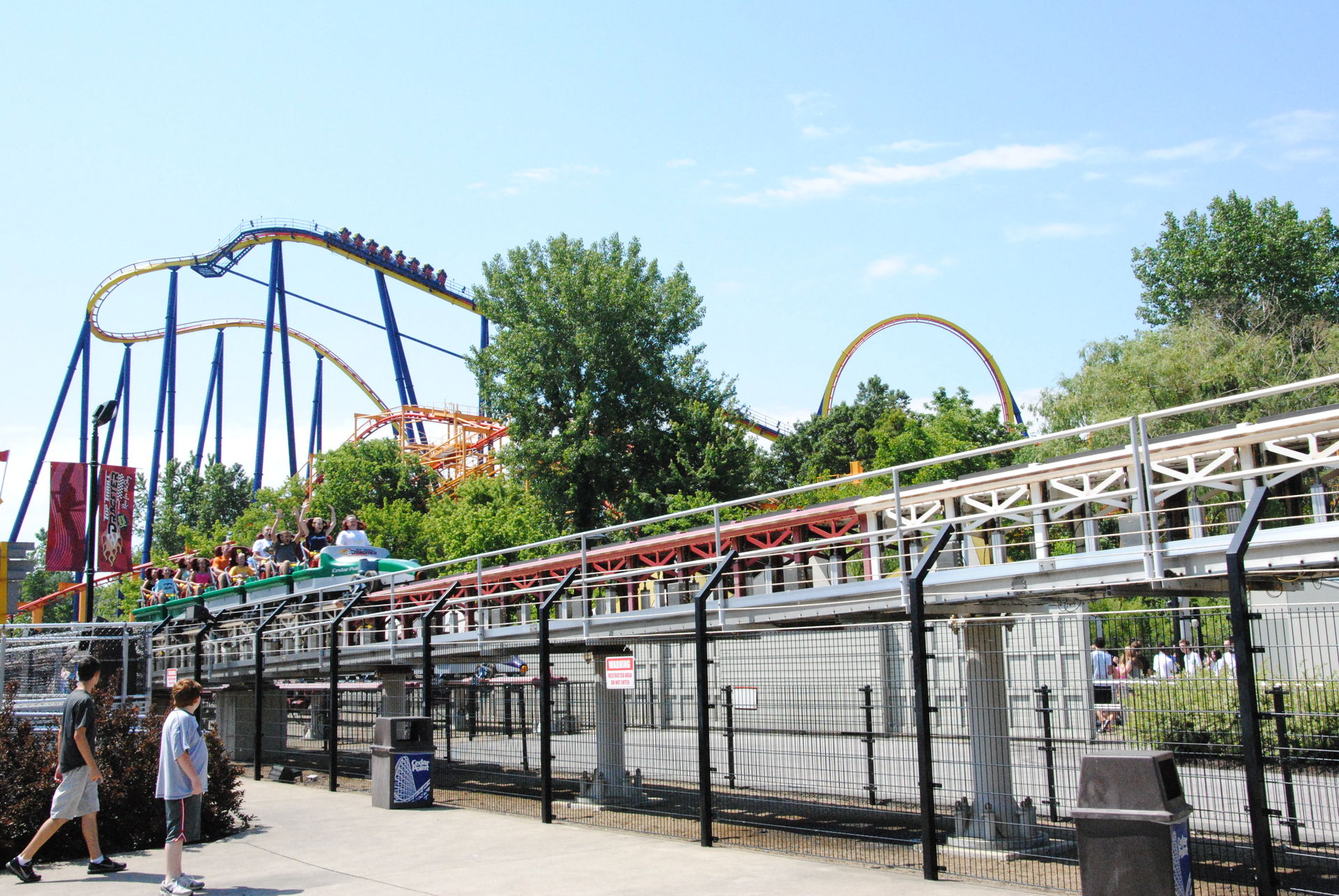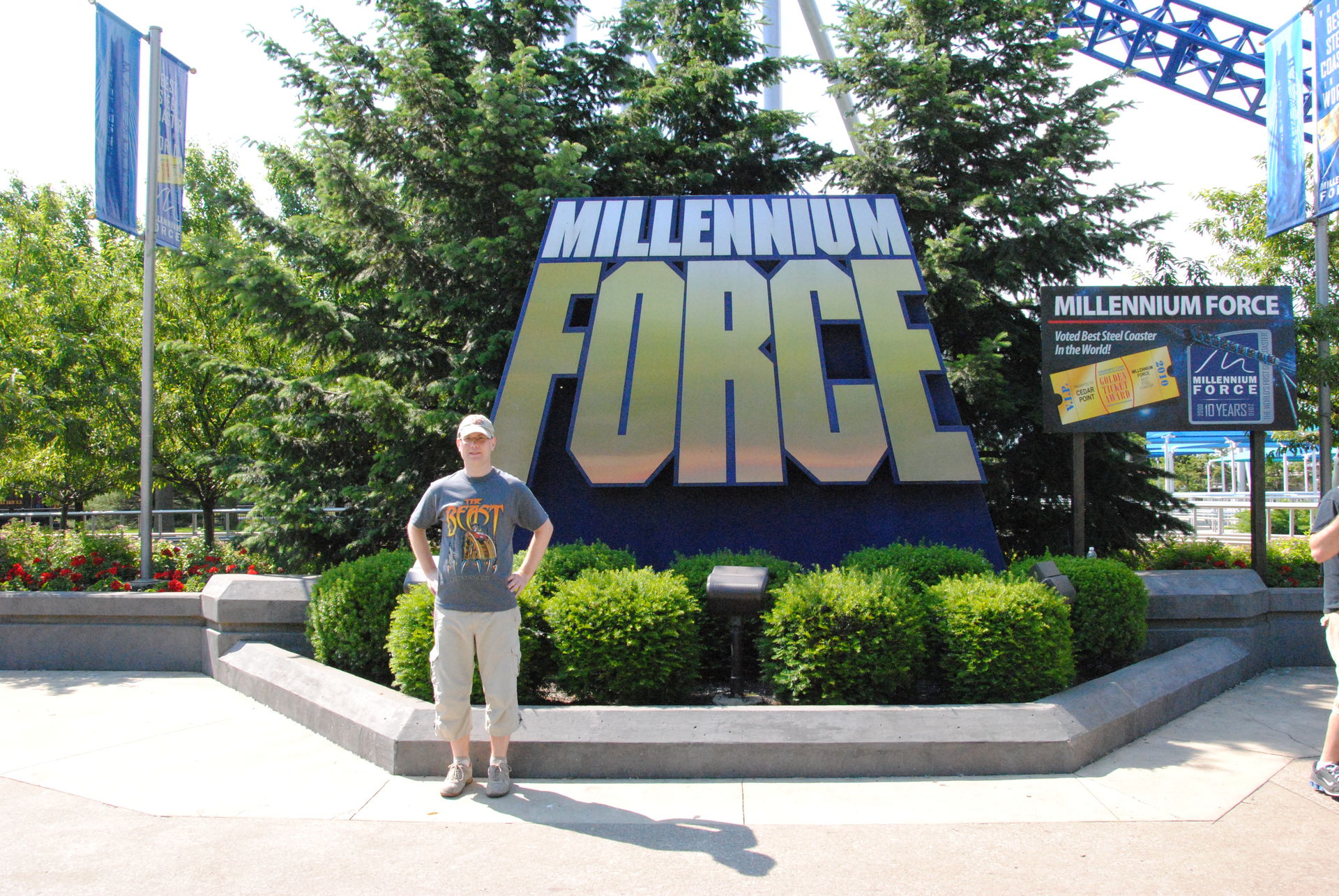Danach verspürten wir dann doch Lust mal einiges an Speed zuzulegen, und haben uns zur Millennium Force begeben. Nach 45 Minuten Wartezeit erreichten wir die Station und ich stellte verwundert fest, das man für die letzte Reihe nur einen Zug warten musste, während man für die erste Reihe noch einmal 30 Minuten hätte investieren müssen. Das man in den USA für die letzte Reihe auch nicht länger wie für die Mitte des Zuges warten muss, ist mir schon beim Intimidator 305, El Toro und Voyage aufgefallen. Gut für uns, also gab es die Premierenfaht in der letzten Reihe.