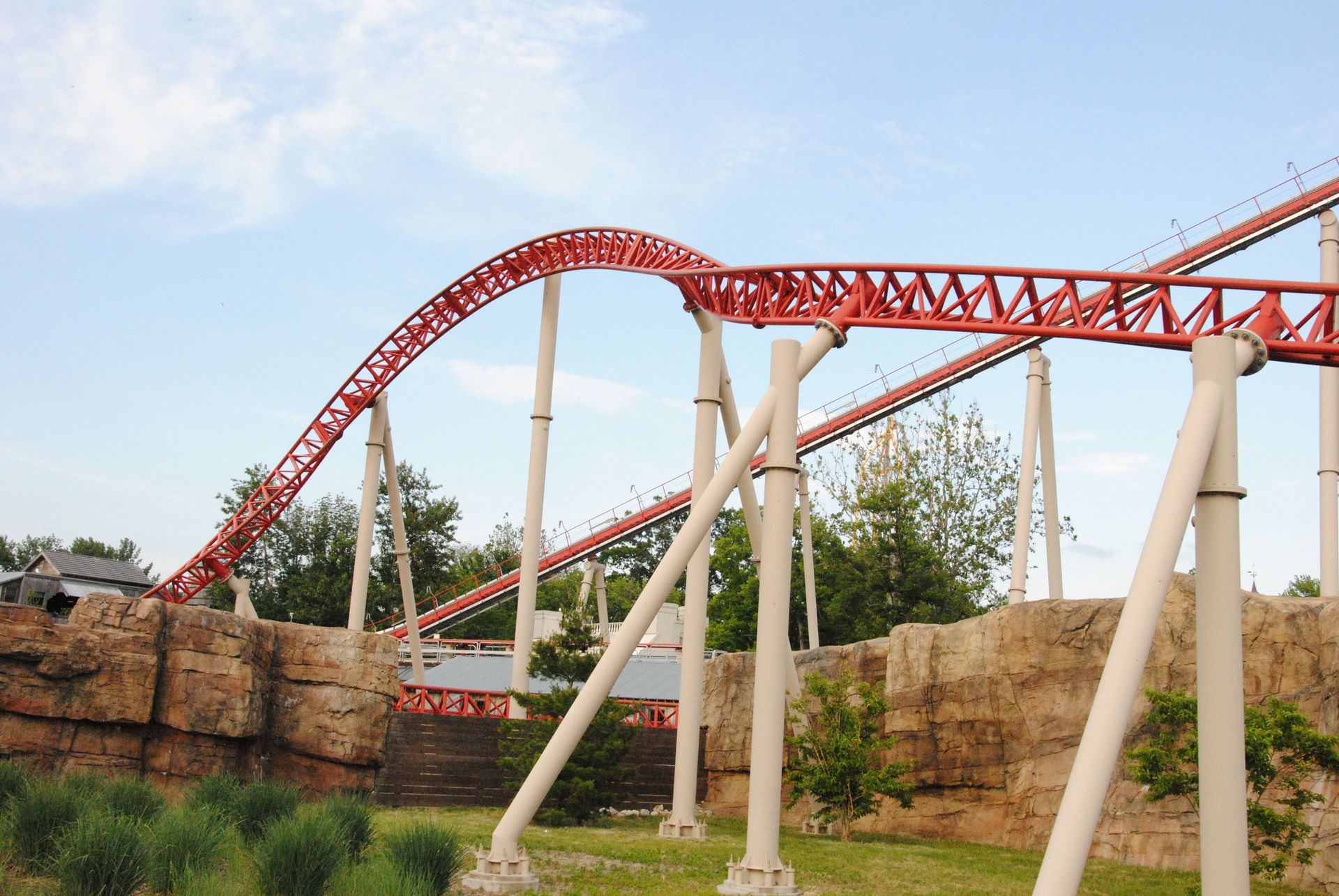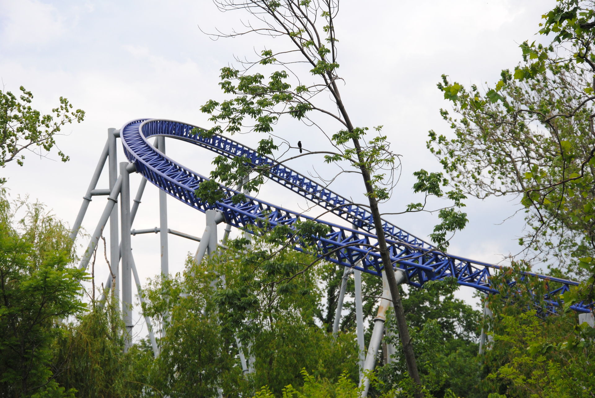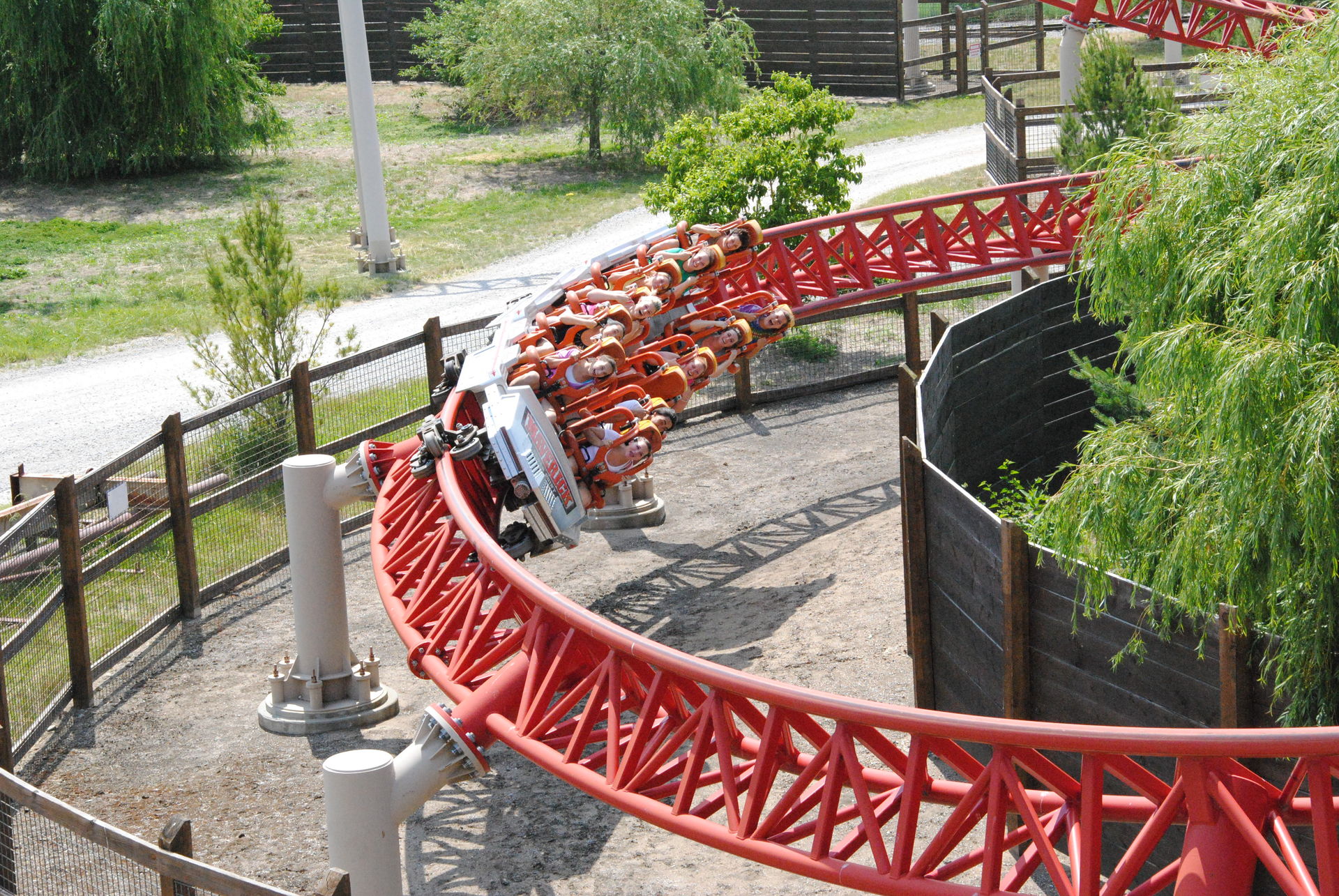 Der schnelle Lifthill bringt uns zügig auf die Kuppe, es bleibt aber noch ein klein wenig Zeit das Panorama des Parks zu genießen, bevor man in die Tiefe blickt und knapp 90 Meter herunter gezogen wird. Meine ausgestreckten Hände beenden dreimal abrupt die Flugbahn einheimischer Insekten, ein wohl eher geringer Wert. Mit dem nachfolgenden overbanked Turn erfolgt prompt der Richtungswechsel und eine scharfe Linkskurve durch den ersten Tunnel führt zum ersten