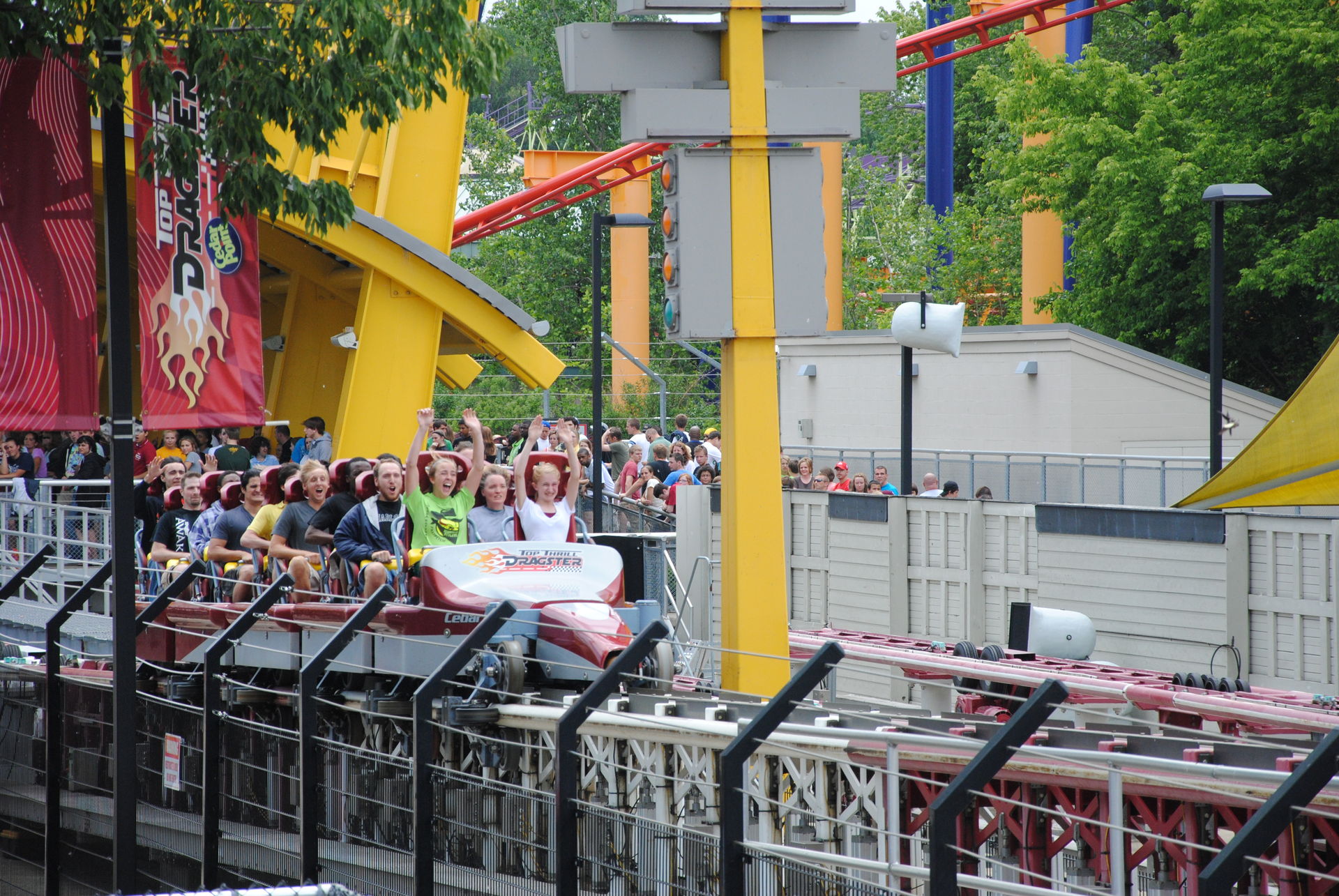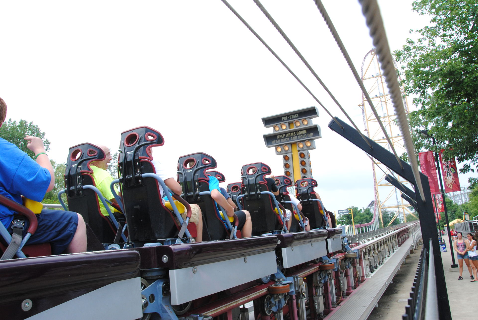 Den nächsten Morgen starten wir mit Millennium Force in der Front und auch 2 Fahrten auf Maverick kriegen wir noch während des Früheinlasses für Hotelgäste und Seasonpassbesitzer bewerkstelligt. Leider ist unser nächstes Ziel, der Top Thrill Dragster während dieser goldenen Stunde nicht im Angebot. Während des Wartens lernen wir eine nette Französin kennen, die während des Sommers als Ride-Op bei Magnum-XL arbeitet und ab dem Herbst eine Schule direkt neben meiner Arbeitsstelle besuchen wird. So klein ist die Welt. Von ihr erfahren wir einiges aus dem Leben eines Ride-Op's in Cedar Point, ganz schön knackige Arbeitszeiten. Na ja, sie ist ja noch jung und nach 3 Monaten ist ja schon wieder alles vorbei. Durch das Gespräch mit ihr ist die Wartezeit recht kurzweilig, unsere Wege trennen sich aber, als noch 2 Plätze frei geworden sind, die sonst niemand haben will und wir 4 Züge Wartezeit sparen. Wir fahren auf die Startposition und trotz Erfahrung auf Kingda Ka und Dodopa lässt uns das nicht kalt. Das heiß-geliebte Kribbeln im Bauch setzt ein und der Blick ist auf die Startampel und den