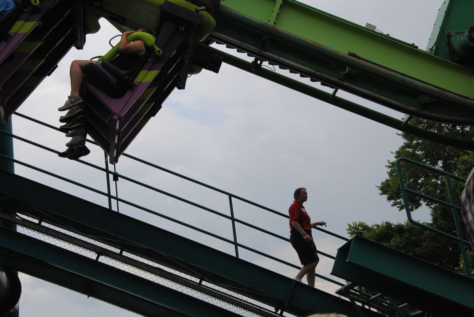 Der getrennte Ein- und Austiegsbereich ermöglicht einen Dreizugbetrieb, wobei sich nur ein Zug auf der Strecke befinden kann. Einmal gab es einen kurzen aber kräftigen Regenschauer, wodurch es eine knapp zehnminütige Pause gab. Der Zug im Einstiegsbereich blieb leer stehen, wodurch der dritte, noch mit Passagieren gefüllte Zug in der Bremse blieb und die Insassen klatsch nass wurden. Erst als der Regen nach ließ fuhr der (immer noch) leere Zug ab, und der gesoakte Zug konnte endlich in den Austiegsbereich einfahren. Mit einem breiten Grinsen begrüßte der Ride-OP die Fahrgäste und bekam nach seinem