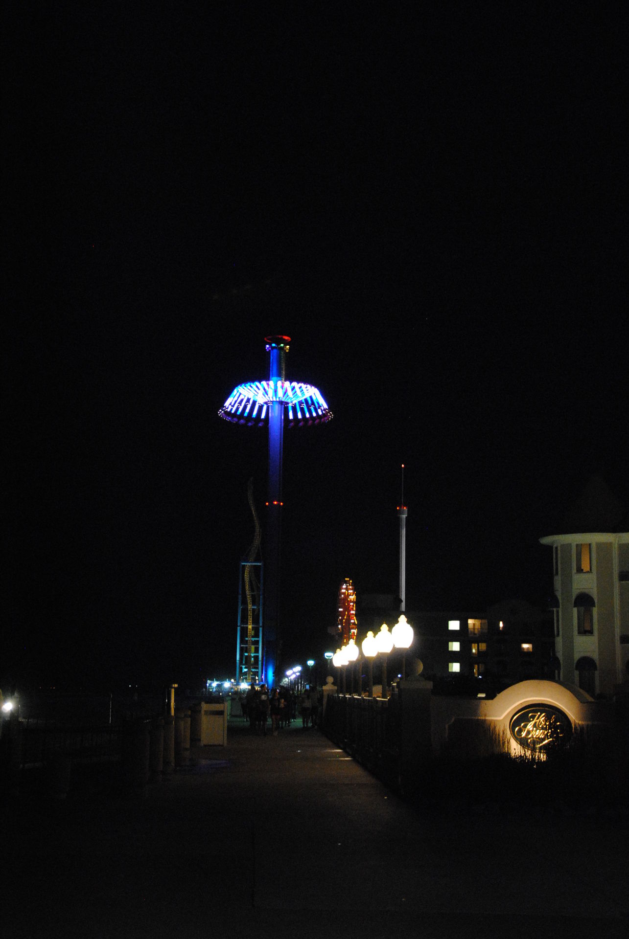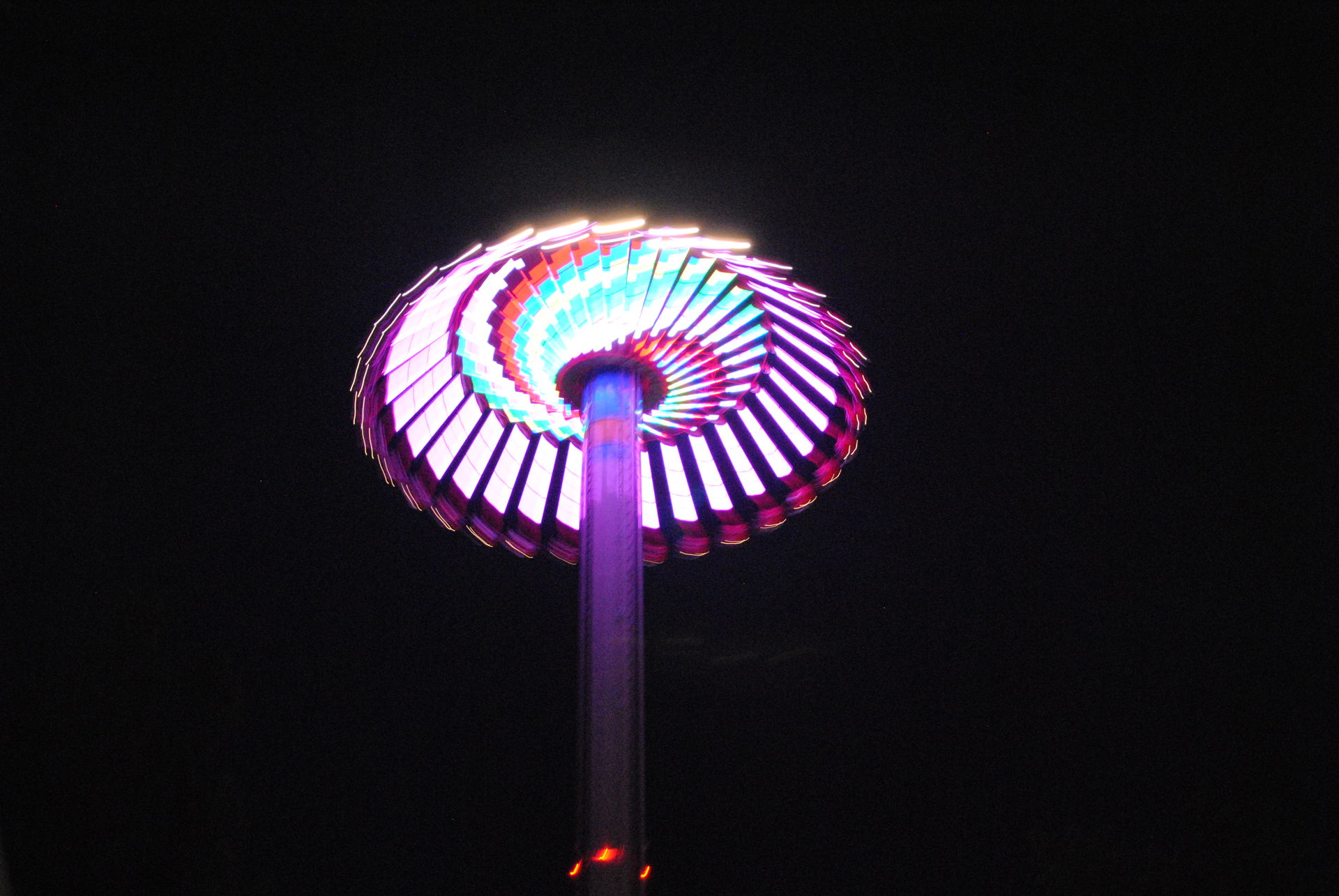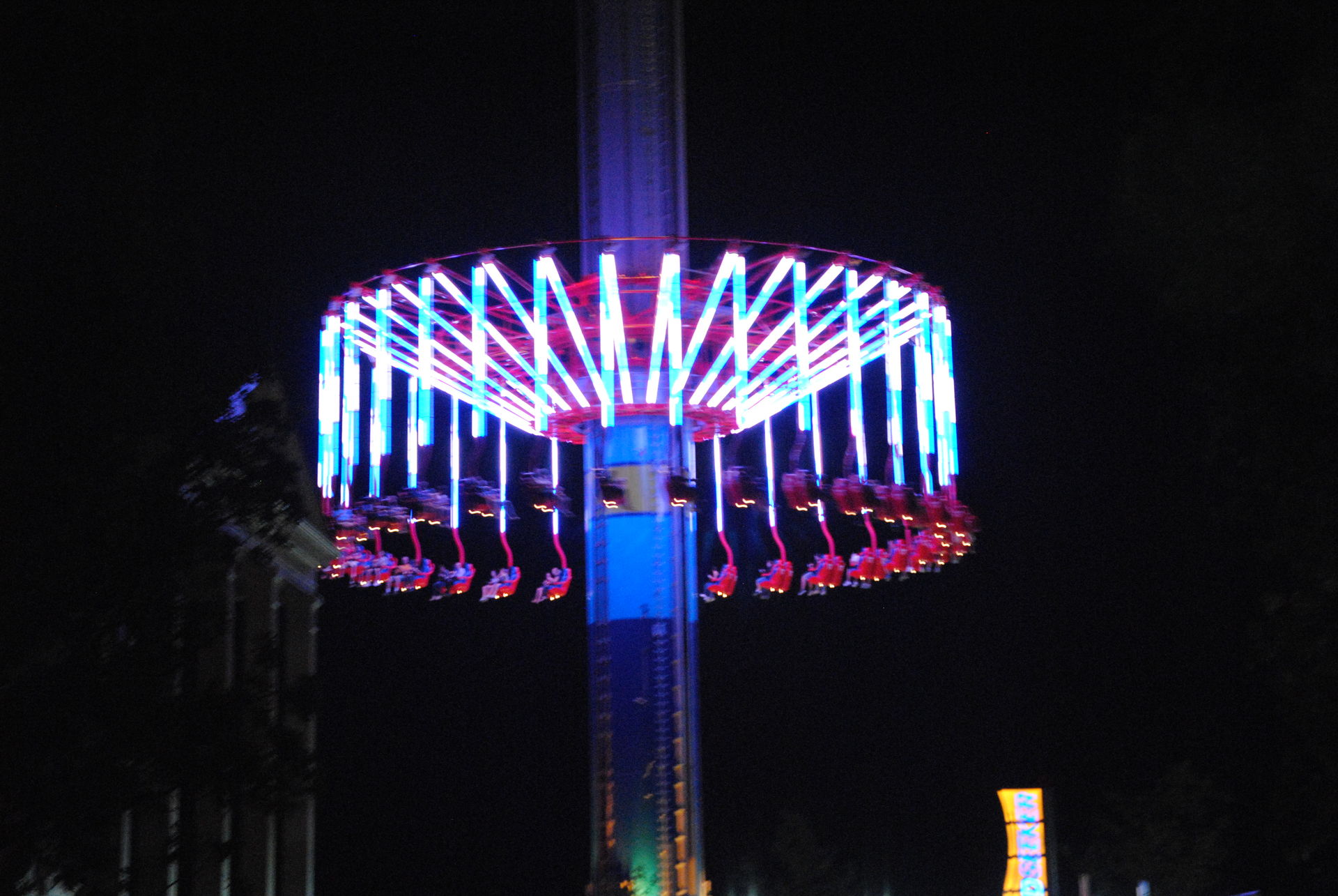 Direkt neben dem Twister wurde die diesjährige Neuheit WindSeeker platziert. Neben den 3 "großen" Achterbahnen gab es hier die meiste Wartezeit und auch die meisten Ausfälle. Immer wieder mussten die Techniker ran, um die Störungen zu beheben, zumeist wenn wir fahren wollten. Im Dunkeln ist der WindSeeker mit seiner Beleuchtung auf alle Fälle ein eye-catcher.