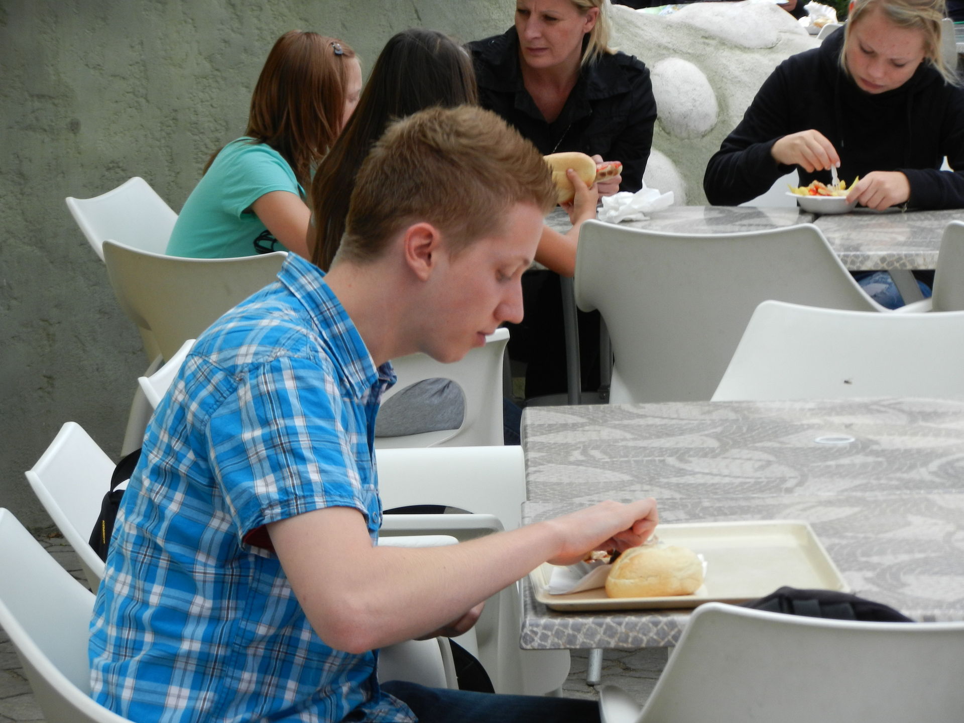Während Andi seine Currywurst diniert,