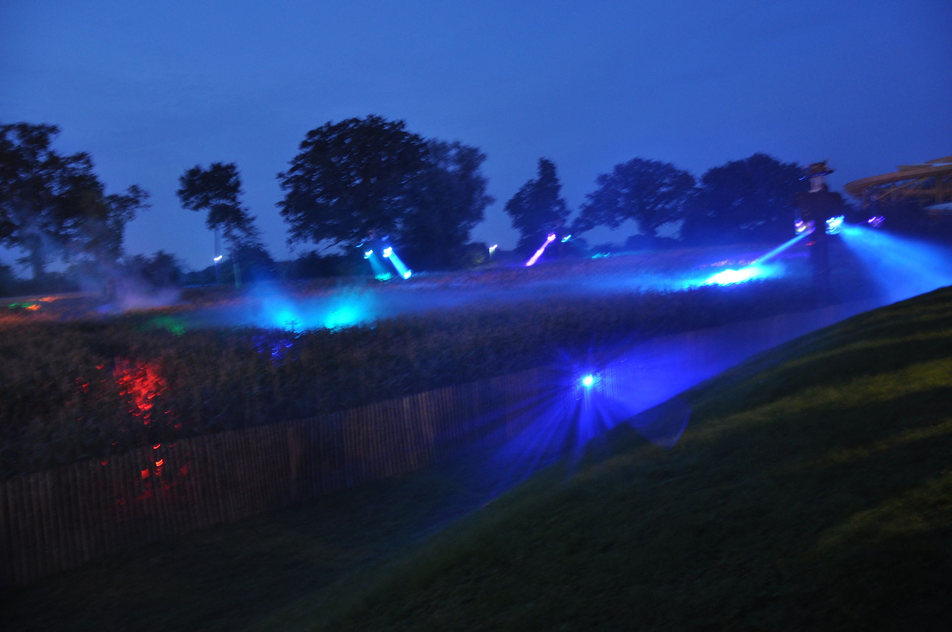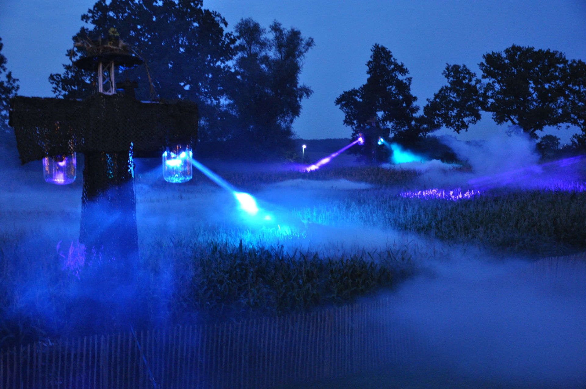 Der Blick war phantatisch. Dazu die Musik als Untermalung und die Schreie aus dem Feld. Wir konnten es gar nicht erwarten rein zu kommen. Dazu in unregelmäßigen Abtänden lauter Donner und helle Blitze. Aber dann die Ernüchterung, die Länge der Warteschlange. Wir haben uns um 19:40 Uhr angestellt, und der Park wollte um 21:00 Uhr schließen. Unsere Befürchtung war, dass sie irgendwann die Schlange kappen und sagen Schade für euch, aber wir müssen jetzt schließen. Dem war aber nicht so, so dass wir gegen 22:00 Uhr ins Feld konnten. Die Zeit in der Queue wurde aber nicht langweilig, da nach 21:00 Uhr die Erschrecker aus den anderen Maze zu uns kamen und sich darum kümmerten das niemanden langweilig wurde.