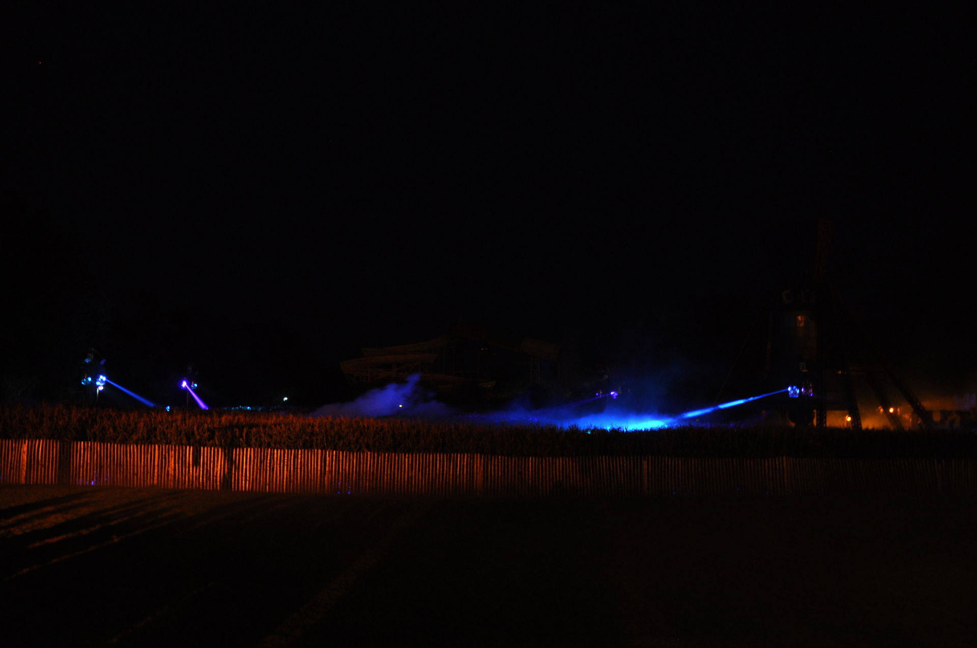 Der Pfad durch das Maisfeld dauerte ca. 20 - 25 Minuten. Und wurde gut bespielt. Es gab eine Menge Positionen und an vielen Akteuren kamen wir öfter vorbei. Leider war die Gruppe hinter uns viel zu schnell, und so hatten wir teilweise mehr den Eindruck auf der Flucht zu sein als eine Maze zu genießen. Es war aber auch schon sehr spät und wir gehörten mit zu den letzten Gruppen. Danach haben wir noch ein bißchen mit den Mitgliedern der Boo-Crew geklönt und sind dann durch den leeren Park zum Parkplatz. Das war kurz nach 22:30.