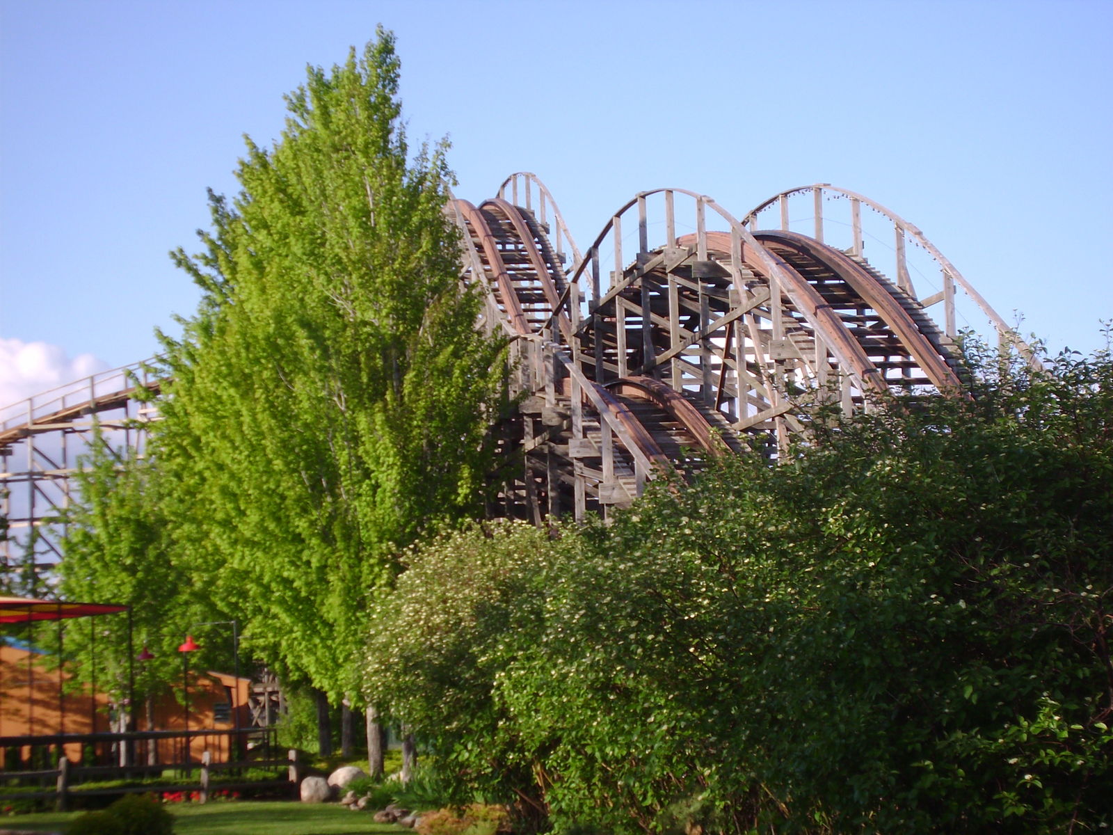 Intamin'schen Druckölförderer und so starten wir den Tag mit einer mehrfahrtigen Session auf Montezumas Revenge. Aufgrund des stationären Eingriffs in das Kreislaufsystem ist derzeit keine Fahrt auf Xcelerator verpassbar, sondern es sind nur emsige Kranbewegungen zu verfolgen. Wir nutzen die (Un-)Gunst der Stunde, gehen Kaffee trinken -natürlich mit Blick auf die Kranbewegungen- besuchen die slapstickreiche und superwitzige Cowboy Stunt Show und die Mystery Lodge und haben einen wunderbar entspannten Spaßtag.