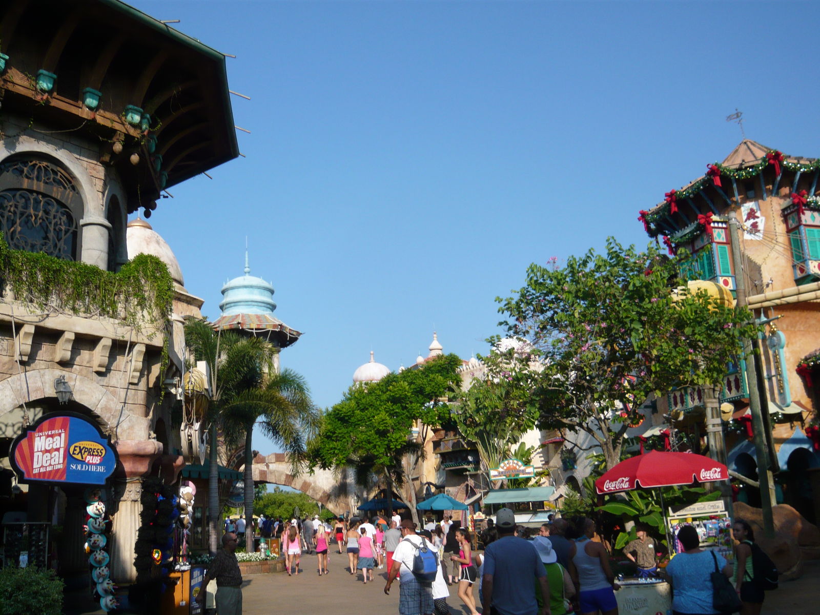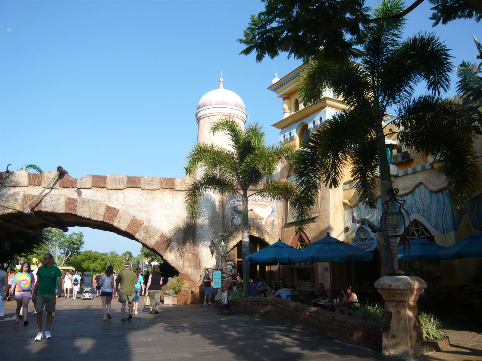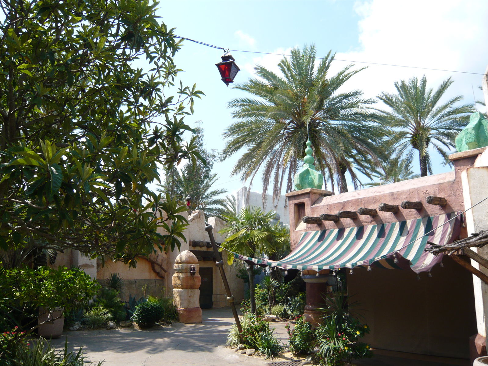 Die Mainstreet des Parks, Port of Entry, ist sehr eindrücklich und detailverliebt als eine Art orientalische Handelsstadt gestaltet. Das bereits in den Studios für gut befundene hohe Gestaltungslevel wird hier also schon mal nahtlos fortgesetzt. Man fühlt sich echt gleich wie in eine andere Welt versetzt. Ganz getreu dem Begrüssungsspruch über dem Eingangsbogen heisst es nun also: "The adventure begins..."