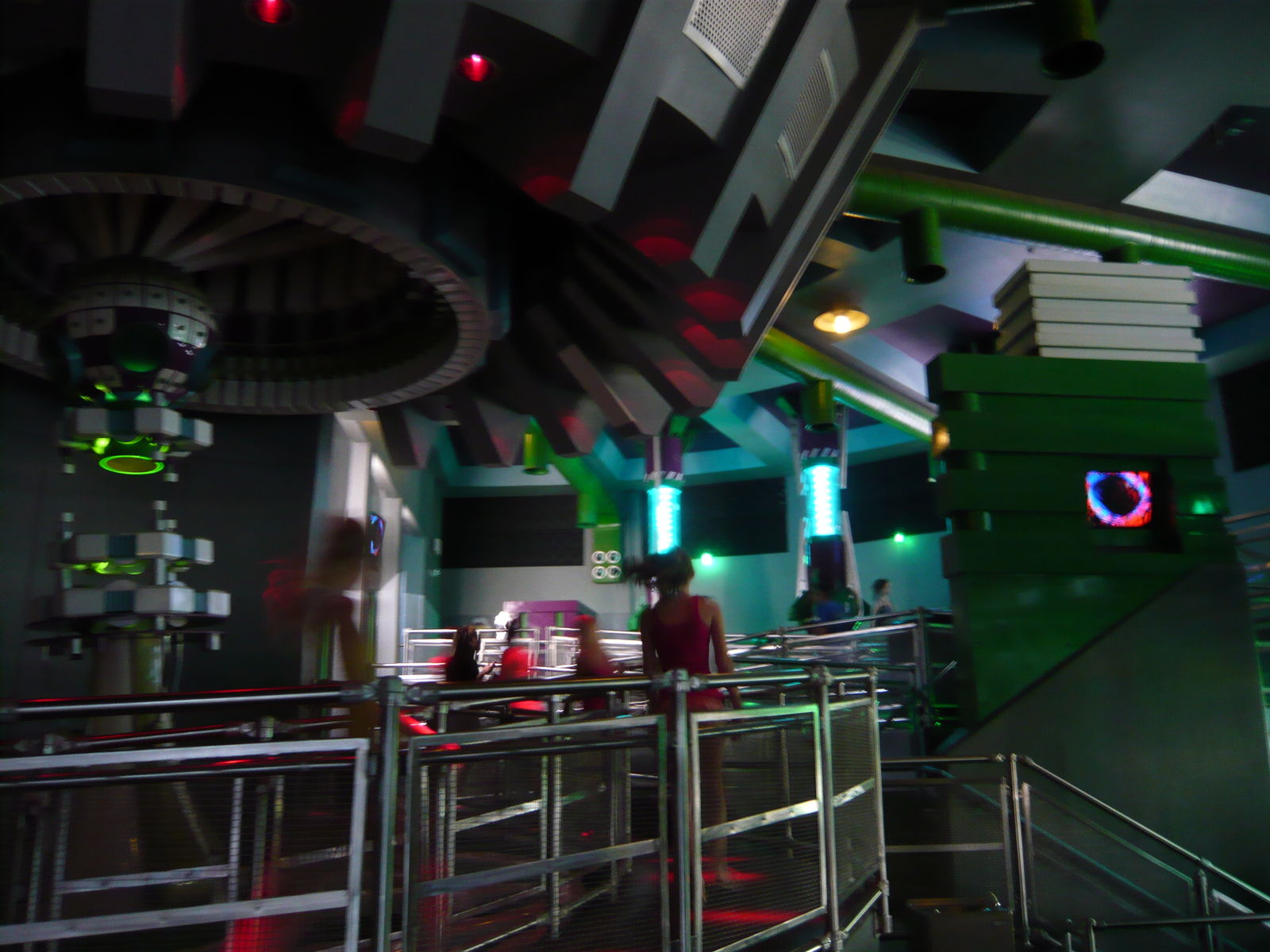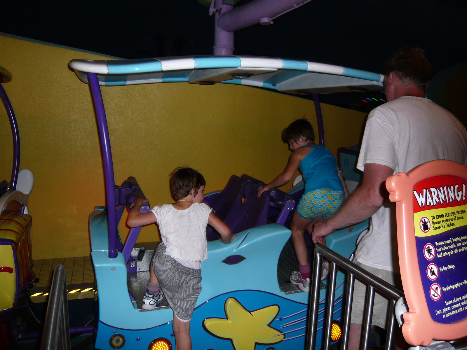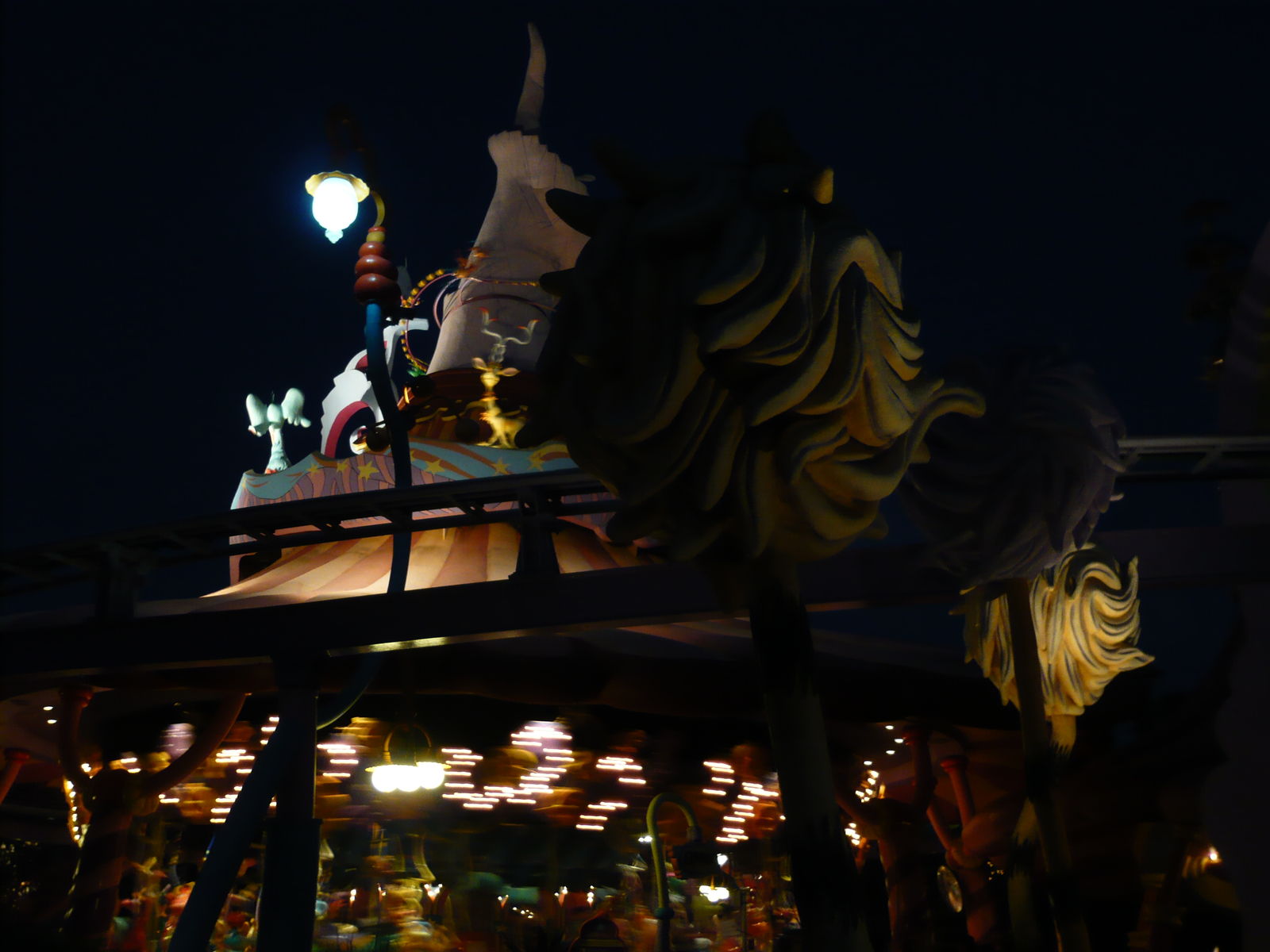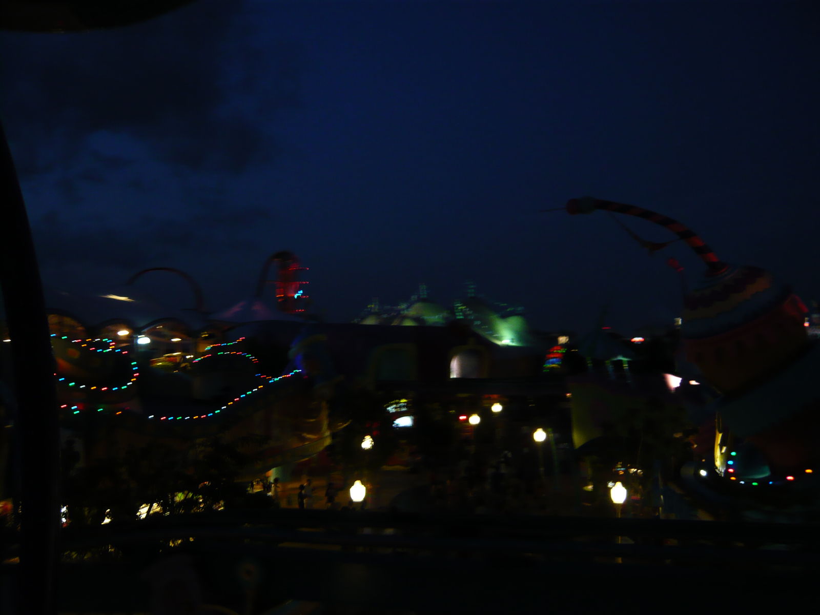 Bei unserem Besuch ist sie den ganzen Tag über zumindest einspurig gelaufen, um diese Zeit des Abends ist dann auch die Warteschlange auf ein annehmbares Mass zurück geschrumpft. Das Cruisen über den beim Einnachten sehr hübsch beleuchteten Themenbereich, begleitet von Seuss-Reimen und einem sehr seltsamen Alphabet-Spiel ("