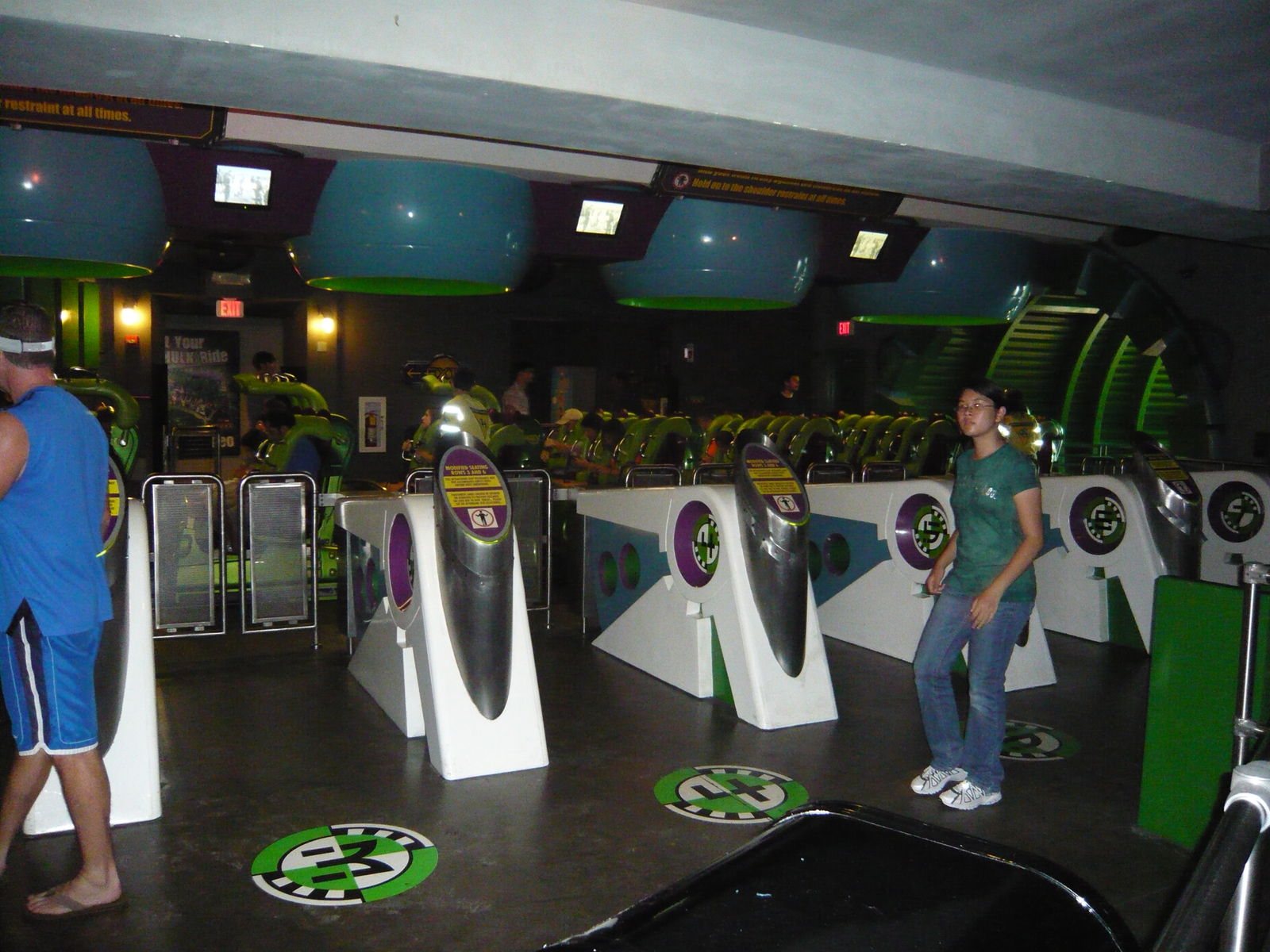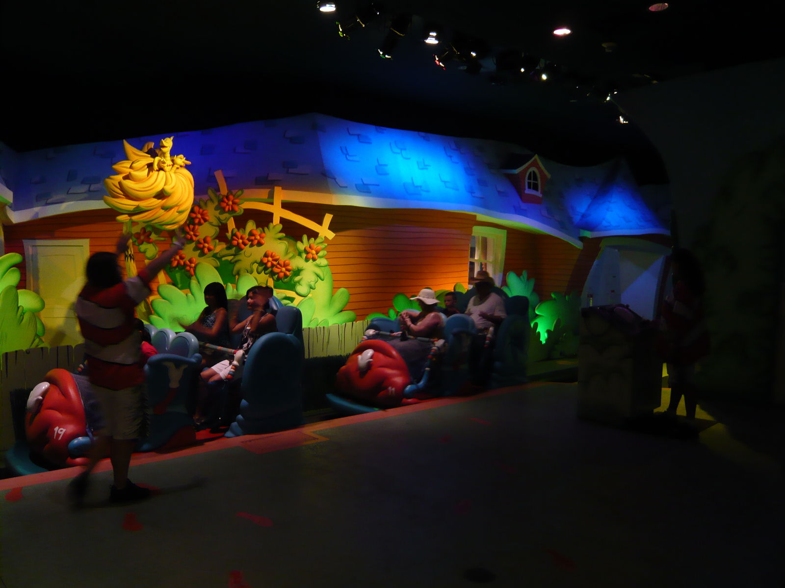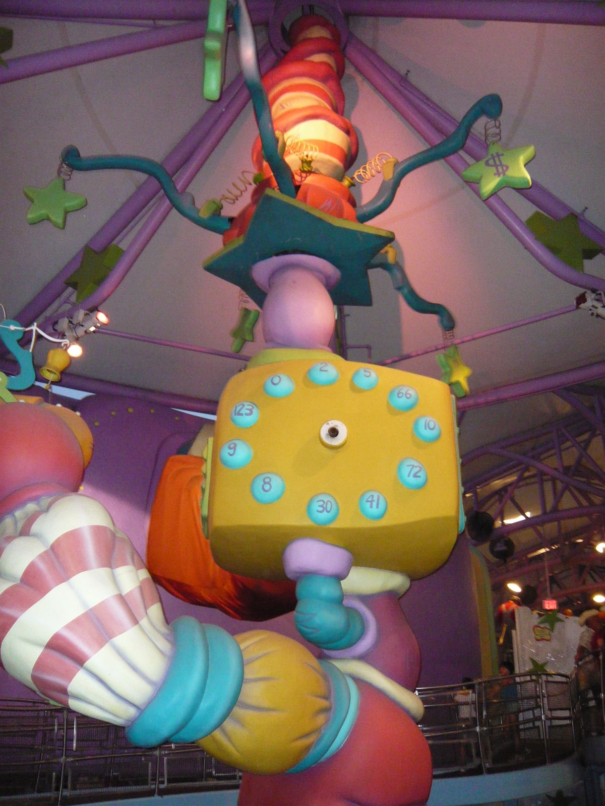 Die Hauptattraktion ist hier der Darkride Cat in the Hat. 30 Minuten Wartezeit waren angesagt, aber in dieser liebevoll gestalteten und angenehm klimatisierten Queue vergingen die wie im Flug. In den unten abgebildeten Viererwagen wird man danach durch eine Vielzahl absolut lustig gemachter Szenen aus dem bekannten Kinderbuch befördert. Schön, bunt und sehr anschaulich wird hier die Geschichte des Katers nacherzählt, der bei zwei allein daheim gelassenen Kindern vorbeischaut und sie zu heillosem Chaos anstiftet. Passend zur jeweiligen Szene werden per Lautsprecher auch die entsprechenden Reime eingespielt. So hat das Ganze für die Kleinen einen sehr guten Wiedererkennungswert, die Grossen erfreuen sich ab der wirklich enorm detailverliebten und lustigen Gestaltung der einzelnen Szenen. Passend zum zunehmenden Chaos wird auch die Drehung der Gondeln gegens Finale hin immer schneller. Nach einem Unfall, bei dem ein Kind hier offenbar aus dem Fahrzeug geschleudert worden ist, wurden alle Vorderseiten der Sicherheitsbügel mit einem grossen Netz überspannt. Angeblich wurde auch die Drehgeschwindigkeit recht stark gedrosselt, aber das kann ich natürlich nicht beurteilen. Jedenfalls sollte man dies nicht einfach als Kinderbahn abtun. Unbedingt mitfahren!