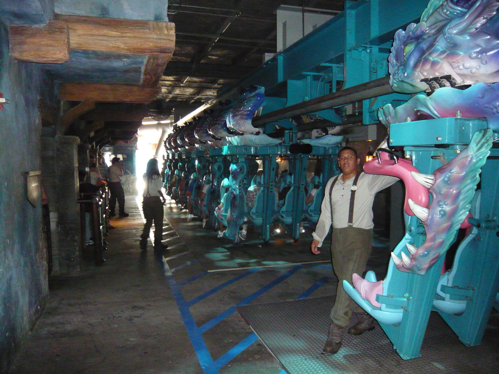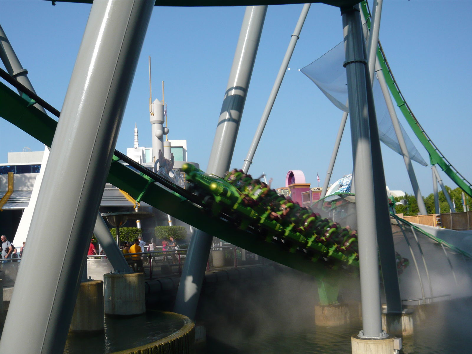 Wie soll man Harry Potter nur beschreiben? Im Prinzip sitzt man mit Schulterbügeln gesichert und frei baumelnden Beinen in an Roboterarmen aufgehängten Vierergondeln, die sich so ziemlich in alle Richtungen bewegen können. Ähnlich wie bei Spiderman wird man dann an zahlreichen 3D-Szenen auf riesigen Leinwänden vorbei geführt. Auch hier gibt es dann noch unzählige Effekte und Objekte vor und neben den grossen Leinwänden, die abgestimmt auf die gezeigten Bilder die Illusion komplettieren. Zusammen mit den mitunter echt heftigen Bewegungen der Gondeln entsteht ein ganz gewaltig eindrückliches Gesamterlebnis, bei dem man schlicht