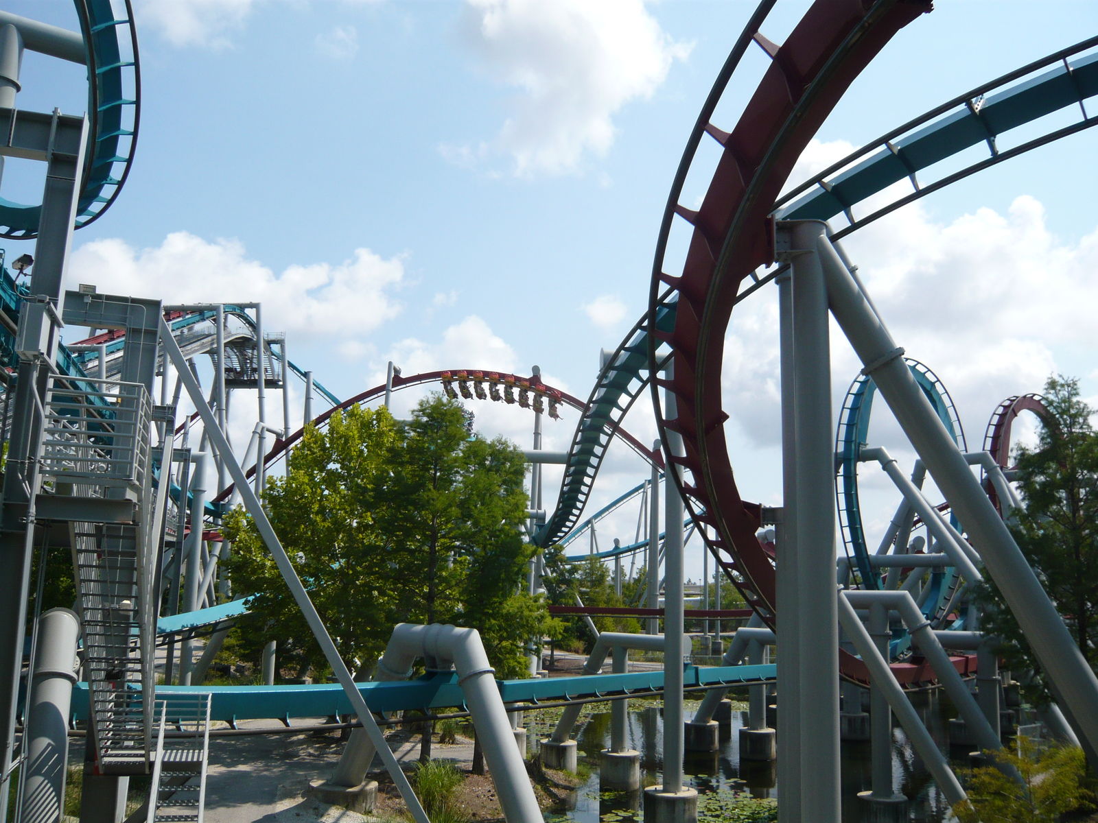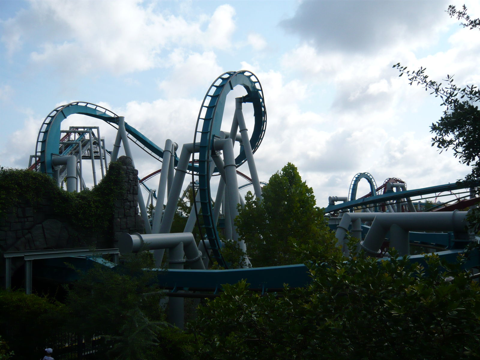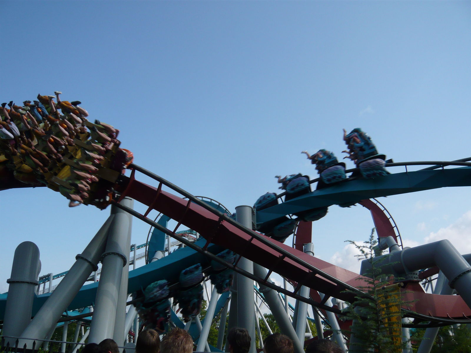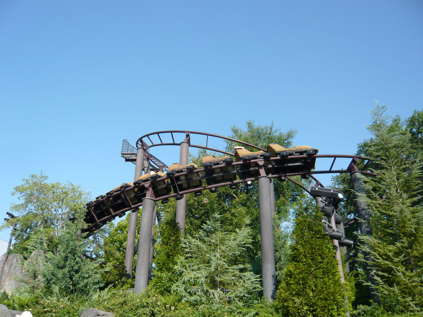 Looping über Wasser sind wunderbar zu fahren, komplettiert wird das Ganze mit zeitgleich zur Zugdurchfahrt hochschiessenden Fontänen und einem unter den Zugangsweg hinab führenden Dampftunnel. Danach umrundet man in luftiger Höhe die Startröhre, schlängelt sich hierauf durch einen dort oben anfangenden und dann tief hinunter führenden