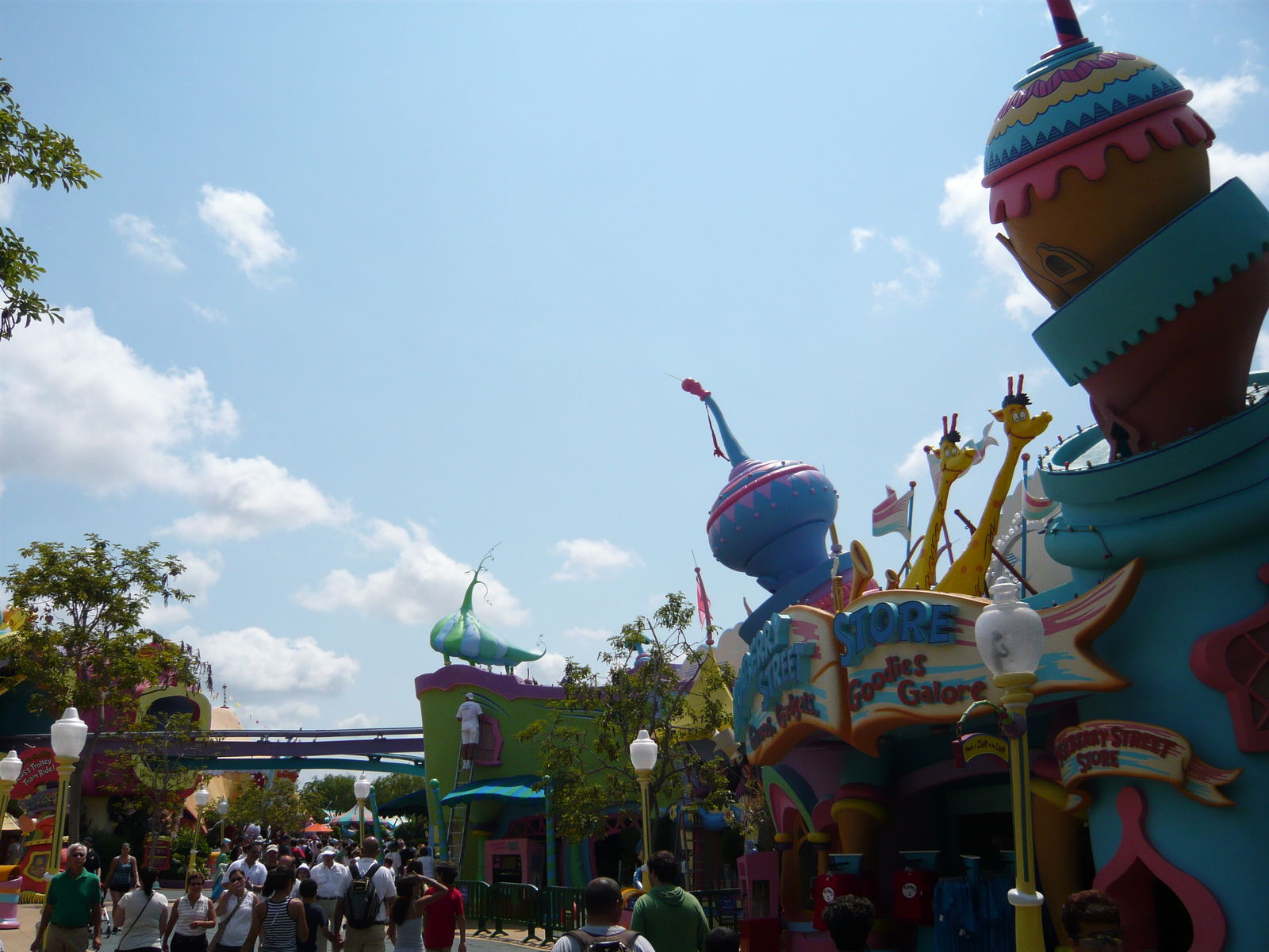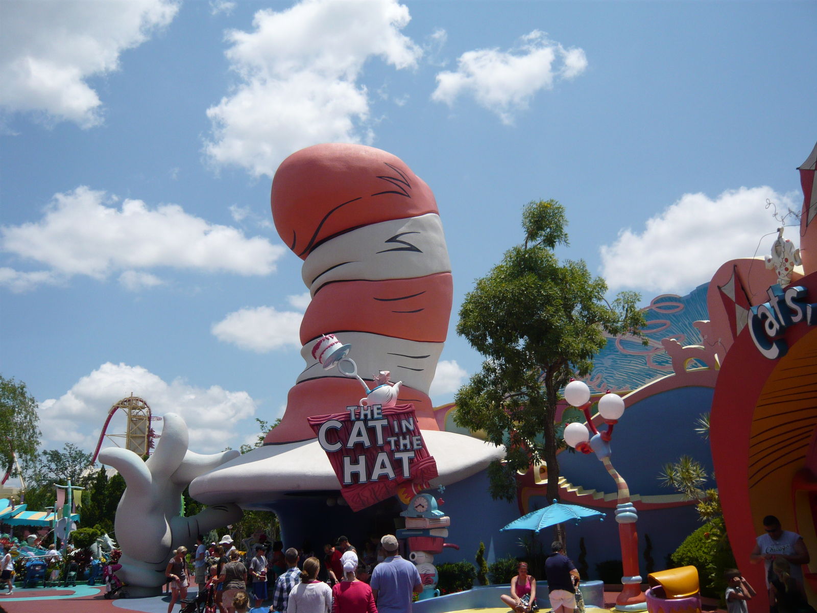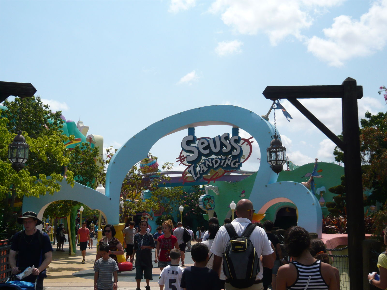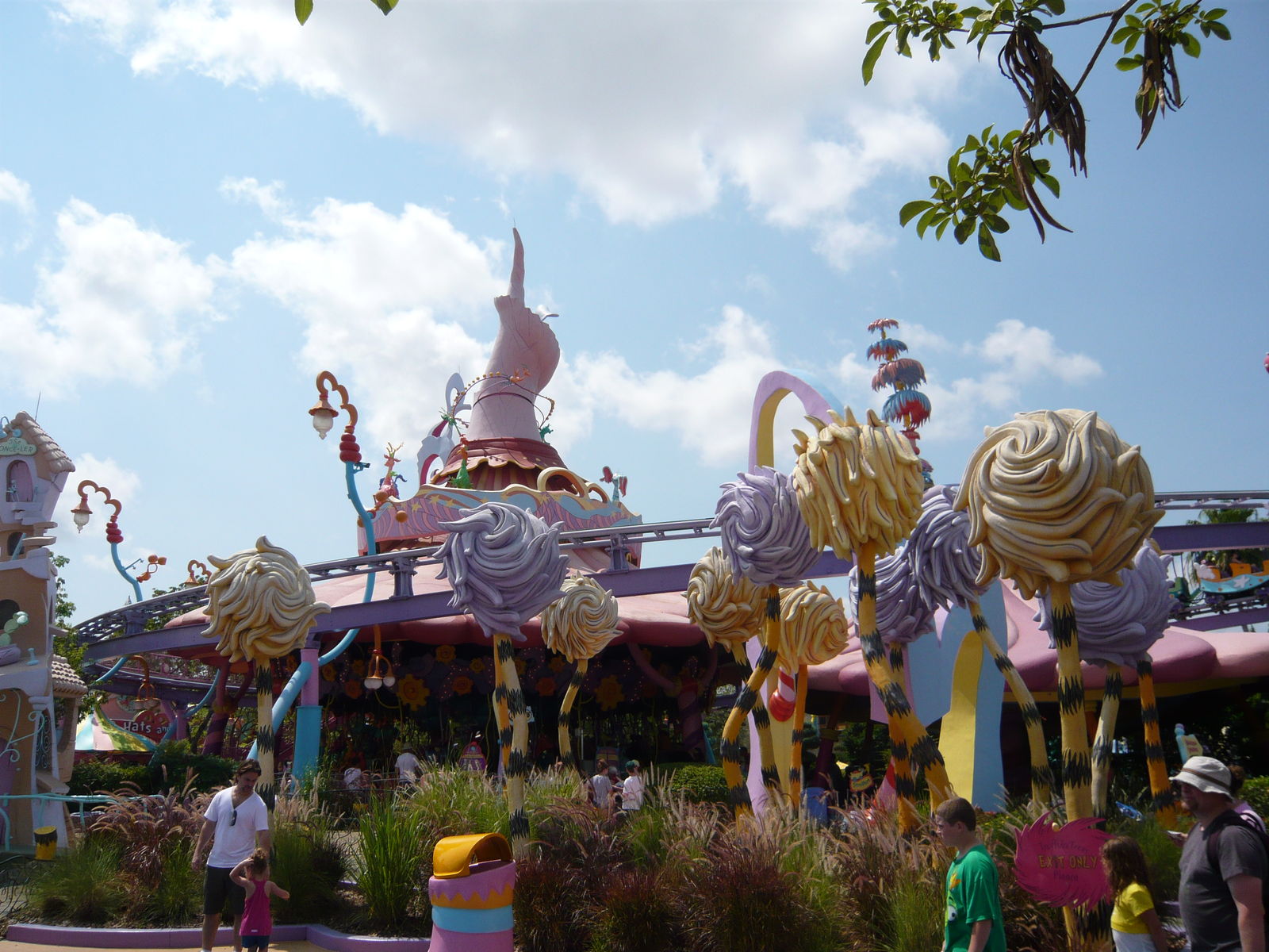 Schliesslich ist der Parkrundgang im Themenbereich Seuss Landing abgeschlossen. Hier sind sämtliche Attraktionen nach Geschichten und Figuren des bekannten Kinderbuchautoren Dr. Seuss mit seinen charakteristischen Reimmustern gestaltet. Alles ist schräg, cartoonhaft, quietschbunt und sehr originell thematisiert!