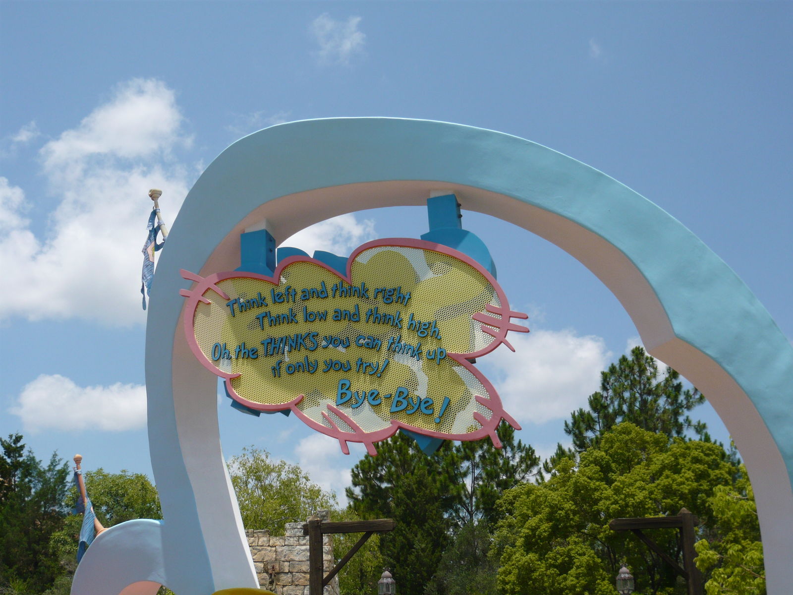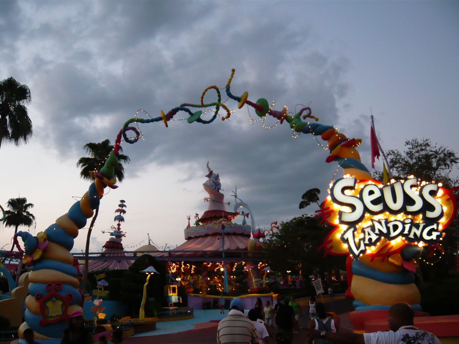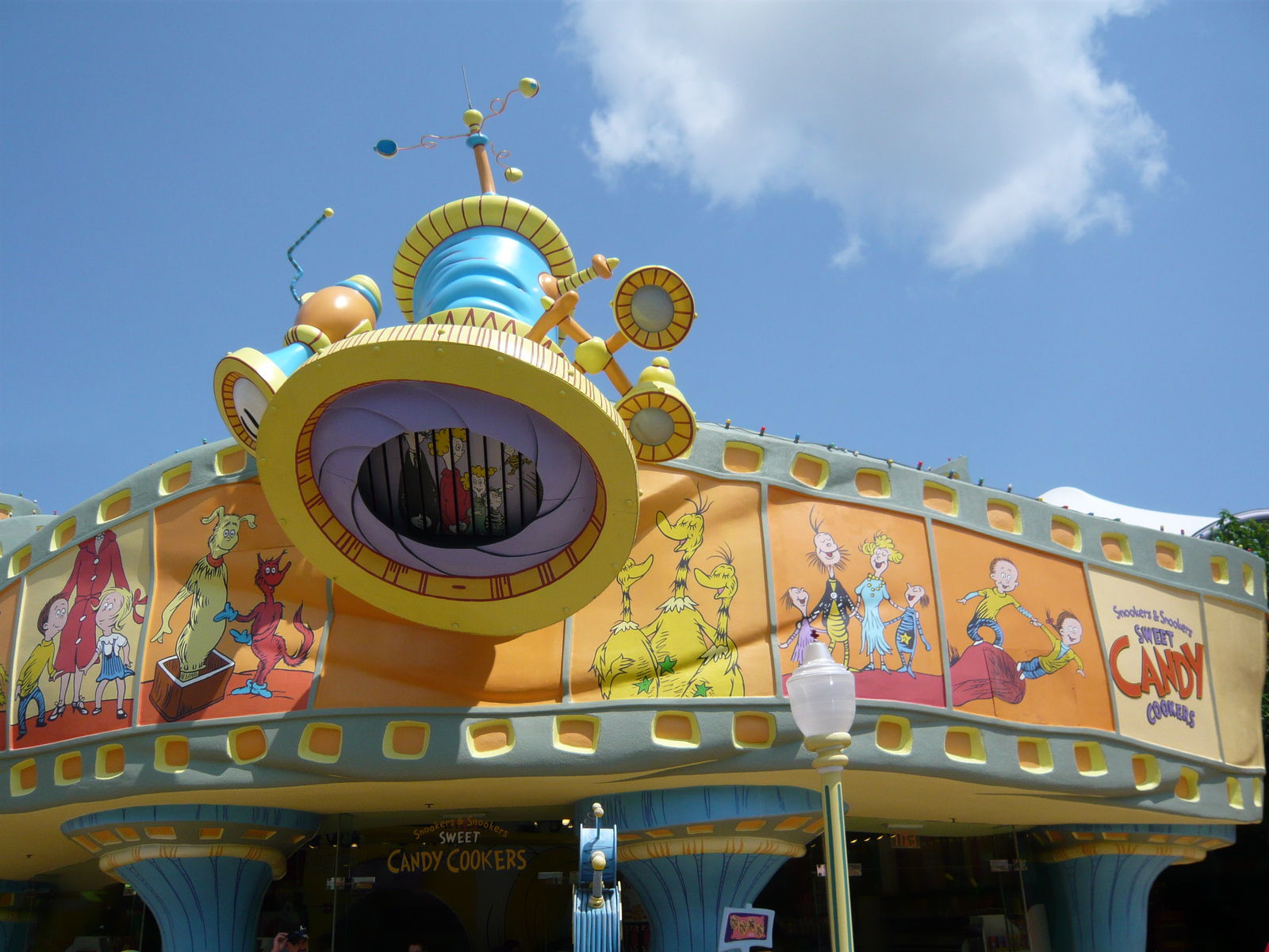 Schliesslich ist der Parkrundgang im Themenbereich Seuss Landing abgeschlossen. Hier sind sämtliche Attraktionen nach Geschichten und Figuren des bekannten Kinderbuchautoren Dr. Seuss mit seinen charakteristischen Reimmustern gestaltet. Alles ist schräg, cartoonhaft, quietschbunt und sehr originell thematisiert!