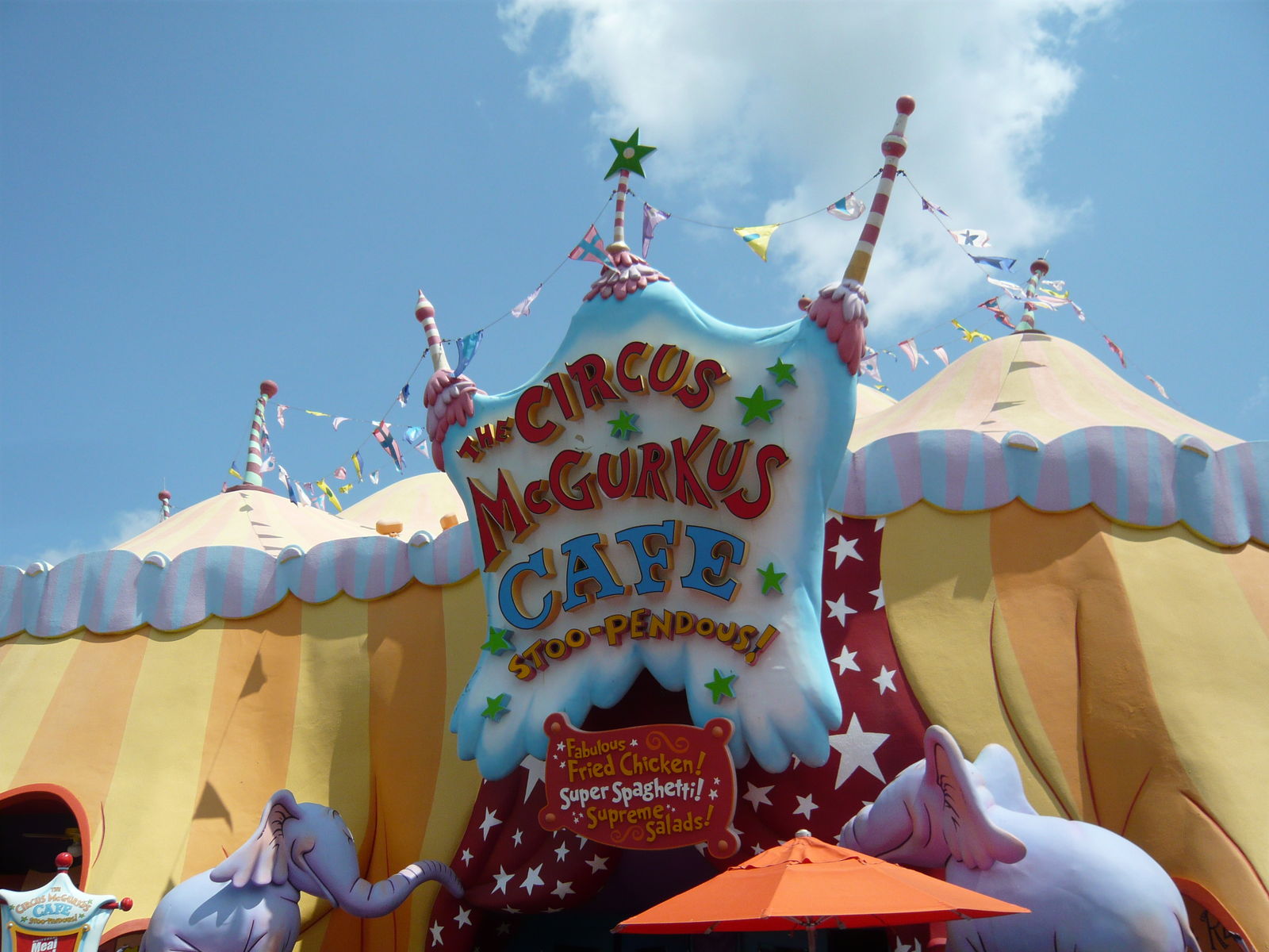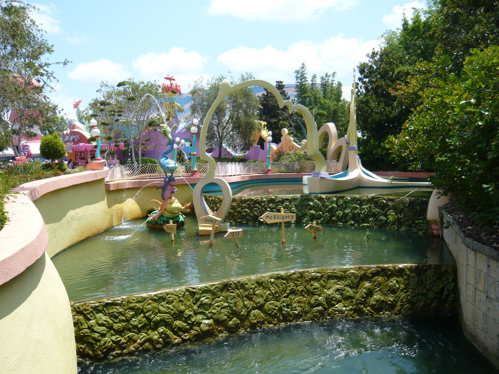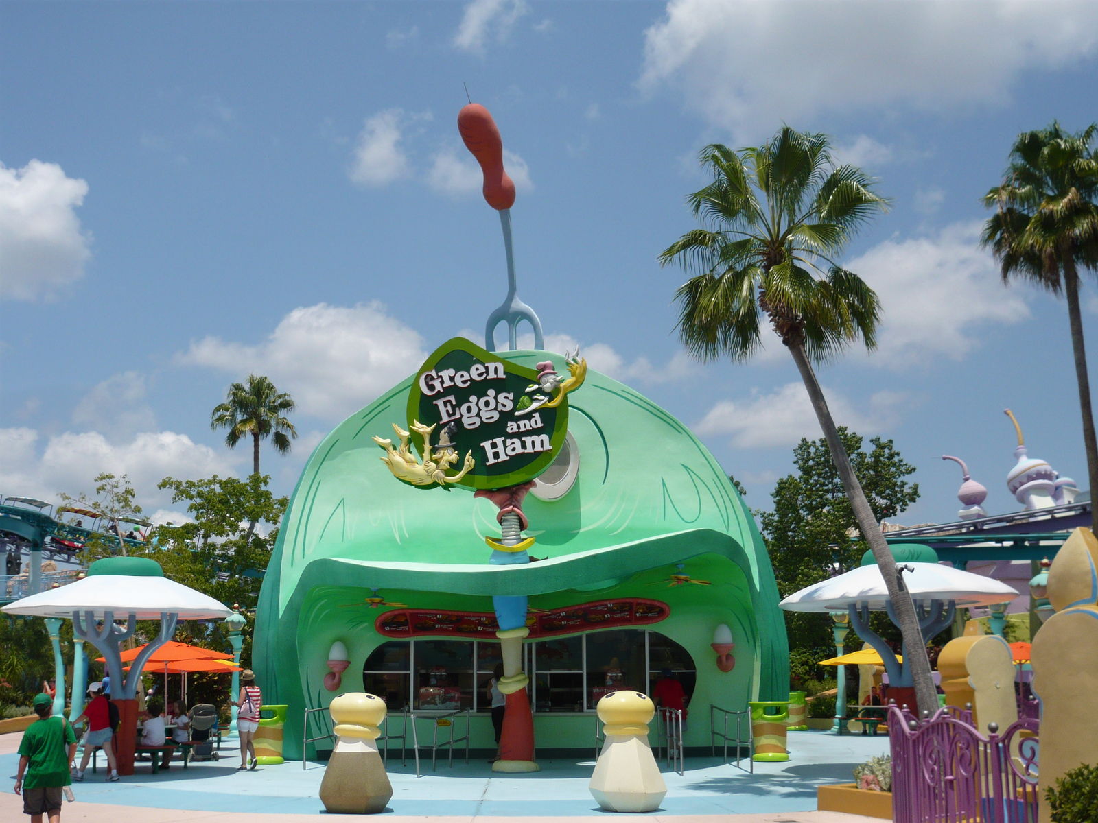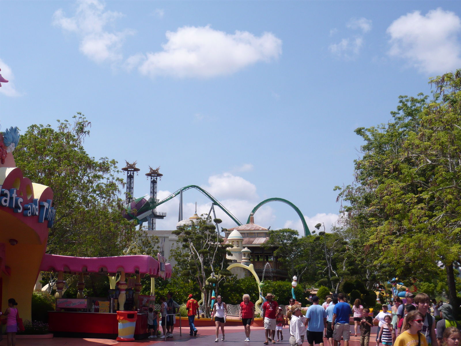 Schliesslich ist der Parkrundgang im Themenbereich Seuss Landing abgeschlossen. Hier sind sämtliche Attraktionen nach Geschichten und Figuren des bekannten Kinderbuchautoren Dr. Seuss mit seinen charakteristischen Reimmustern gestaltet. Alles ist schräg, cartoonhaft, quietschbunt und sehr originell thematisiert!