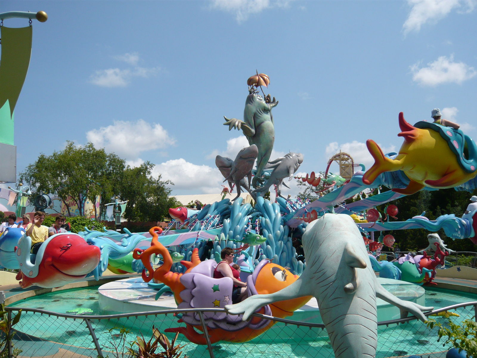 Die Fahrgeschäfte haben entsprechend zu den berühmten Kinderversen geradezu unaussprechliche oder sehr eigenartige Namen. Soweit wir das beobachten konnten, musste man bei diesem Rundfahrgeschäft mit dem Namen One Fish, Two Fish, Red Fish, Blue Fish die Fahrhöhe der Gondeln passend zur parallel abgespielten Kinderlied-Melodie ändern, sonst wird man als Bestrafung nassgespritzt.
