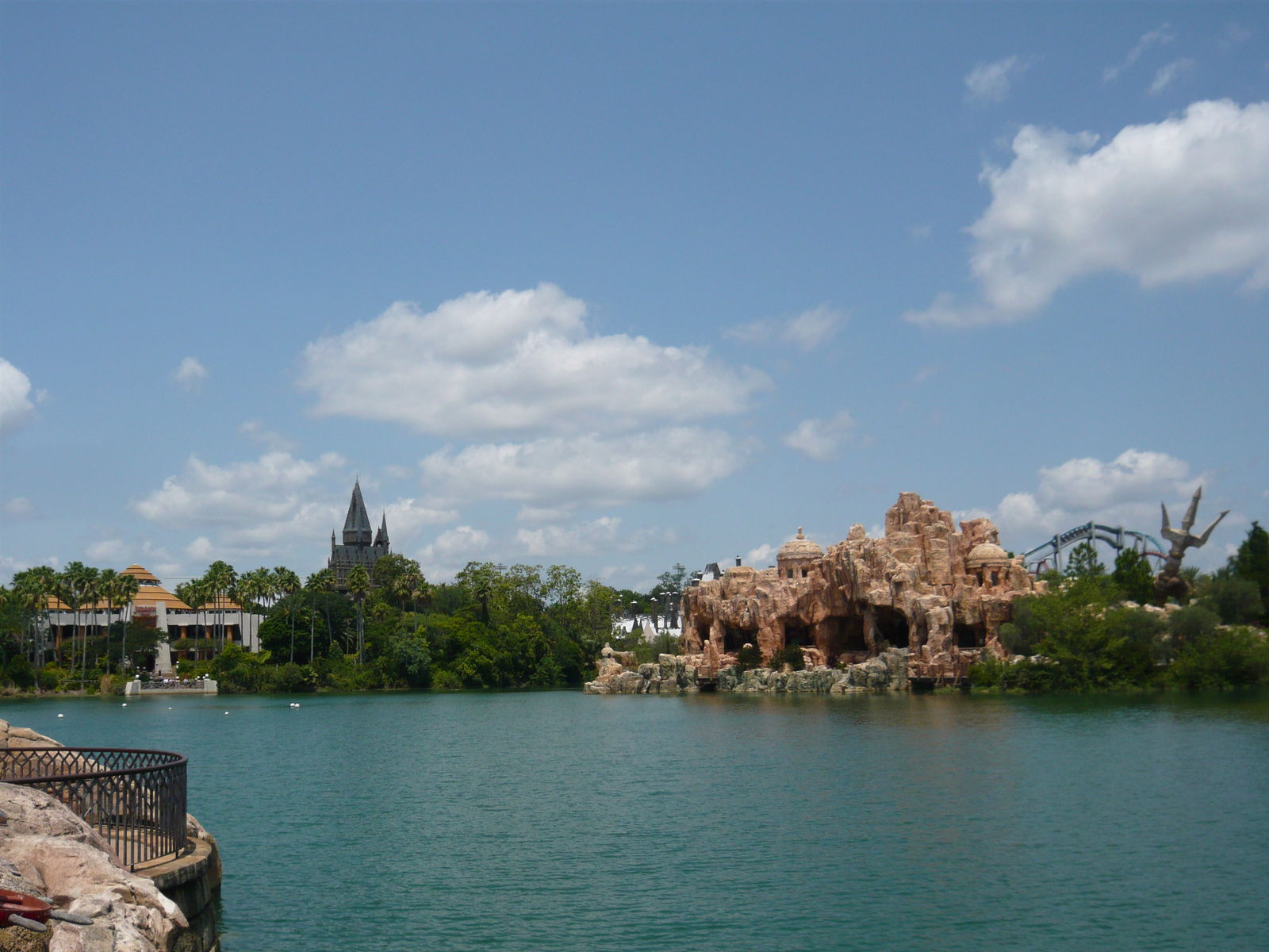 Nach einem kurzen Stopp bei den Schliessfächern konnten wir beobachten, wie sich praktisch die gesamte Besuchermasse am Ende von Port of Entry nach rechts, im Gegenuhrzeigersinn um den See in der Parkmitte rum bewegte, auf direktem Wege zu Harry Potter. Hatten wir natürlich ursprünglich auch vorgehabt, aber nach links, in die andere Richtung, sah es dann doch verlockend leer aus. Irgendwie haben wir uns gedacht, dass wir so rum zwar weiter laufen müssen, wir aber dank leerer Wege sicherlich schneller vorankommen würden. Also sind wir dann tatsächlich links abgebogen und haben uns schon einmal zu einem Sprint bereit gemacht. Der schon um diese Uhrzeit brutal runterbrennende Florida-Sonnenschein und geradezu unmöglich kurze Wartezeiten an den sich hier befindlichen Attraktionen haben dem Ganzen aber einen Strich durch die Rechnung gemacht - die Überwältigung des Erstbesuchs war dann einfach zu gross. Sollte aber im Nachhinein betrachtet nicht nur zu unserem Nachteil sein!