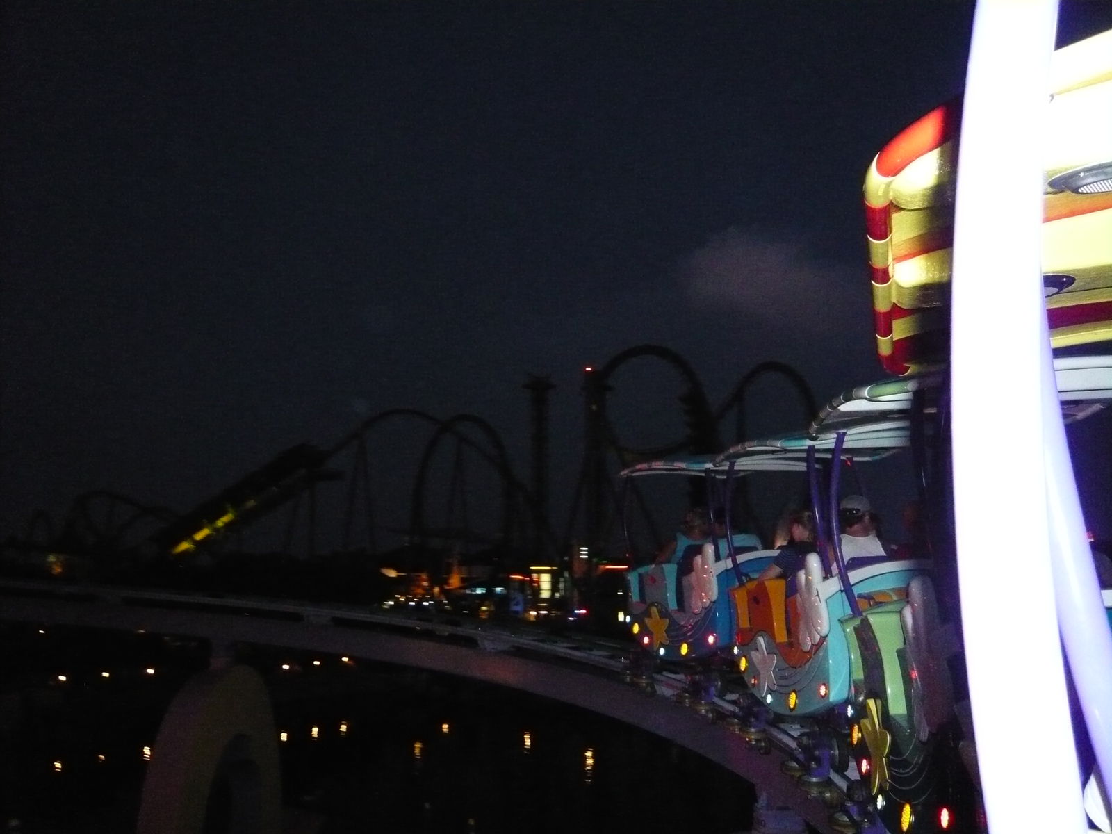 Inzwischen waren wir alles Wichtige mindestens einmal gefahren und sind in den Eingangsbereich zurück gewandert, um uns wieder umzuziehen. Der Kollege bemerkte aber richtigerweise, dass wir noch die Gelegenheit dazu hatten, einen recht selten zu fahrenden Ride im Seuss Landing-Bereich mitzunehmen: eine doppelspurige Monorail mit dem wohlklingenden Namen The High in the Sky Seuss Trolley Train Ride. Ursprünglich sollte die Attraktion unter der ebenso prägnanten Bezeichnung Sylvester McMonkey McBean's Very Unusual Driving Machines zusammen mit dem Park 1999 öffnen. Offenbar haben jahrelange technische Probleme dazu geführt, dass die Schienen komplett neu gebaut und die Fahrzeuge ausgetauscht werden mussten. So eröffnete sie erst 2006, schloss aber zwischendurch auch immer mal wieder für längere Zeit.