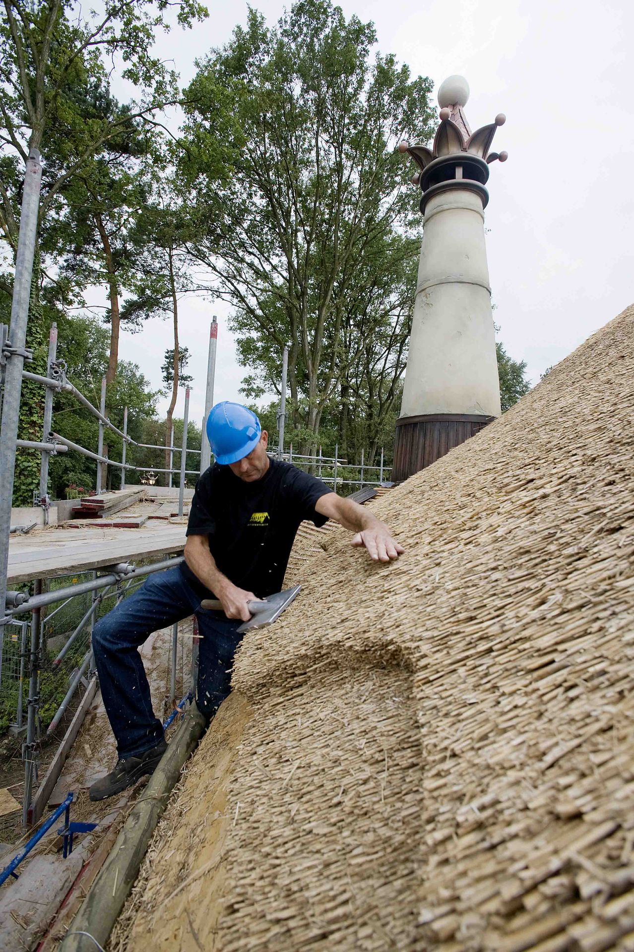 Kaatsheuvel/Efteling. Efteling, der größte niederländische Familienfrei-zeitpark, wächst - und mit ihm zurzeit das neue, thematisierte Pfannkuchen-Restaurant „Polles Küche“. Nun ist das Dach schon fertig gestellt: Reet, Kupfer- und Holzziegel decken das Restaurant ab. Mit seinen 12,65 Meter hohen Türmen zieht „Polles Küche“ alle Blicke auf sich.