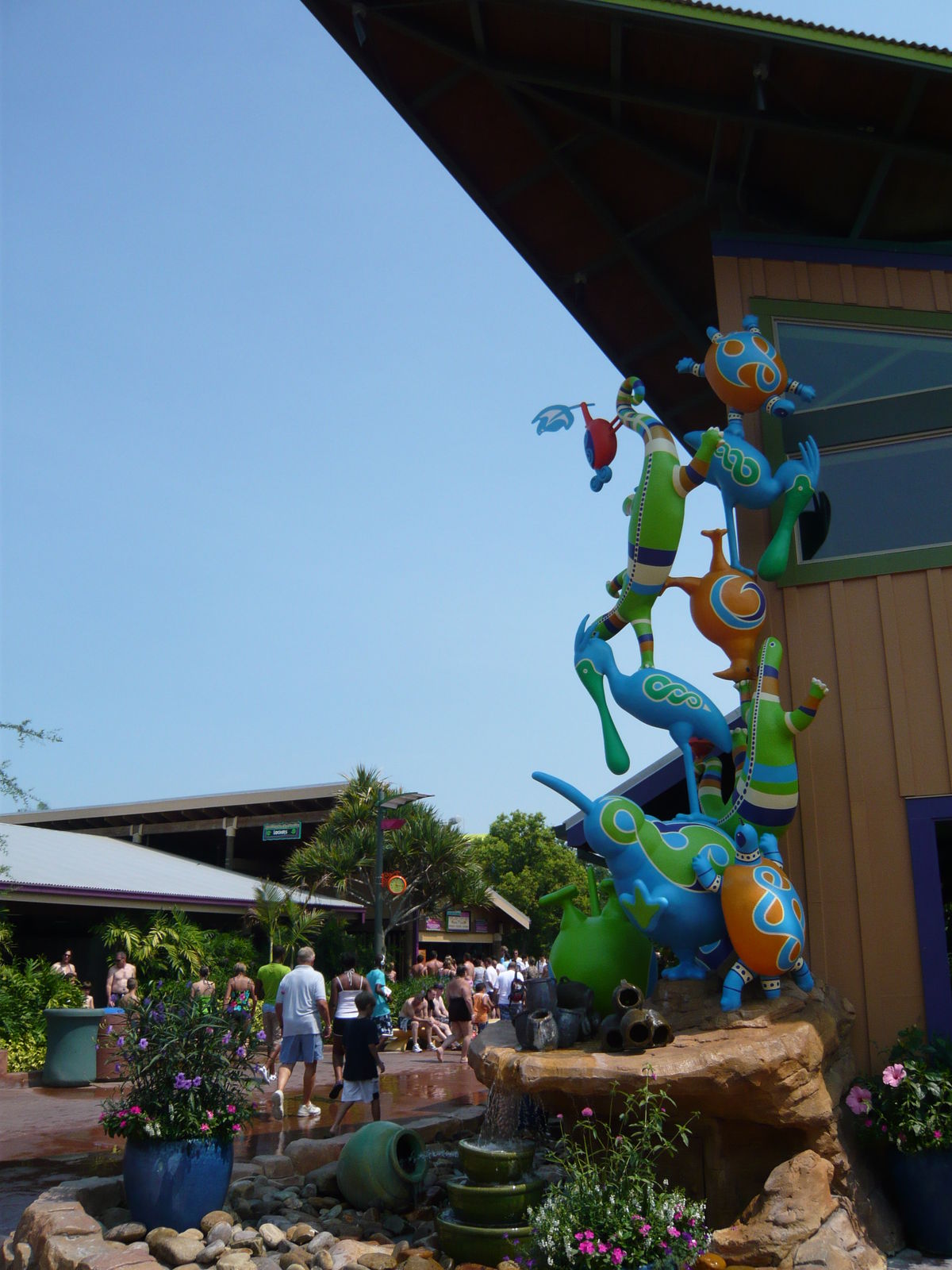 Pünktlich zur Öffnungszeit sind wir zusammen mit einer stattlichen Anzahl anderer Besucher am wirklich schön gestalteten Eingangsbereich eingetroffen. Es waren viele Schulbusse auf dem Parkplatz zu sehen, entsprechend hatten wir dann den Tag über auch mit Teenager-Horden zu kämpfen. Im Wesentlichen findet man hier am Eingang und auch im Rest des Parks eine hübsch anzusehende Mixtur aus Down-Under- und Südsee-Themeing vor. Alle Gebäude erinnern an Strandhütten und warten mit ozeanischen Architekturelementen auf, Schilder und Wegweiser enthalten Begriffe in australischem Englisch und die meisten Namen der Rutschen und Wasserattraktionen klingen auch sehr down-under-mässig.