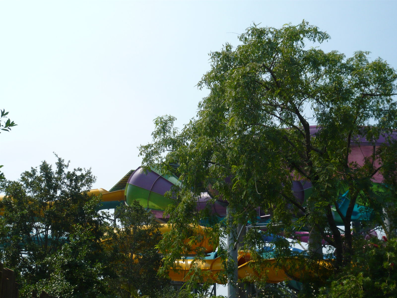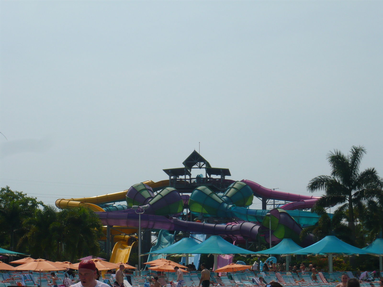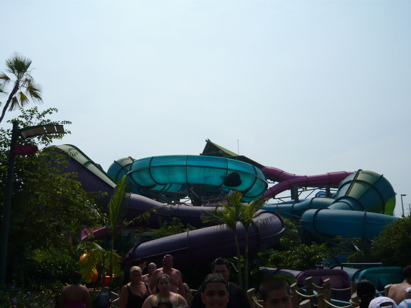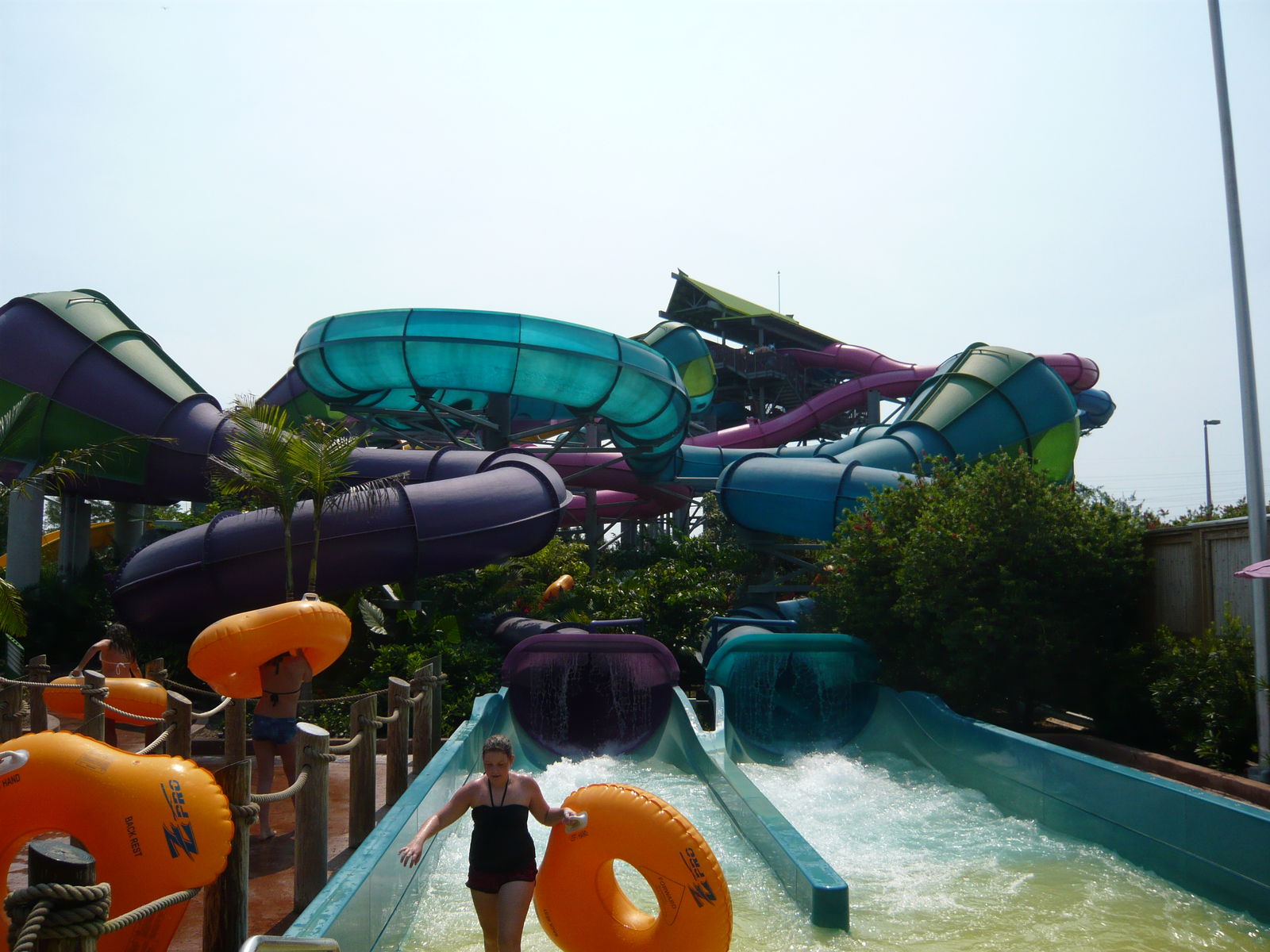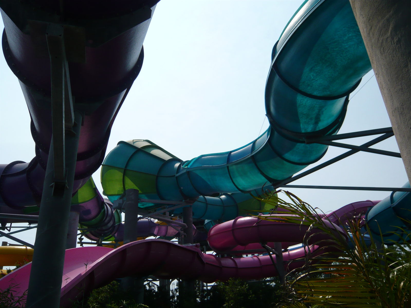musste, um zum Start der Trichterrutschen zu gelangen. Und da man auch hier nicht ohne Ring in den kaum hüfttiefen Fluss hinein darf, bildete sich eine gemeinsame, zehnminütige Schlange für Lazy River- und Rutschenbenutzer.