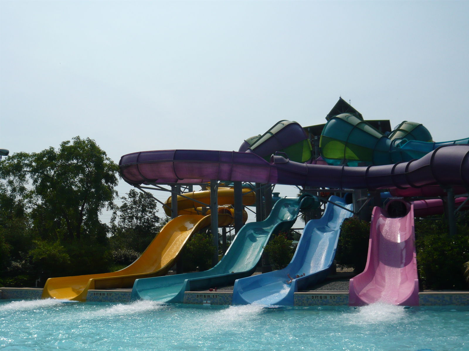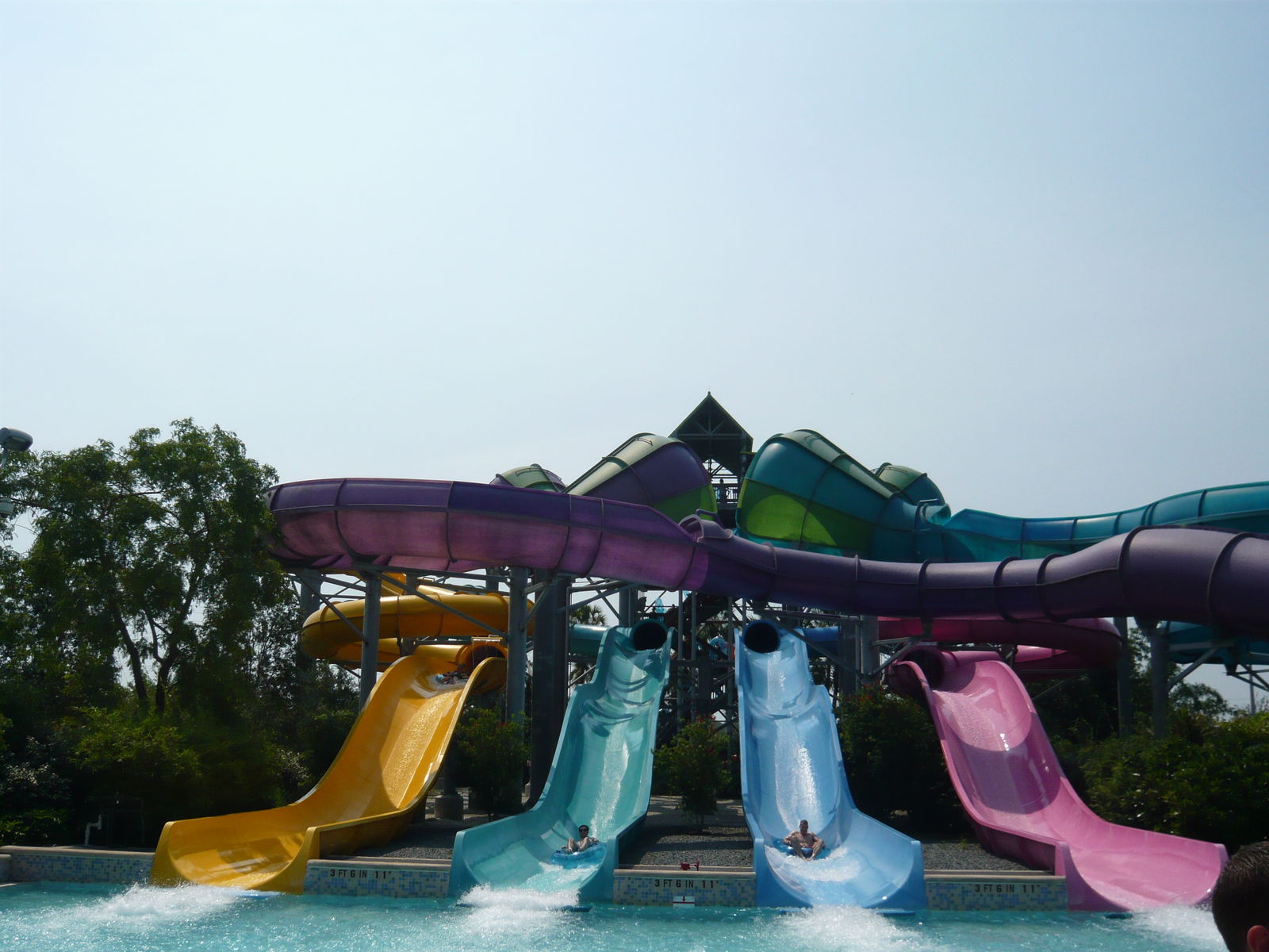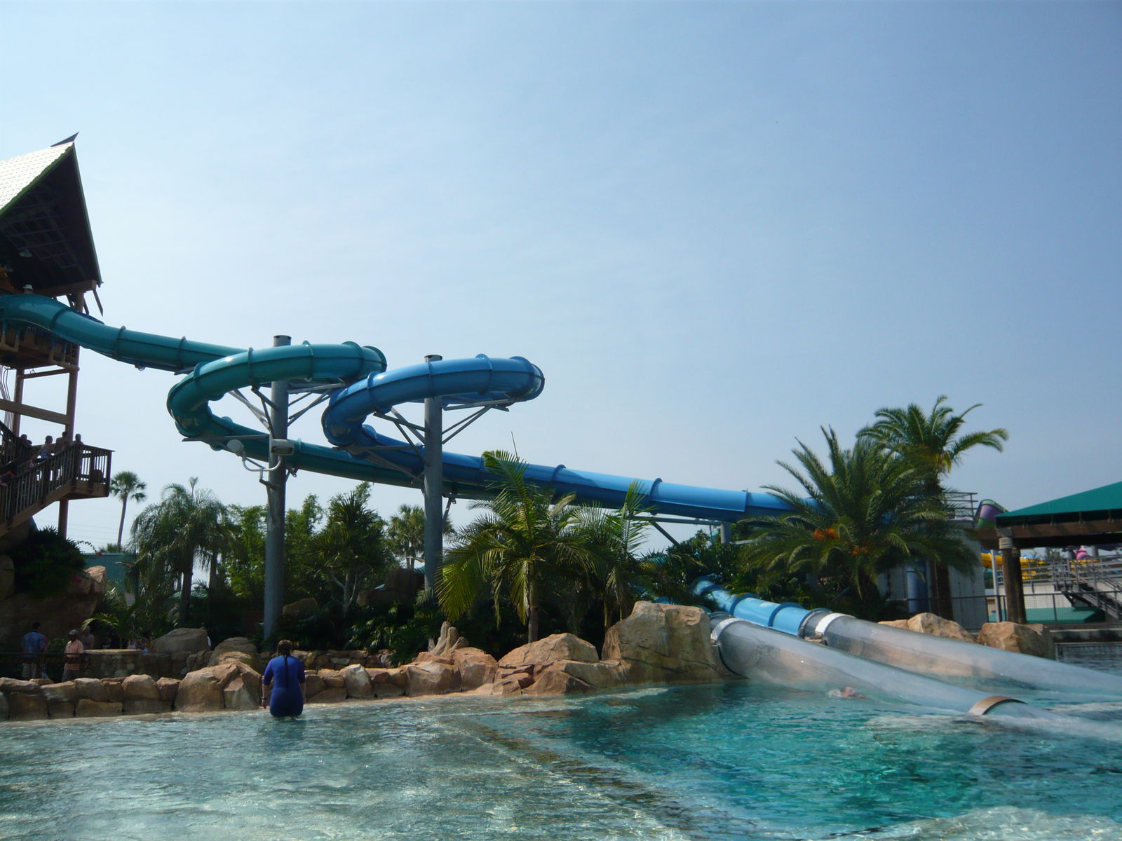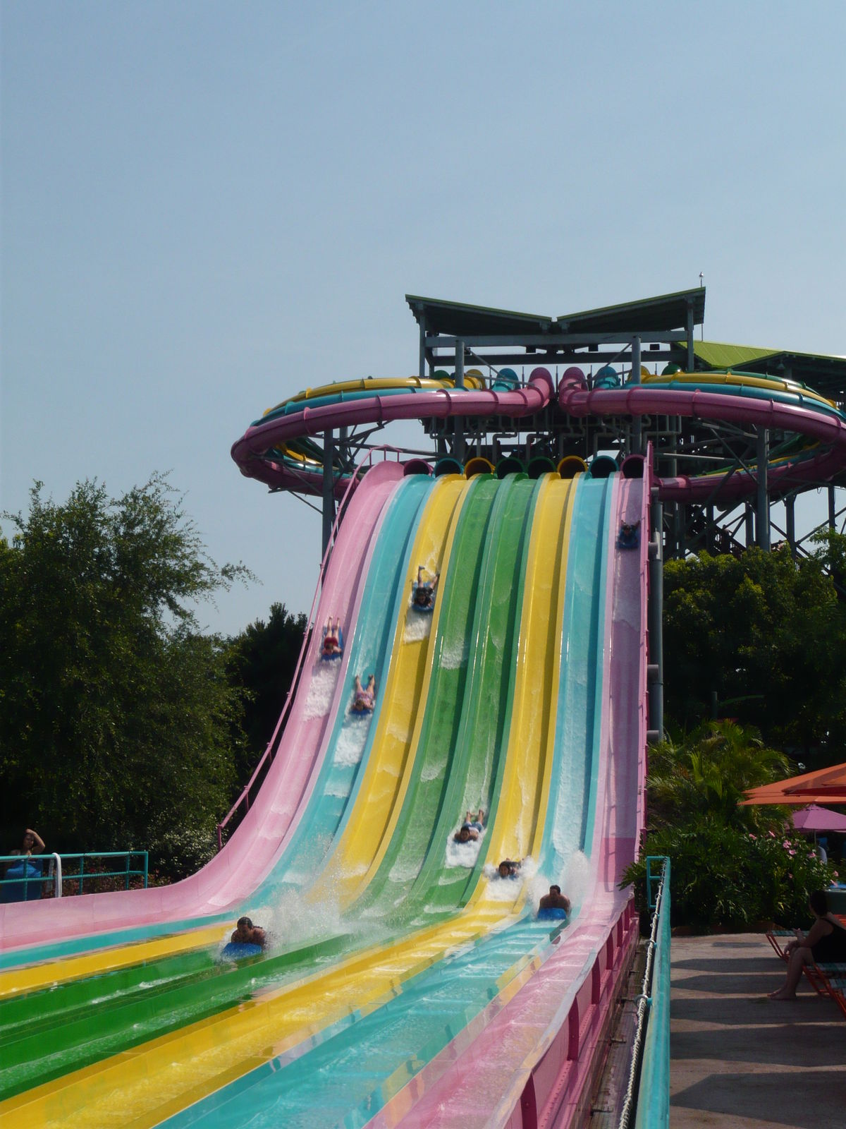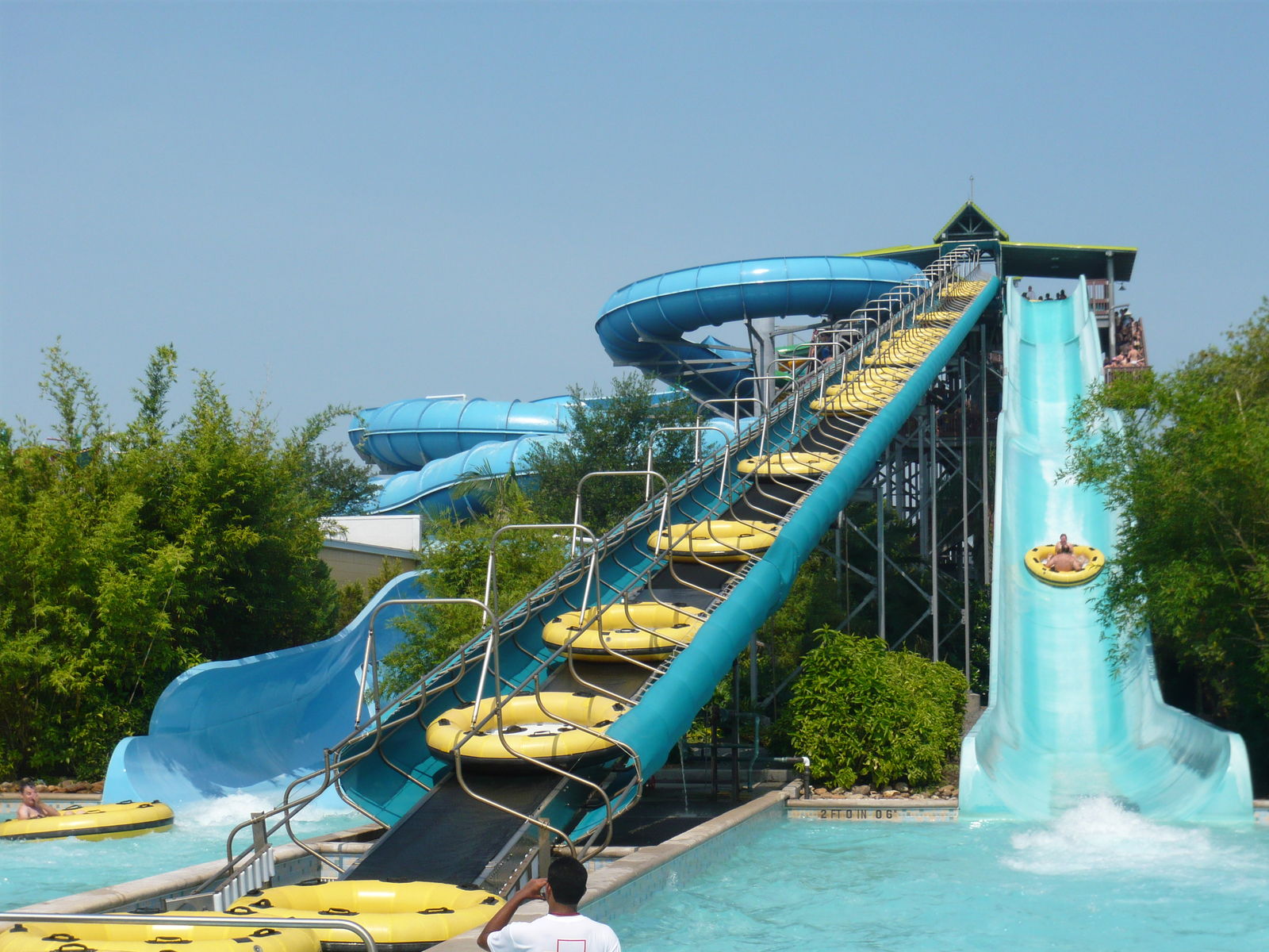 musste, um zum Start der Trichterrutschen zu gelangen. Und da man auch hier nicht ohne Ring in den kaum hüfttiefen Fluss hinein darf, bildete sich eine gemeinsame, zehnminütige Schlange für Lazy River- und Rutschenbenutzer.