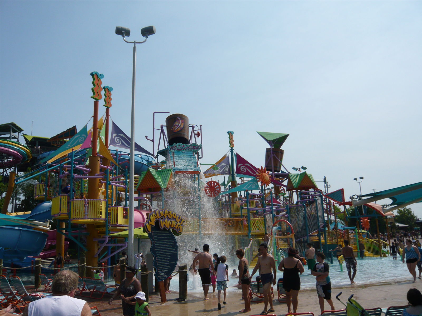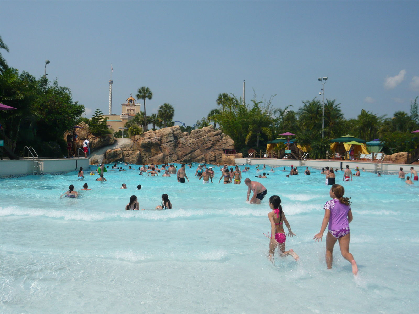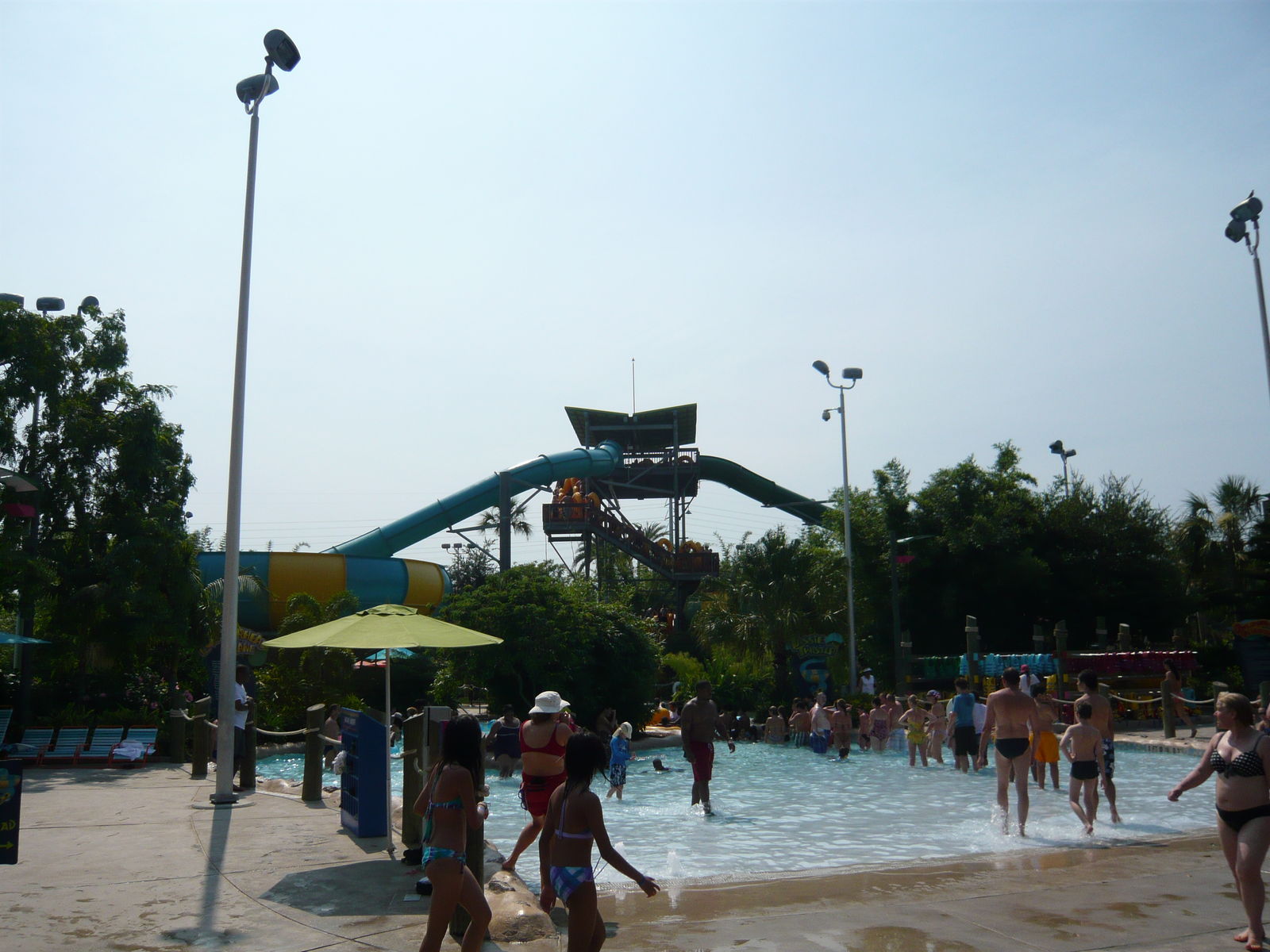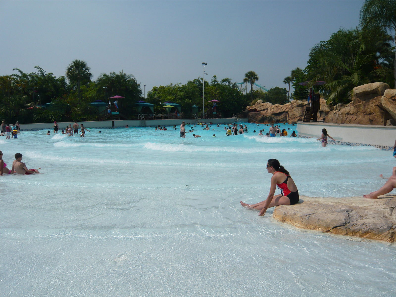 Weiterhin gibt es noch zwei direkt nebeneinander liegende Wellenbäder. Das eine hat laut Website ein wenig höhere Wellen, das andere kleinere. Wie so oft in den USA sind die Wellengänge an europäischen Verhältnissen gemessen aber in beiden Pools sehr seicht und unspektakulär. Ausserdem haben uns die Bademeister hier wieder enorm genervt: Als der eine Mitstreiter unseren Spindschlüssel etwas festzurren wollte und sich dabei für ein paar Sekunden am Beckenrand festhielt, wurde er energisch zurück gepfiffen. Dass wir nach all den Erlebnissen im Park nicht gleich noch ein freches "Screw you!" zurückgegeben haben, hat uns selbst am meisten gewundert - wir wären wohl bald soweit gewesen.