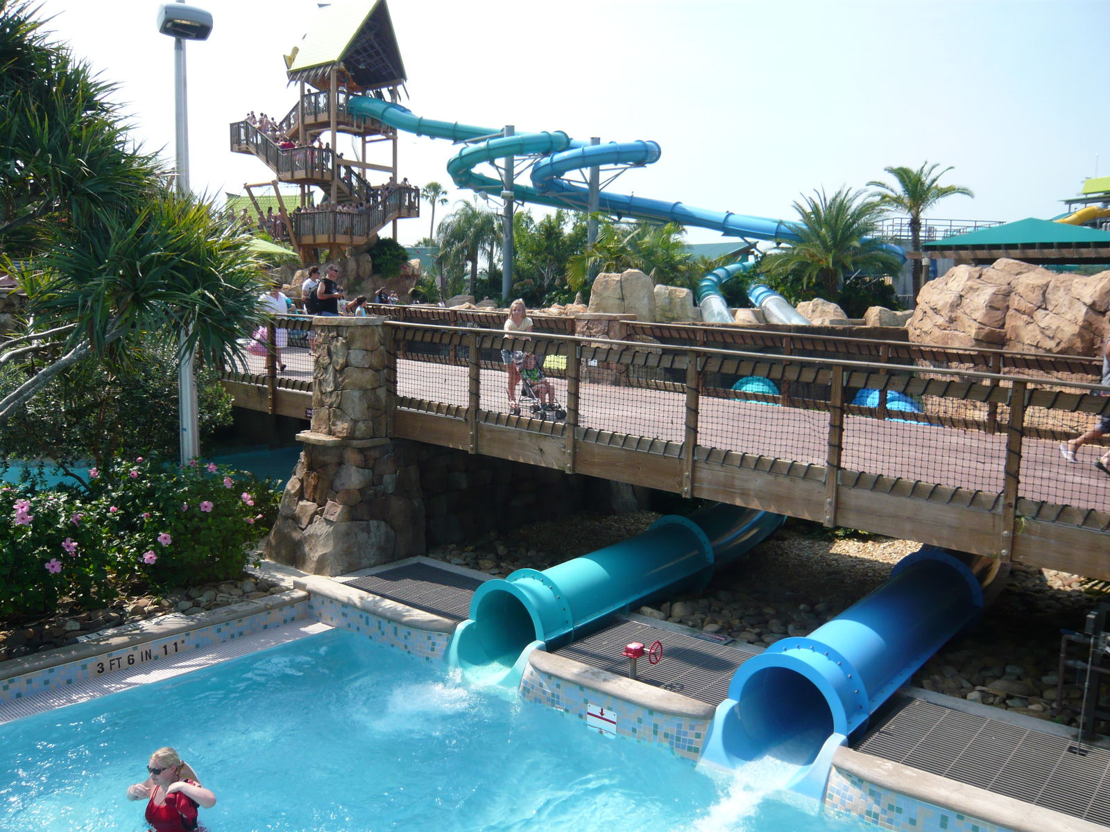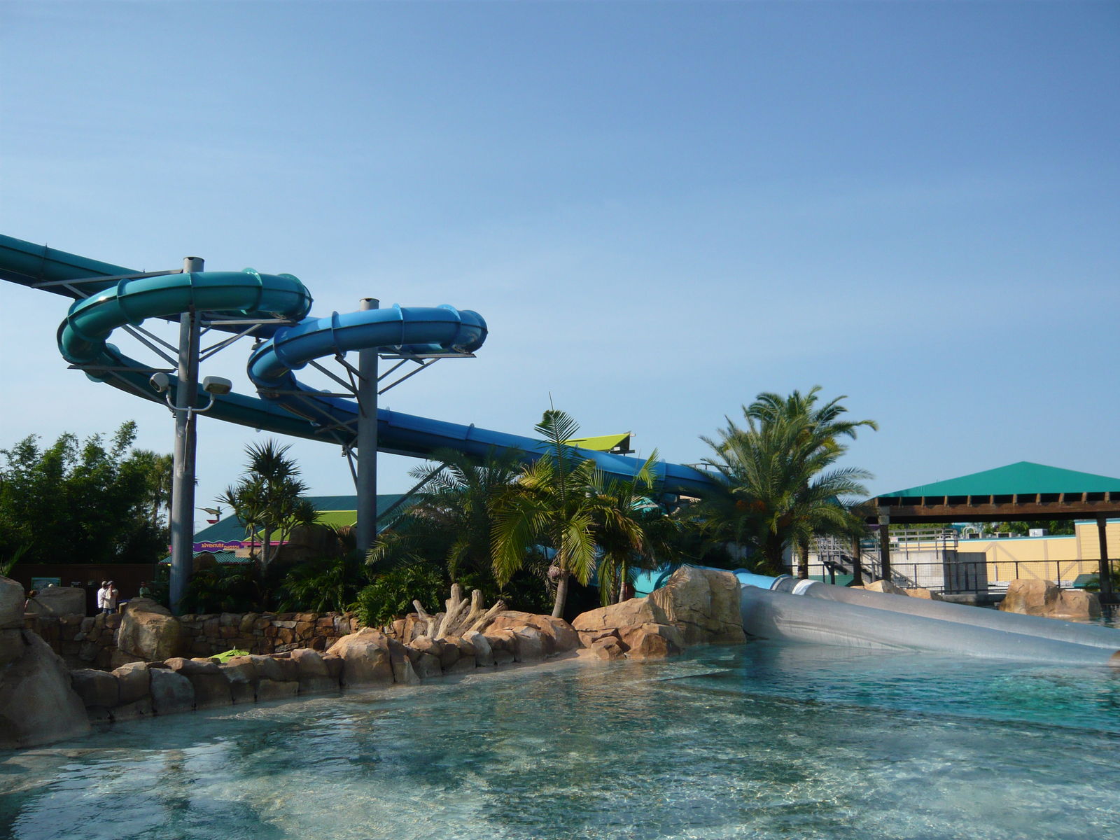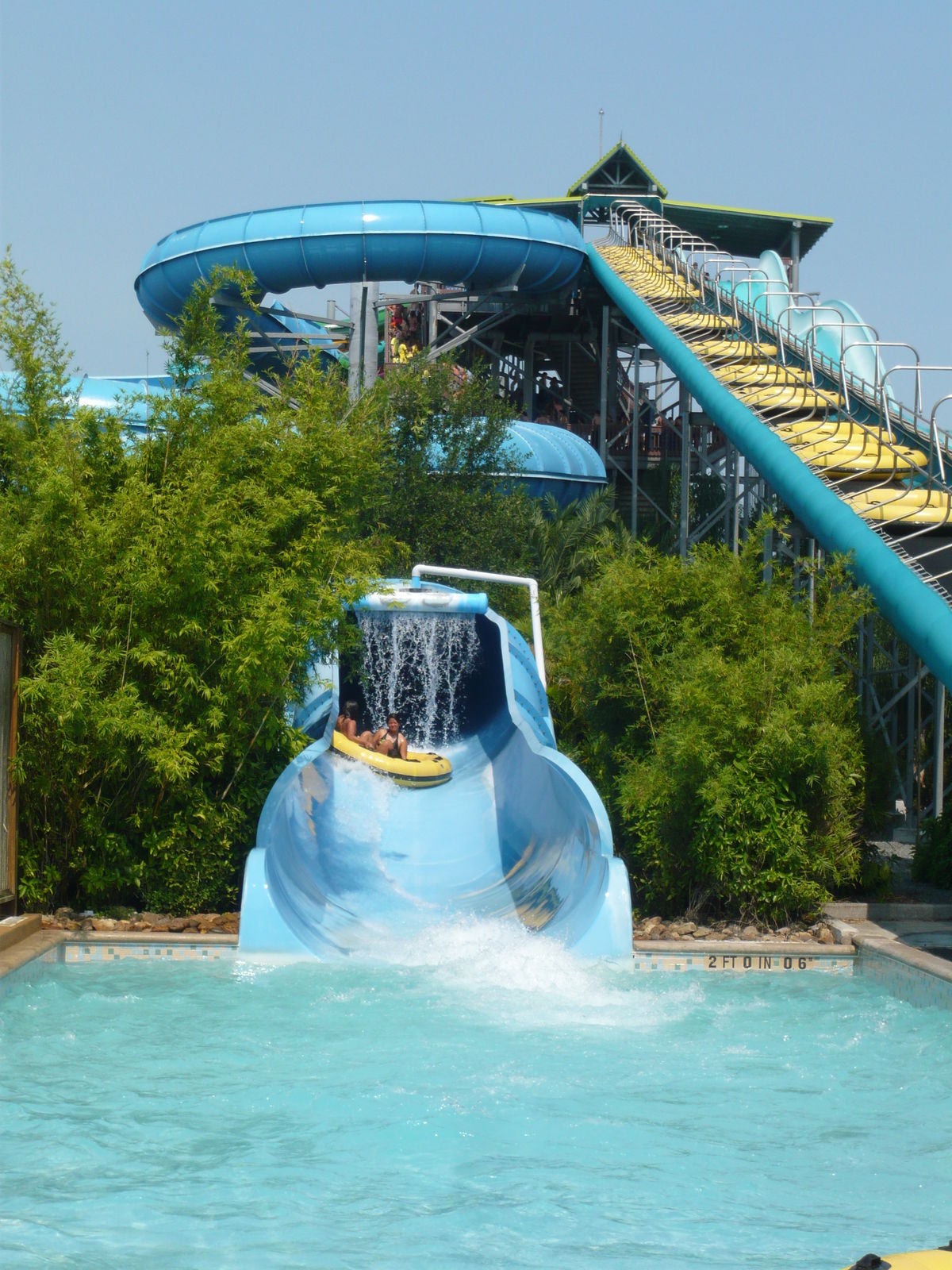 Hierbei handelt es sich um zwei Trichterrutschen, die mit Einzel- oder Doppelreifen berutscht werden und im Gegensatz zu den Bodyslide-Varianten demnach kein Loch in ein Plumpsbecken, sondern eine steile Schussfahrt aus dem Trichter heraus haben. "Half the fun is getting there!" heisst es auf der Website - sie befinden sich nämlich auf einer Insel, die durch den Lazy River gebildet wird. Eine Brücke über den Lazy River gibt es nicht, man muss ihn also erst durchqueren, um zu den Trichterrutschen zu gelangen. Klingt in der Theorie ja lustig, dumm nur, dass in der Praxis an unserem Besuchstag die beiden direktesten Zugänge zu den Rutschen einfach abgesperrt waren, und man somit erst eine halbe Runde des recht langen Lazy Rivers absolvieren
