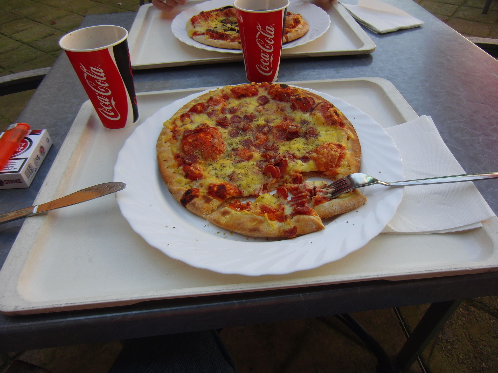 Ich hatte mir eine Salami-, Steffi sich eine Champignonpizza bestellt. Die kleinen "BiFi-Scheibchen", was wohl die normale Salami ersetzen sollte, auf meiner Pizza sahen zwar gewöhnungsbedürftig aus aber im Großen und Ganzen sah die Pizza mal garnicht so schlecht aus.