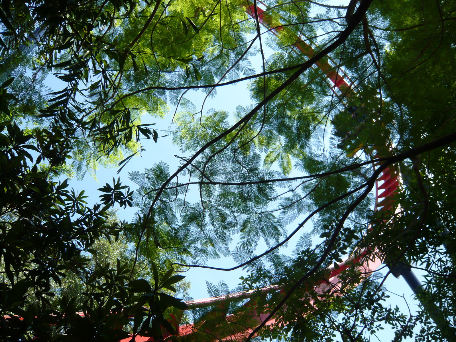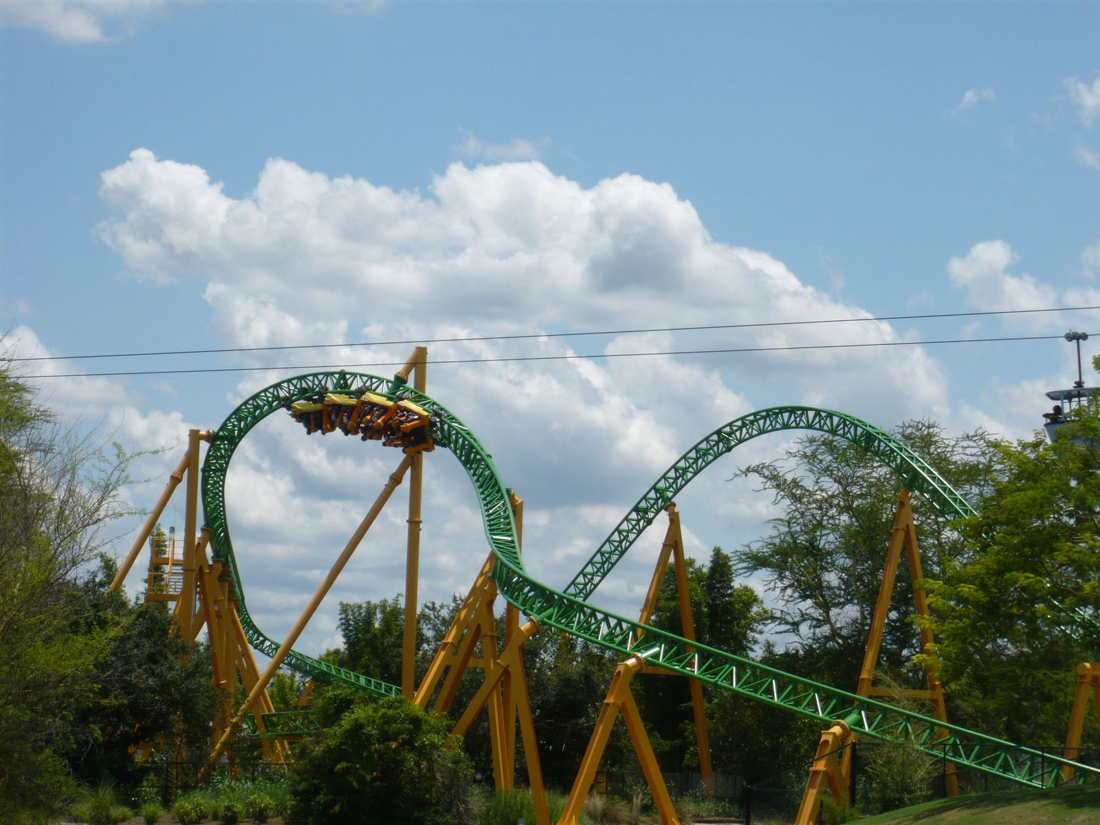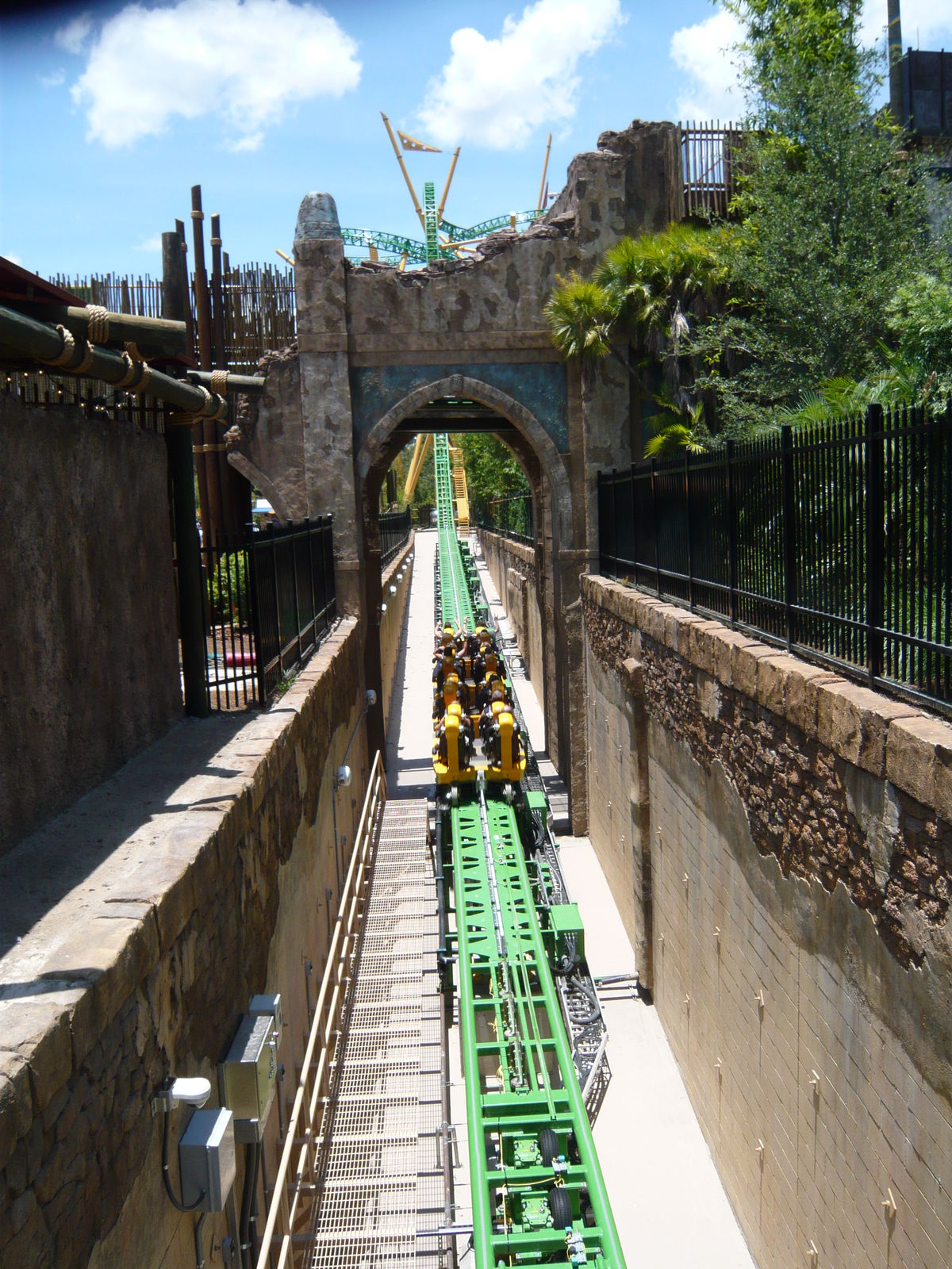 Auf los gehts los! Mehr oder weniger direkt aus der Station hinaus wird man relativ sanft in die erste Kurve beschleunigt, die ziemlich hoch hinauf führt und recht langsam durchfahren wird. Danach taucht man dann in eine Mulde ab, wo dann nahtlos der zweite Abschuss auf die Baumkrone hinauf einsetzt. Zwar ist dieser etwas stärker, hat aber nur gerade soviel Power, dass man es über den senkrechten Aufstieg knapp nach oben schafft. Die Kurvenkombination dort oben wird dann sehr gemächlich, aber doch stetig an Geschwindigkeit zunehmend durchquert, hierauf saust man mit einer Extraportion