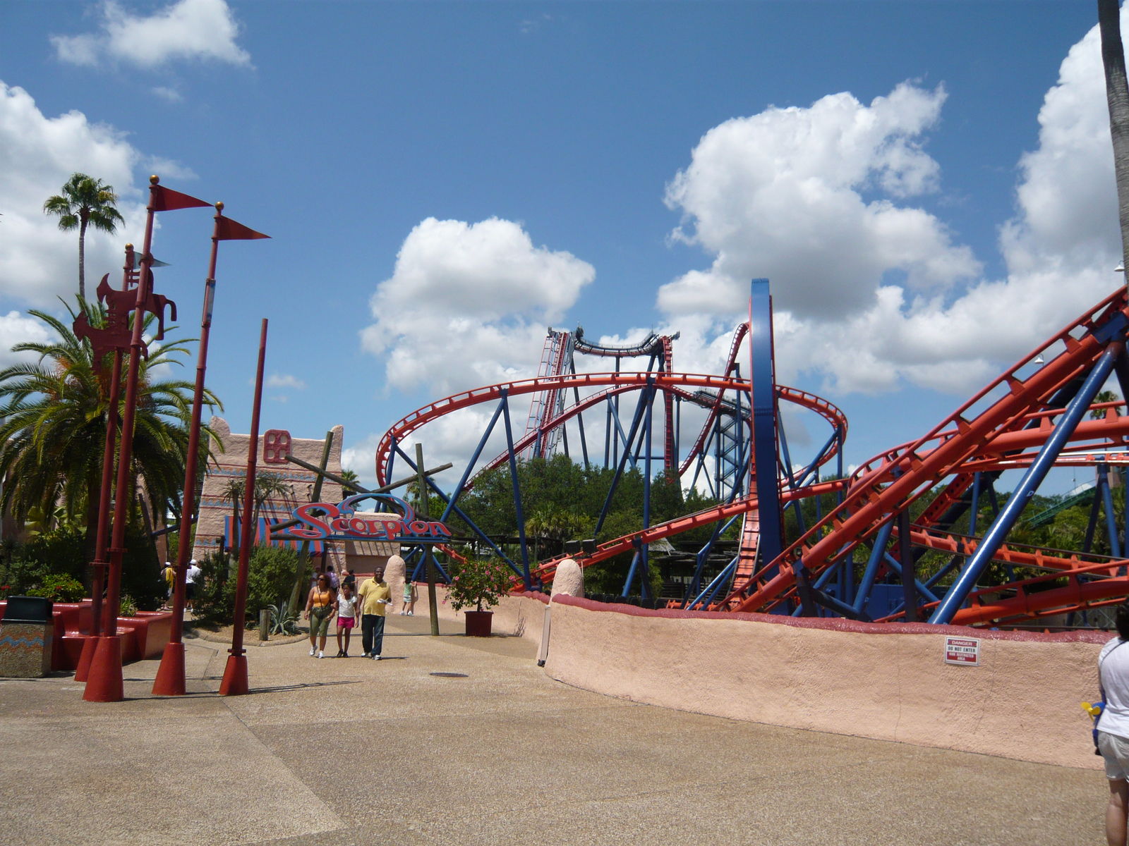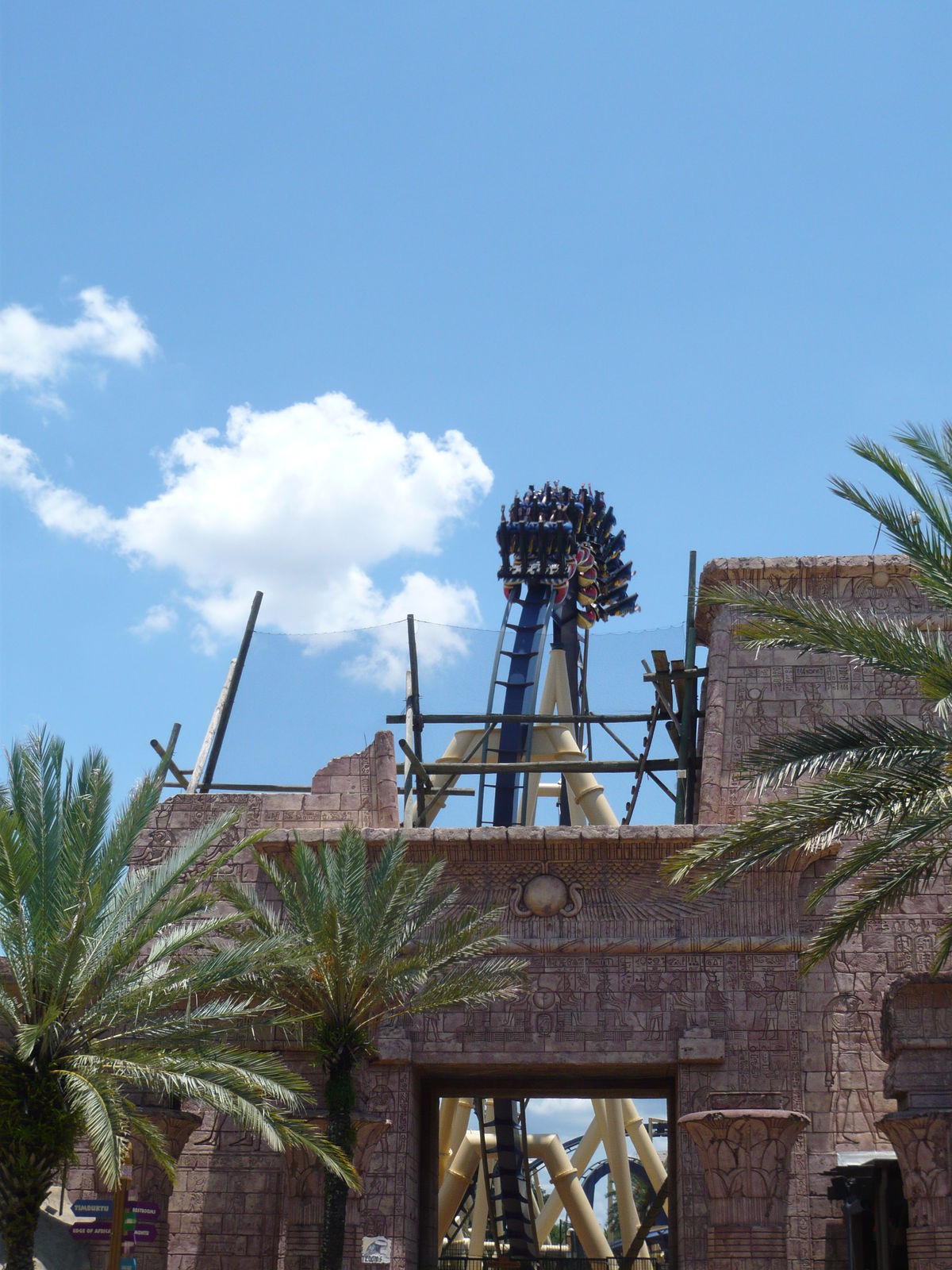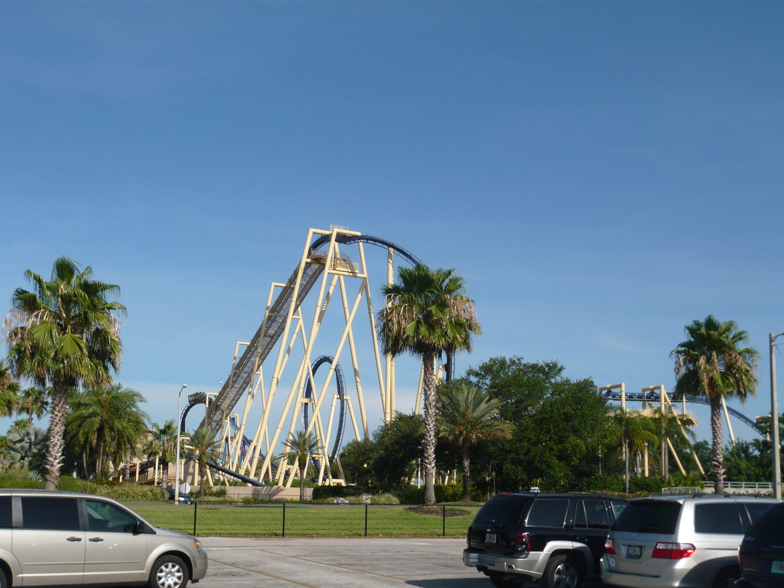 Wir gehörten zu den ersten Fahrzeugen des Tages auf dem Parkplatz, wollten aber nicht in eins der überfüllten Trams steigen, die einen zum Parkeingang bringen. Stattdessen sind wir lieber zu Fuss durch die Unterführung unter dem McKinley Drive gelaufen und haben so schon einen ersten Blick auf die immer noch grossartige und in der Morgensonne strahlende Montu sowie auf die mehr oder weniger daneben liegende Neuheit Cheetah Hunt erhaschen können.