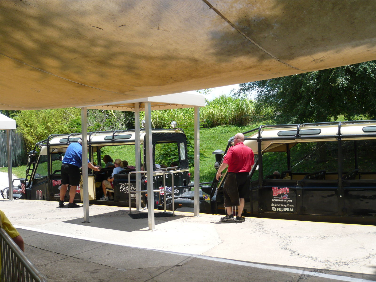 Nun stand eine kleine Safari bei der Rhino Ralley auf dem Programm! Nach kurzer Wartezeit konnten wir in einem der hier eingesetzten Landrover Platz nehmen und los ging die holperige Fahrt durch die Serengeti-Ebene, wo man mit etwas Glück einige der hier lebenden Tiere zu Gesicht kriegt. Während unserer Fahrt zur Mittagszeit lagen die meisten Tiere im Schatten, unsere Fahrerin musste oft sehr genau gucken, um uns sagen zu können, wo sie gerade sind. Die der Attraktion ihren Namen gebenden Nashörner haben wir nicht gesehen. Leider ist ja der problembehaftete Flusspart der Attraktion seit Cheetah Hunt endgültig Geschichte, aber auch so dünkte mich die Fahrt im Vergleich zu früher extrem verkürzt. Auch kam eine neue Story zum Einsatz: Man macht sich nun auf die Suche nach einem Safariguide-Kollegen namens Scooter, der sich schon einige Zeit nicht mehr per Funk gemeldet hat. Insgesamt fand ich die Attraktion im Vergleich zum letzten Mal etwas weniger stimmig und gar kurz, allerdings sagte unsere Fahrerin auch, dass die Strecke zurzeit komplett neu konzipiert wird - da könnte sich bis zur Onride-Tour vielleicht noch was zum Positiven ändern.