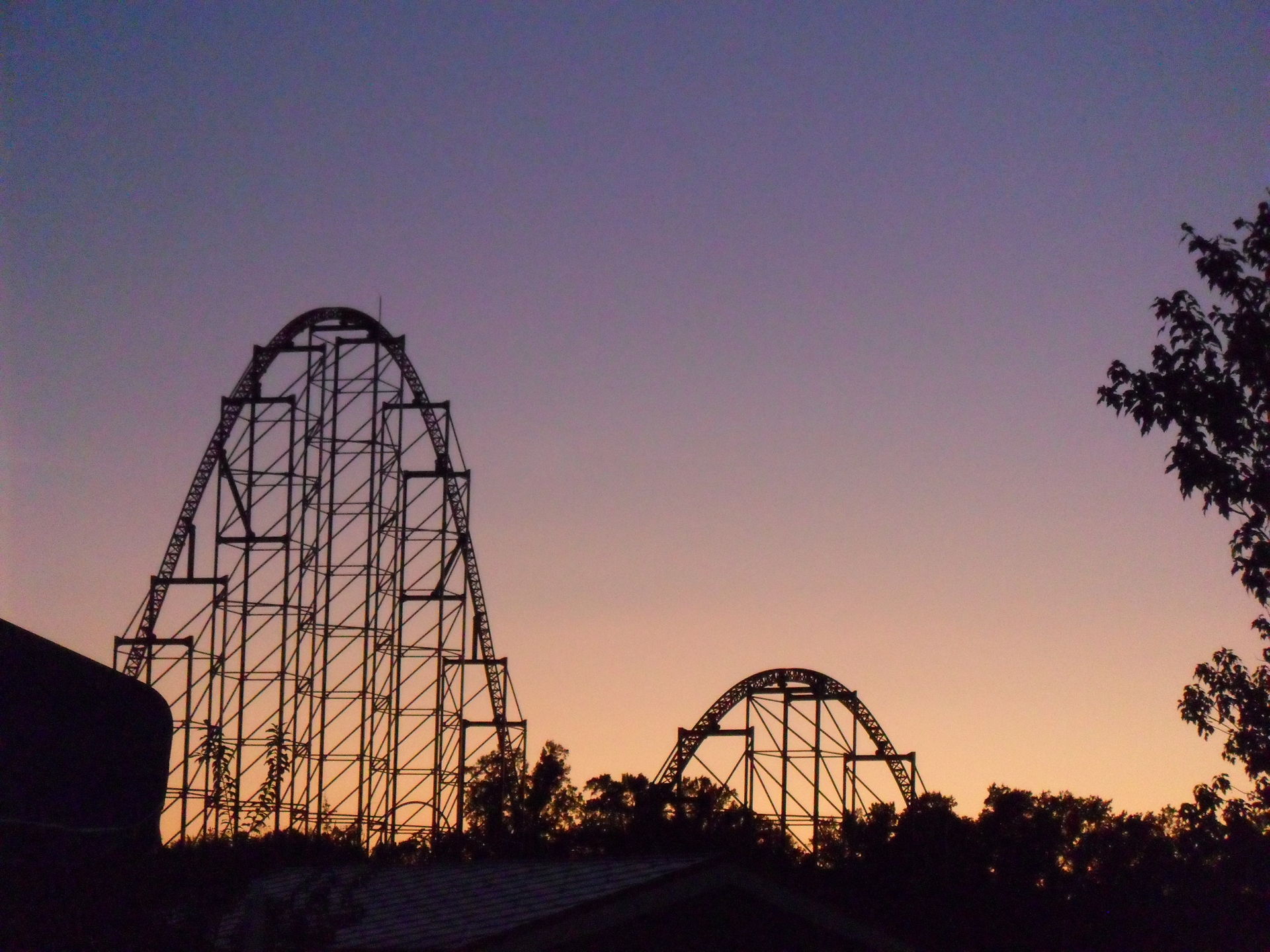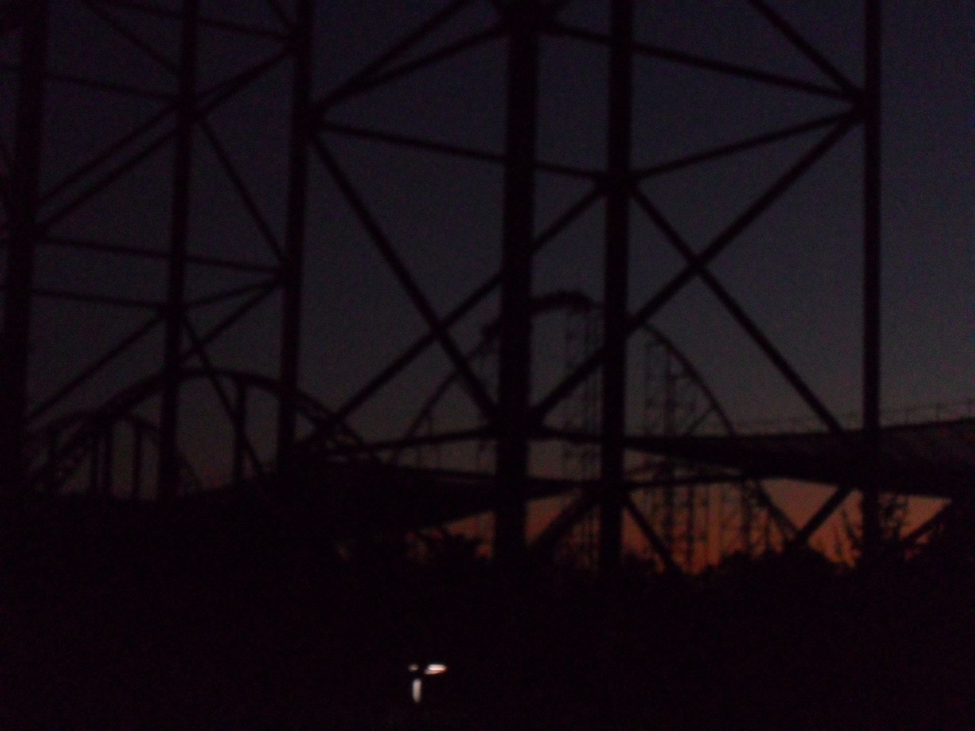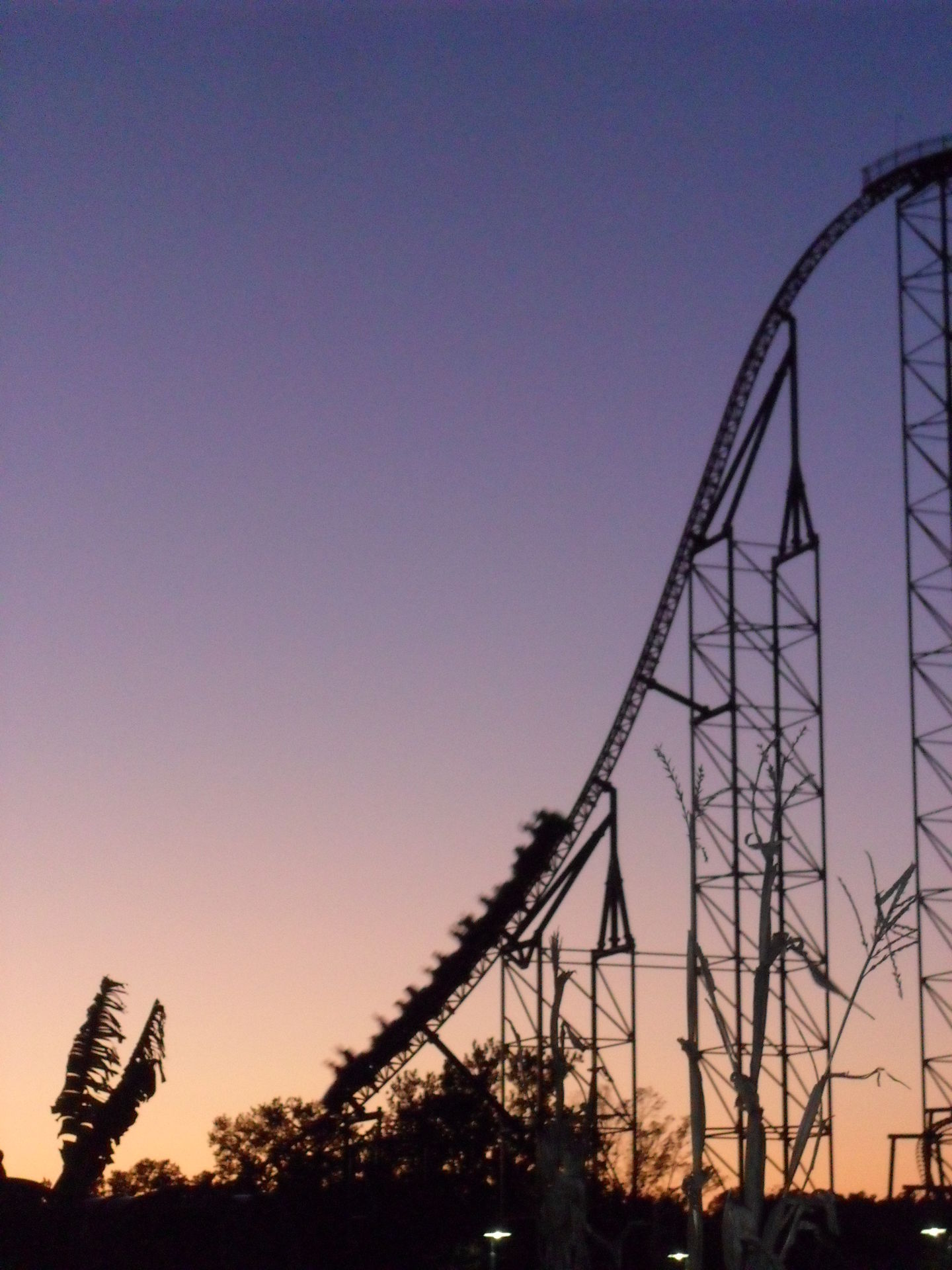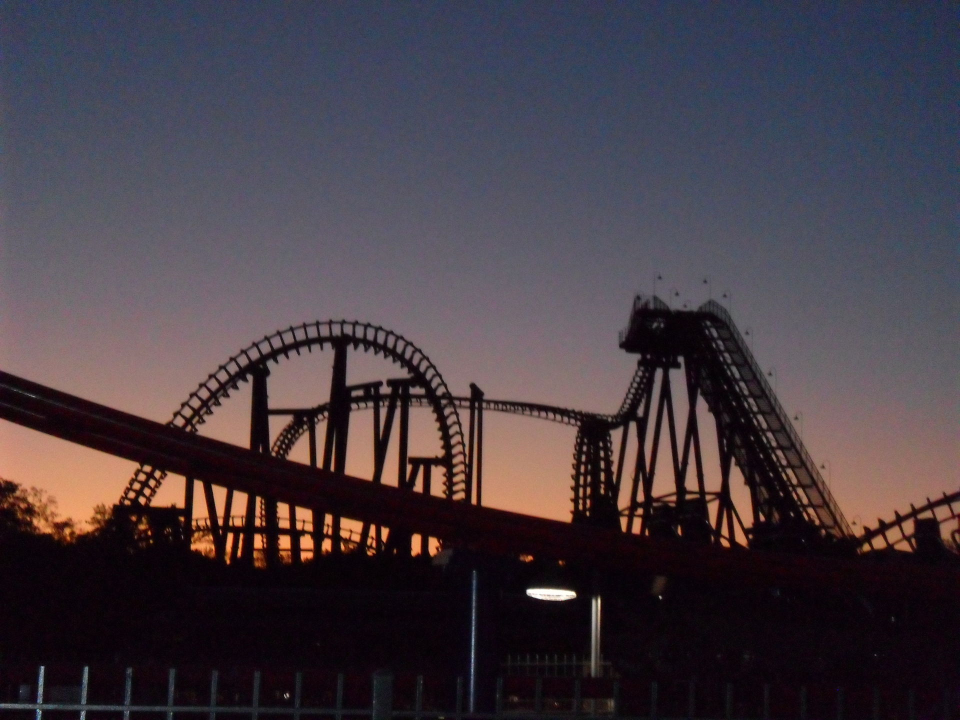 Langsam wurde es dunkel und es ergaben sich schöne Fotoaufnahmen im Sonnenuntergang. Vor Allem von Superman aus hatte man einen wunderschönen Blick auf den Feuerroten Sonnenuntergang am Horizont. Leider hatte ich bei dieser Fahrt meine Kamera nicht griffbereit, aber das Foto wäre wahrscheinlich eh verschwommen. Sobald es dunkel wurde, wurde es auch etwas voller, sodass man bei Superman nun ungefähr 20 Minuten warten musste. Man hätte wahrscheinlich viel weniger gewartet, wenn sie die Leute ein bisschen schneller abgefertigt hätten. Aber aufgrund von unnötigen Durchsagen, privaten Gesprächen unter den Mitarbeitern… hat sich das ganze etwas verzögert. Aber was sind schon 20 Minuten