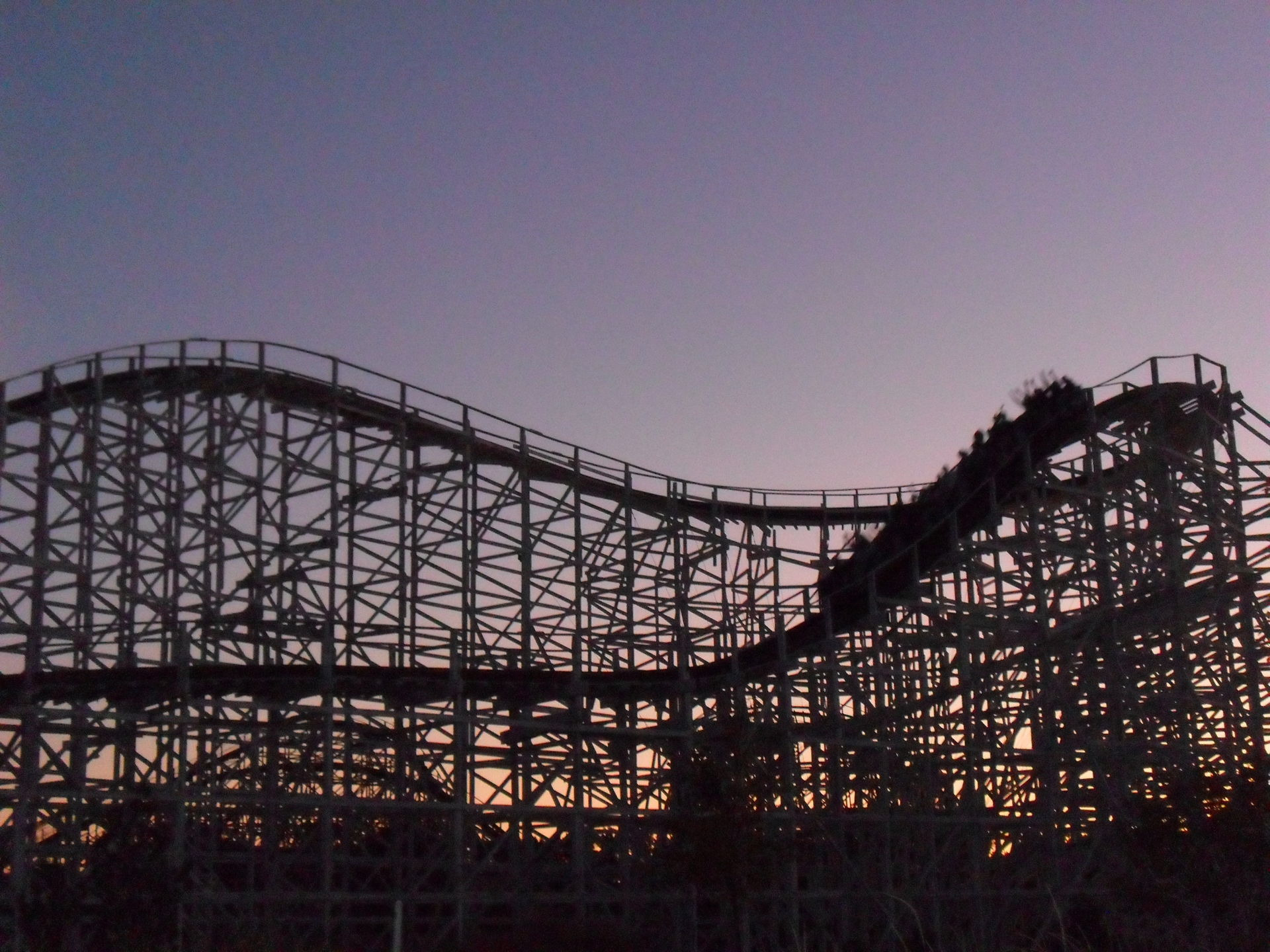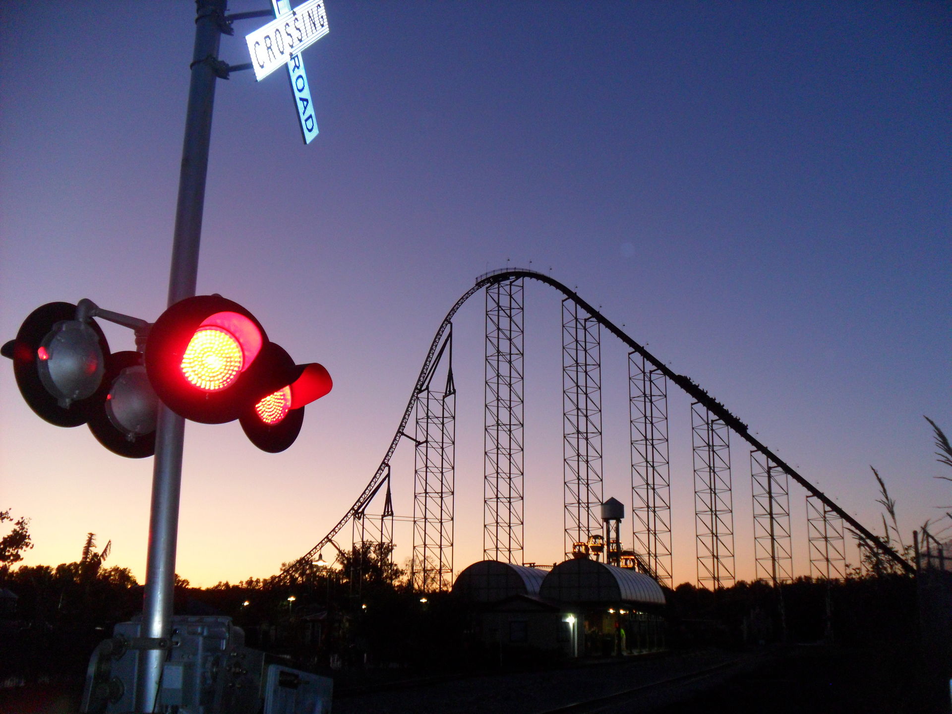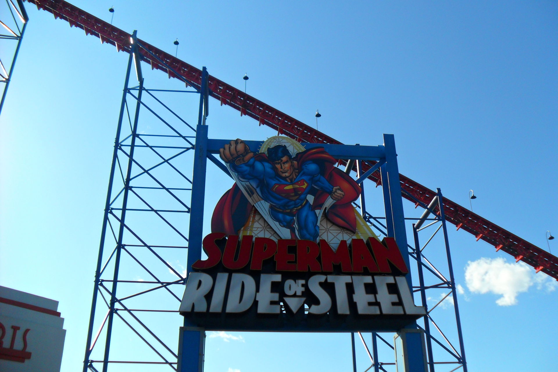 Langsam wurde es dunkel und es ergaben sich schöne Fotoaufnahmen im Sonnenuntergang. Vor Allem von Superman aus hatte man einen wunderschönen Blick auf den Feuerroten Sonnenuntergang am Horizont. Leider hatte ich bei dieser Fahrt meine Kamera nicht griffbereit, aber das Foto wäre wahrscheinlich eh verschwommen. Sobald es dunkel wurde, wurde es auch etwas voller, sodass man bei Superman nun ungefähr 20 Minuten warten musste. Man hätte wahrscheinlich viel weniger gewartet, wenn sie die Leute ein bisschen schneller abgefertigt hätten. Aber aufgrund von unnötigen Durchsagen, privaten Gesprächen unter den Mitarbeitern… hat sich das ganze etwas verzögert. Aber was sind schon 20 Minuten