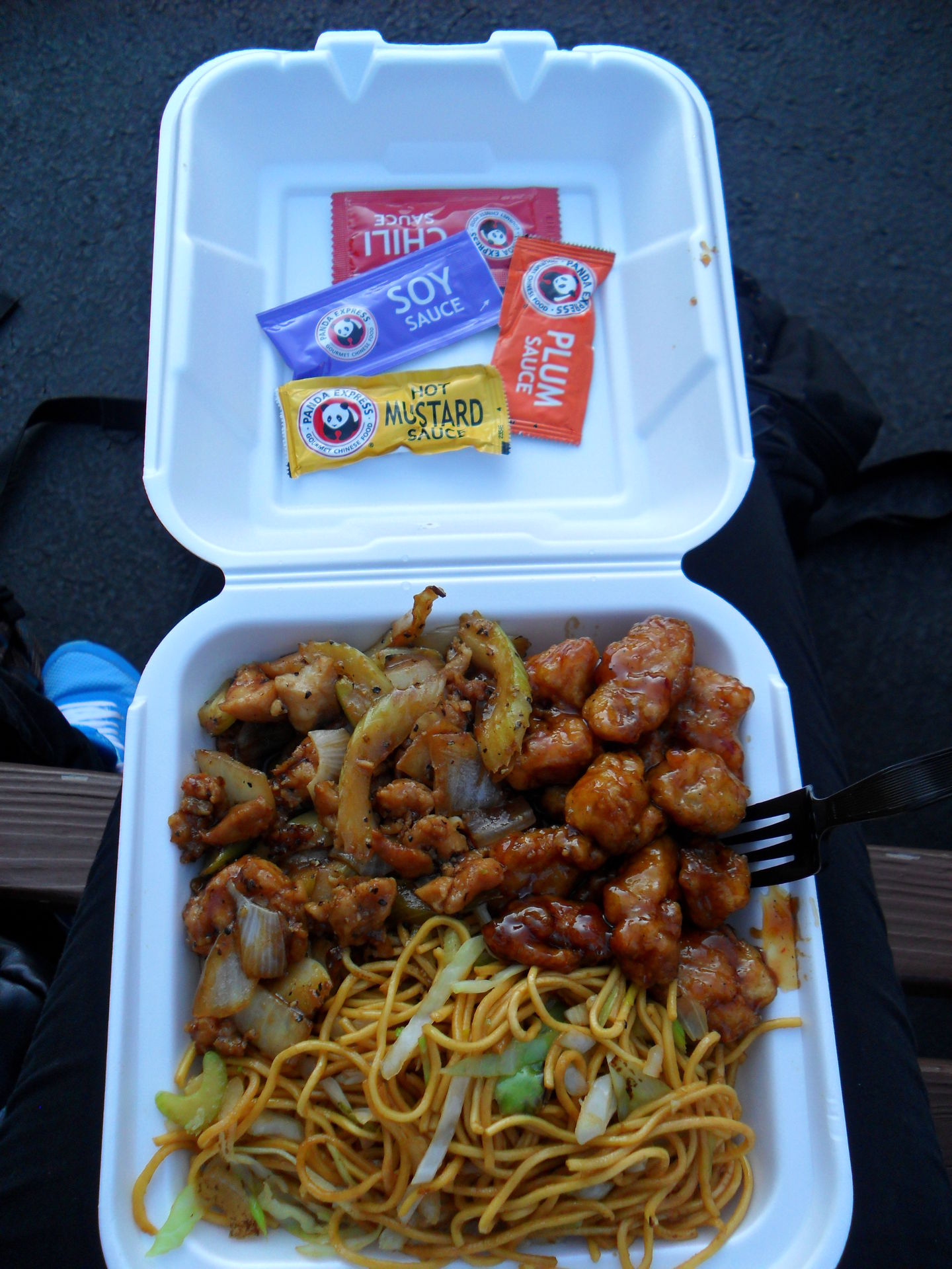 Mittlerweile war es dann schon kurz nach 5 und wir hatten Hunger. Also ging es ab zum Panda Express, wo wir uns reichlich satt gegessen haben. Wir haben jeweils einen normalen Teller gegessen mit 2 Hauptgerichten und einer Beilage zur Auswahl. Ich hatte mich für Orange und Black pepper chicken und Chow Mei entschieden und es war sehr lecker und vor allem sehr sehr sehr viel. Und das gerade mal für umgerechnet 7¤. Verglichen zu den Preisen in deutschen Freizeitparks sehr günstig und was noch viel wichtiger ist: es war gutes Essen.