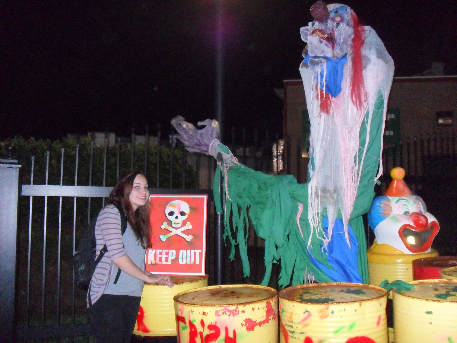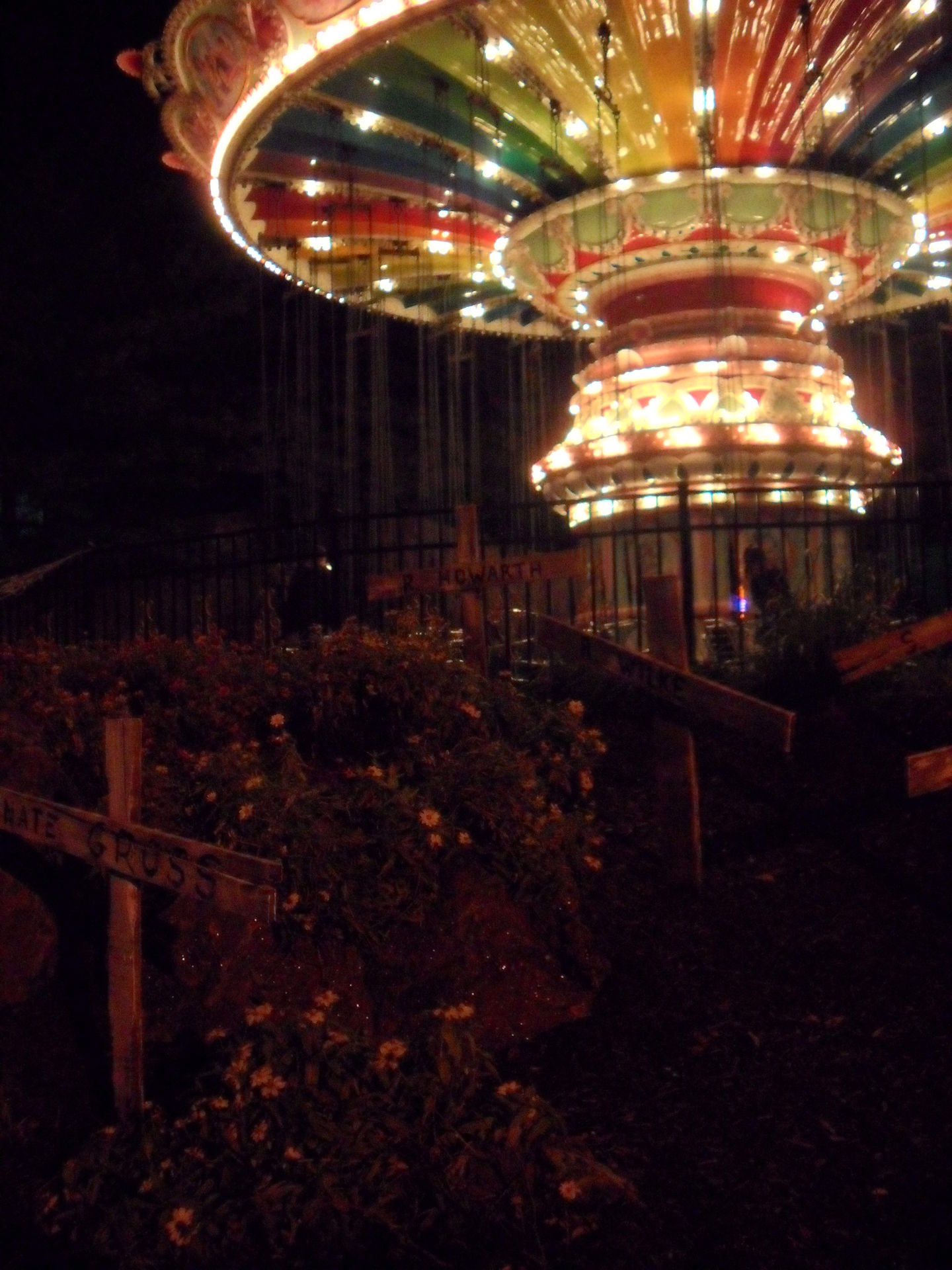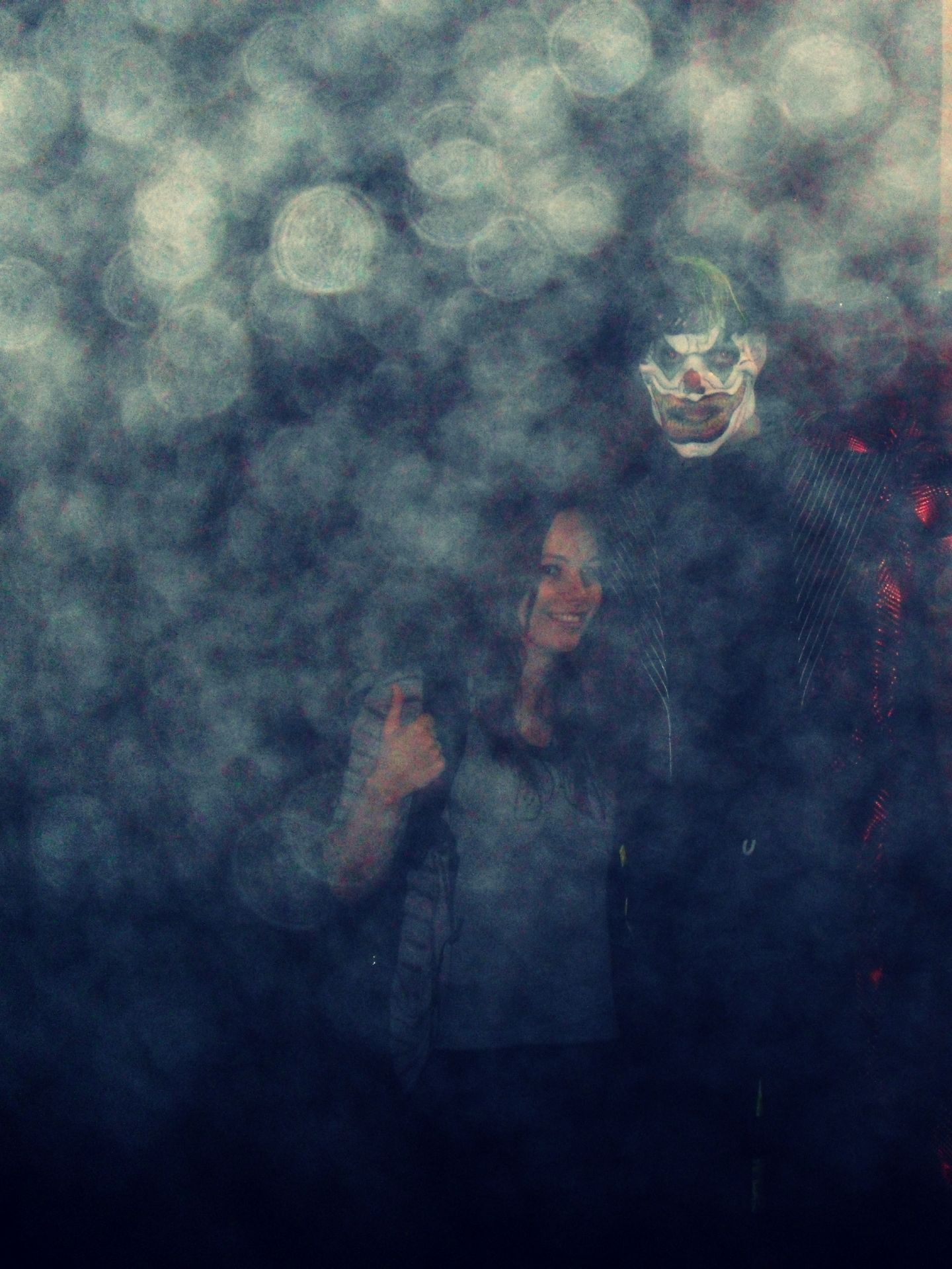 Nachdem wir dann also alle satt waren ging es weiter zum Kettenkarussell. Während der Fahrt konnten wir auf dem Platz vor dem Karussell schon erkennen, wie sich die Leute dort versammelt haben, um den Beginn des Fright Festes zu sehen. Nachdem unsere Fahrt zu Ende war, haben wir uns dazu gestellt und den Zombies und anderen Gestalten dabei zugeschaut wie sie kleine und große Kinder erschreckt haben. Die einen haben gelacht, die anderen sind weinend weggelaufen