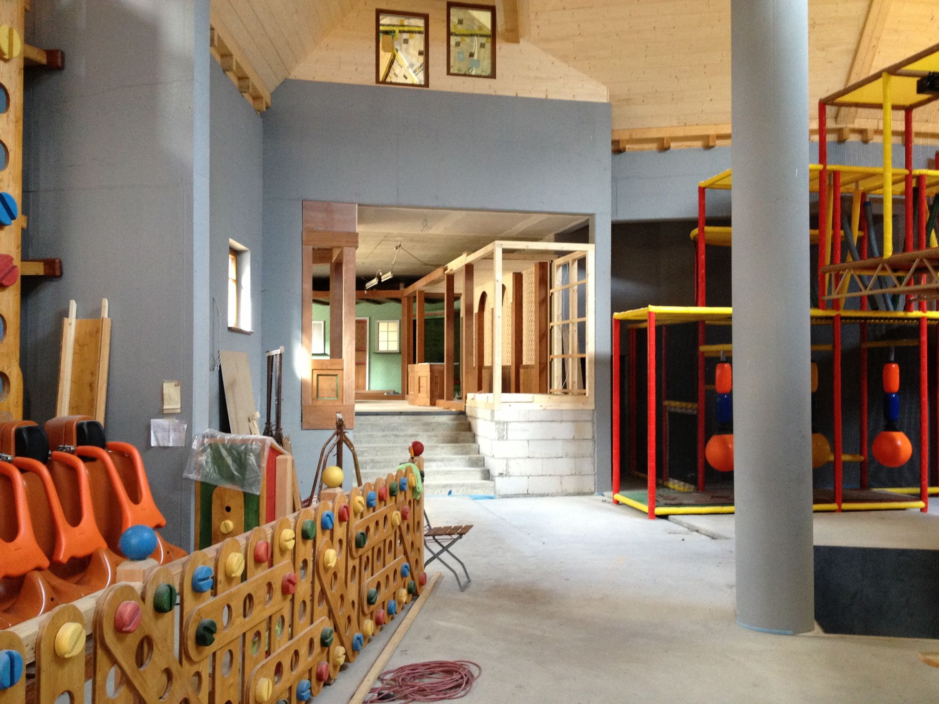 An der Baustelle des ehemaligen Weinfasses werden Fachwerkhäuser errichtet mit einem "Spielhaus", also Indoor Spielplatz.
