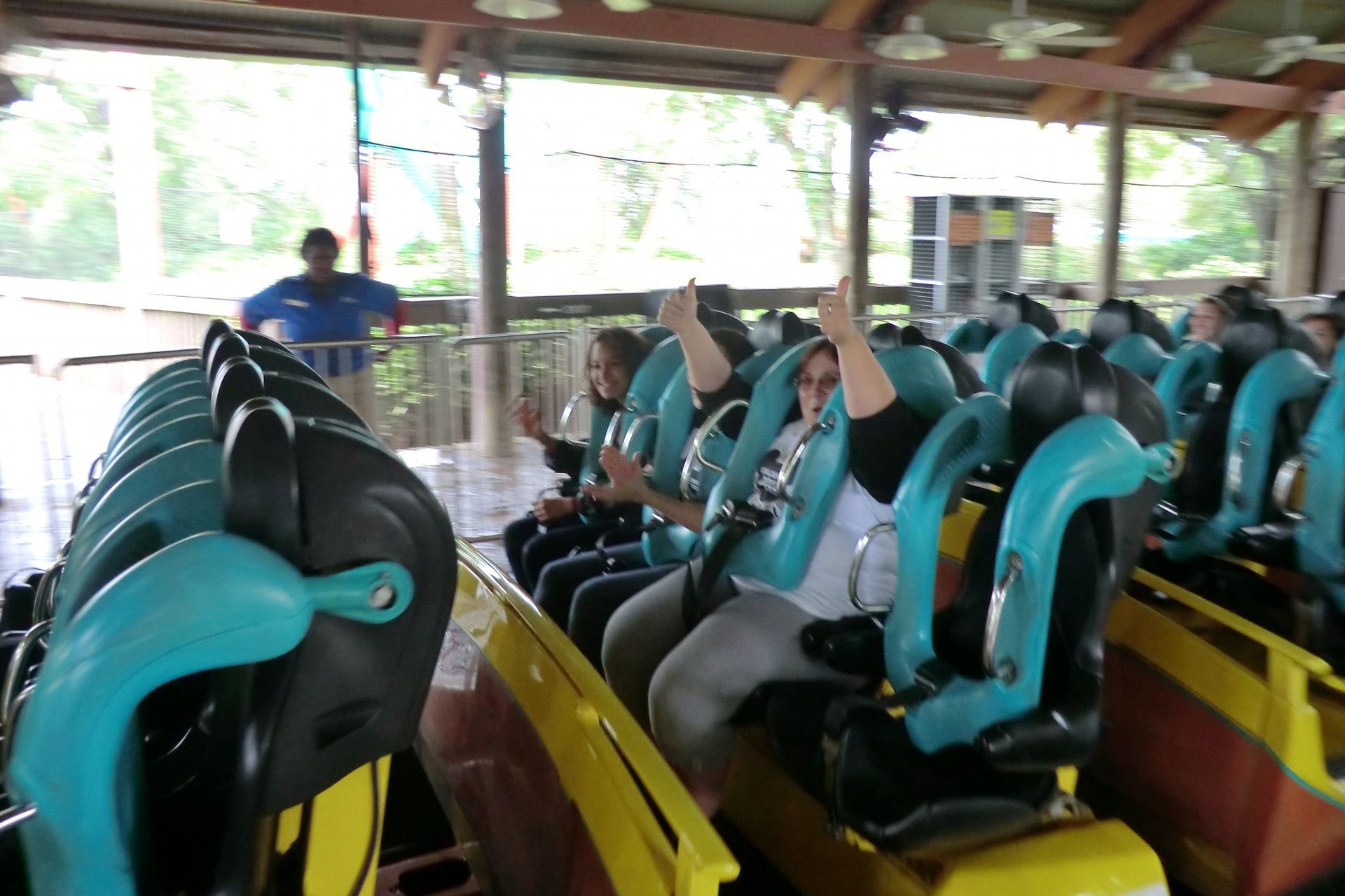 Ich hörte ja, dass es da einigen Unmut bei und nach deren Organisation gegeben haben sollte. Da Bjoern und ich als Spalter abgetan wurden, da wir keine Shirts trugen, konnte ich dank Auschluss aber die zwei letzten Bilder (Station und Fahrt) des knallvollen onride-Zuges machen, wo ja die Onride-Foto-Anlage ja wegen geografischer Gegebenheiten (ja, Sonne macht auch in Florida Licht) kläglich gescheitert ist.