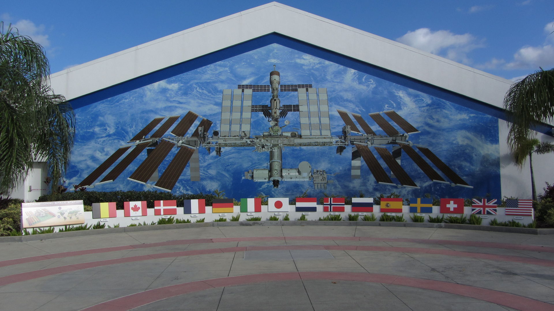 Die internationale Raumstation ISS im Vollbild mit allen beteiligten Nationen im Vordergrund