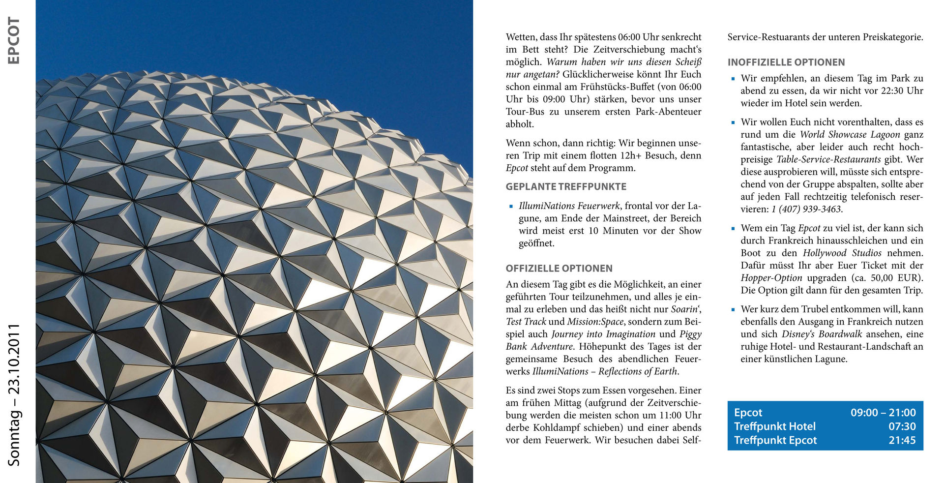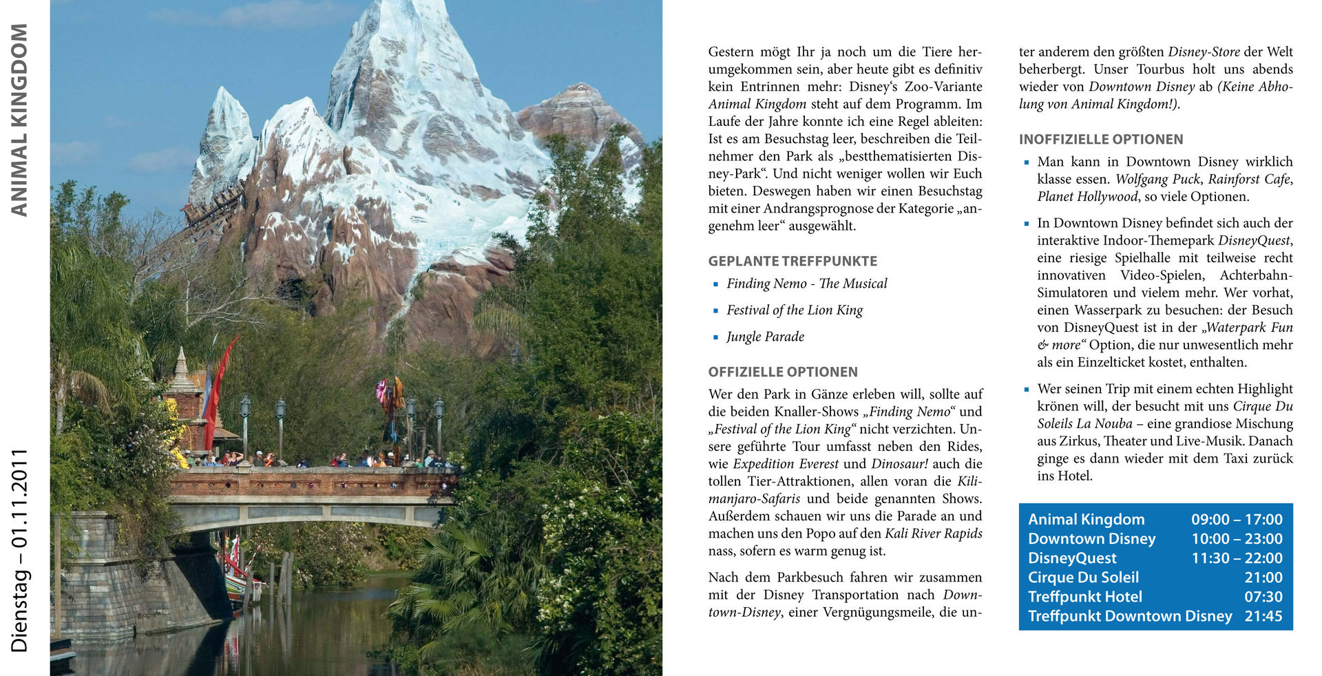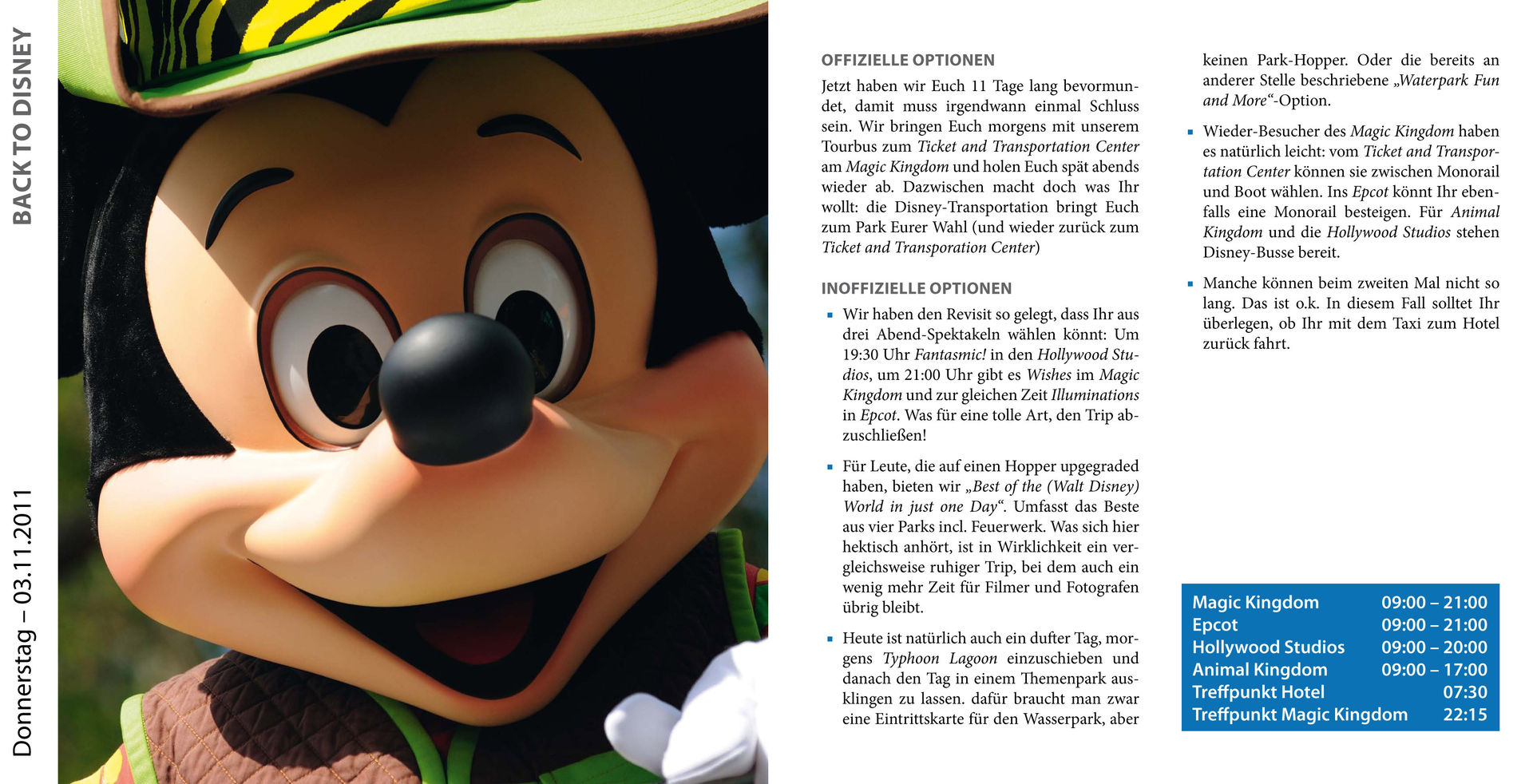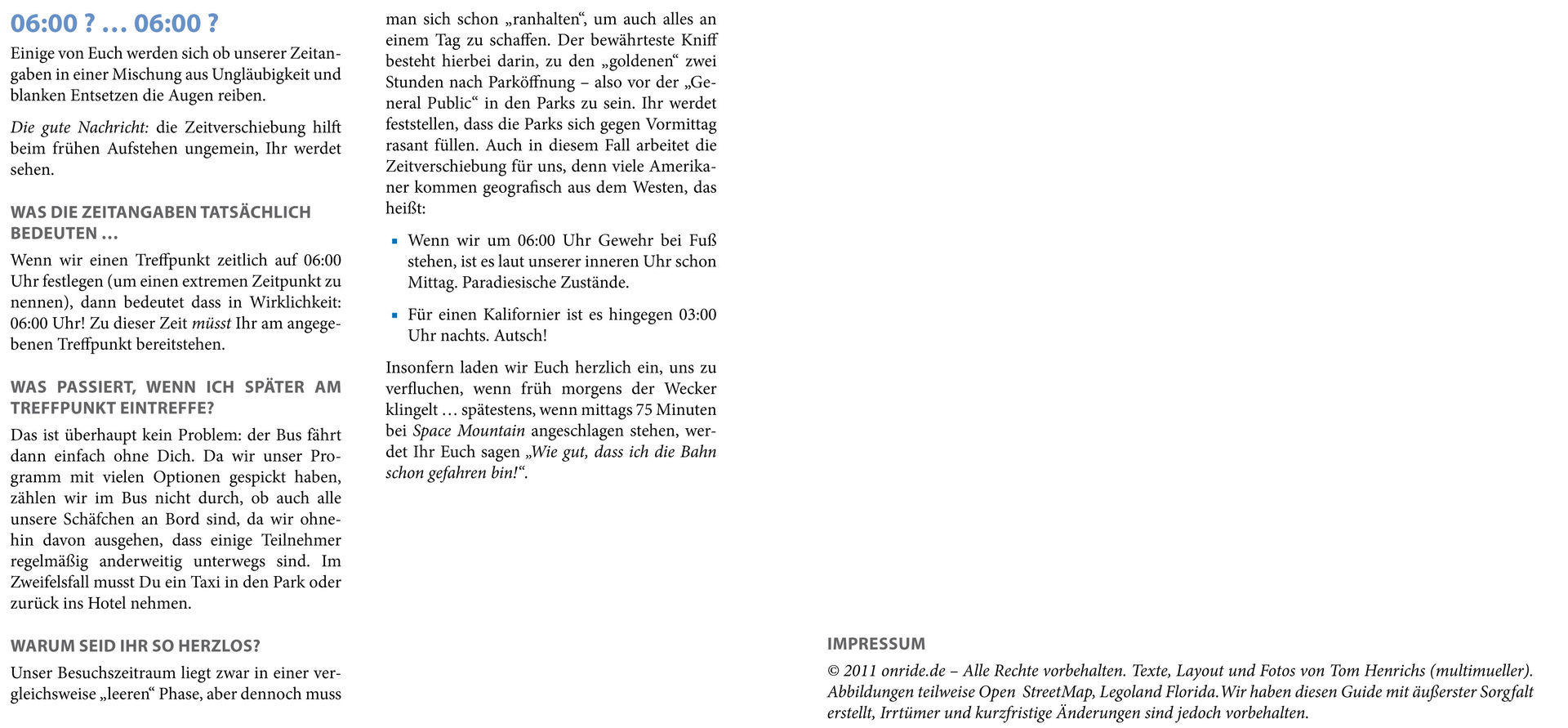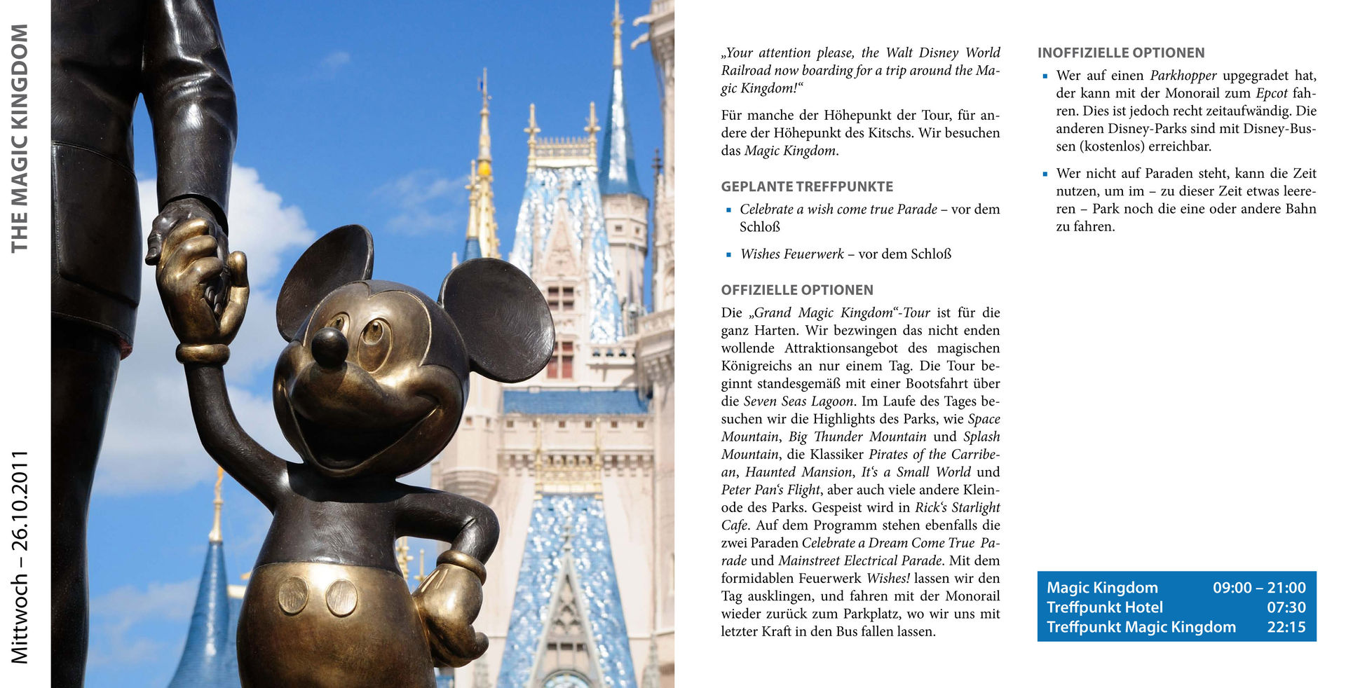 Die Hinweise zur Ablaufplanung und die Broschüre könnten auch gut im Orlando Guide ein zuhause finden, auch wenn man für eine private Tour nicht so generalstabsmäßig planen muss steckt da viel wissenswertes drin auf das es zu achten lohnt.
