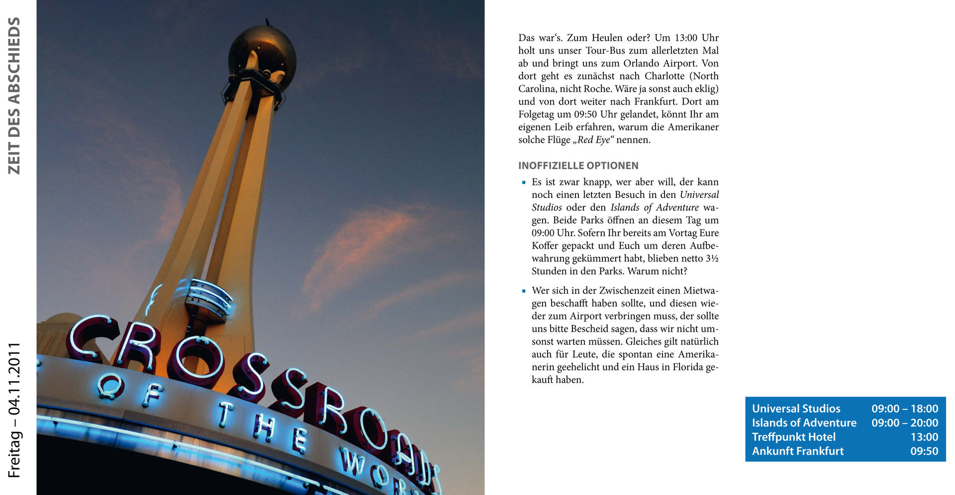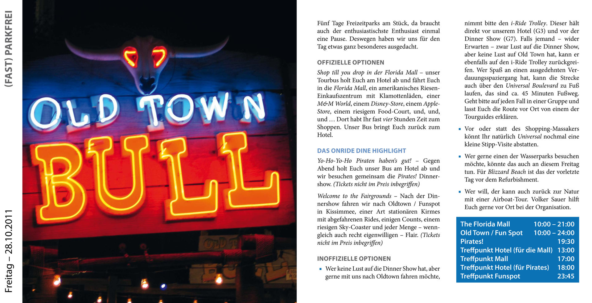 2011 feierte ich 10-jähriges Orlando-Jubiläum. Seit 2001 fliege ich nun regelmäßig in das „Themepark Capital of the World“ – in jeweils wechselnden Teilnehmerkonstellationen. Und ich behaupte, dass ich die notwendigen Komponenten für einen Orlando-Trip binnen 24 Stunden zusammenstellen könnte, was ich 2003 sogar schon einmal in einer Projektlücke getan habe. Insofern habe ich mir nichts Böses gedacht, als ich Volker vor einigen Jahren in die hohle Hand versprach, ihm einen ausgewachsenen Orlando-Trip für onride zu organisieren, so er dies denn von mir verlangen sollte. Und da ich zu meinem Wort zu stehen pflege, hatte ich recht wenig Möglichkeiten, mich aus der Nummer noch herauszureden, als Volker dies Mitte 2010 tatsächlich einforderte.