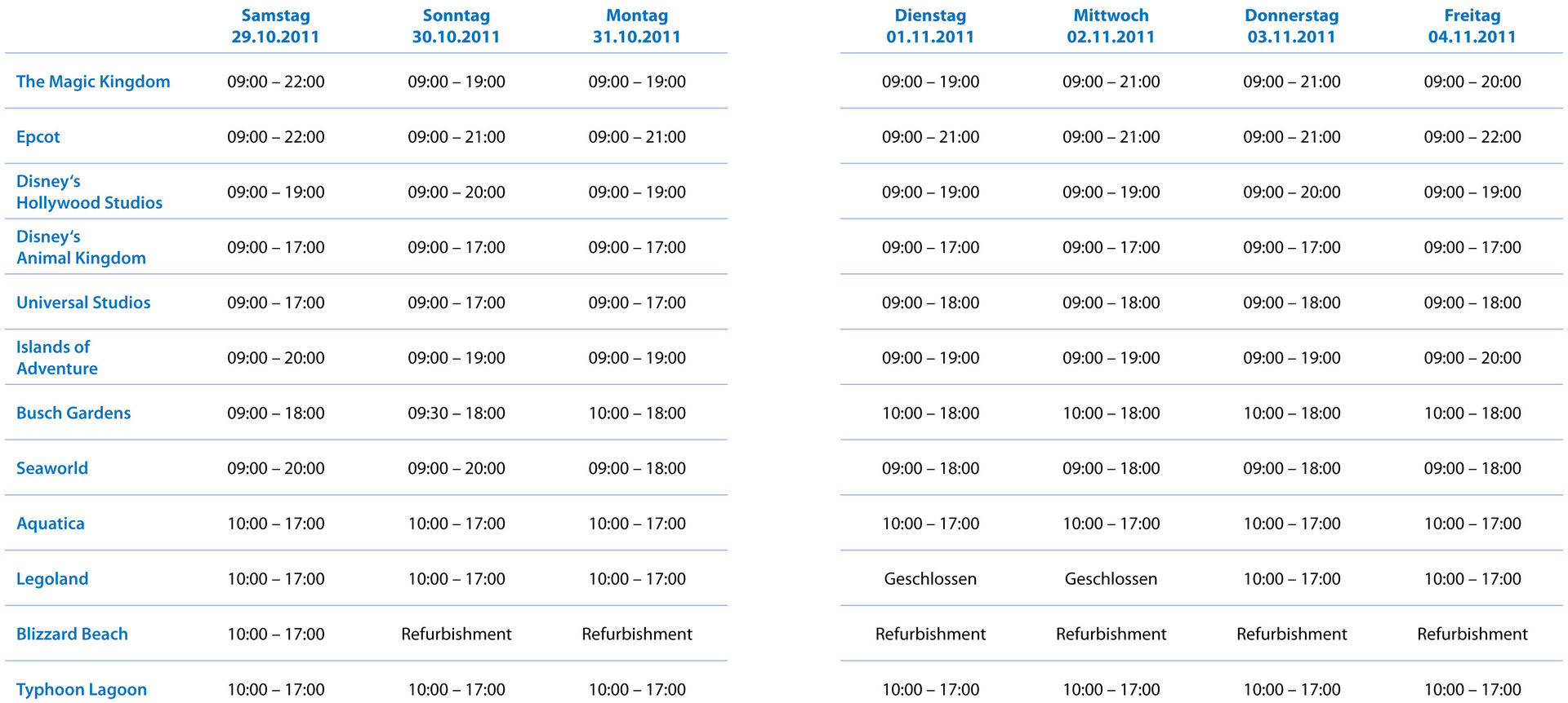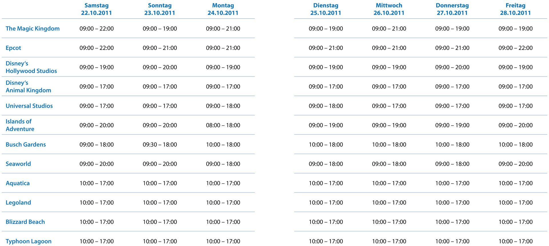 Es gilt also, im ersten Schritt, Parköffnungs- und Showzeiten in mühevoller Kleinarbeit von den Parkhomepages zu ziehen und im Masterplan zusammen zu fassen. Das Ergebnis sieht dann so aus: