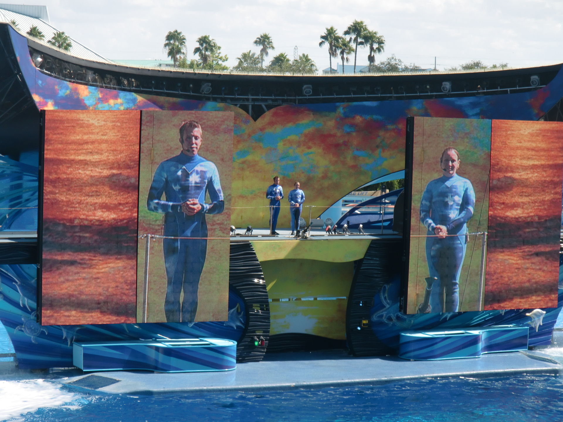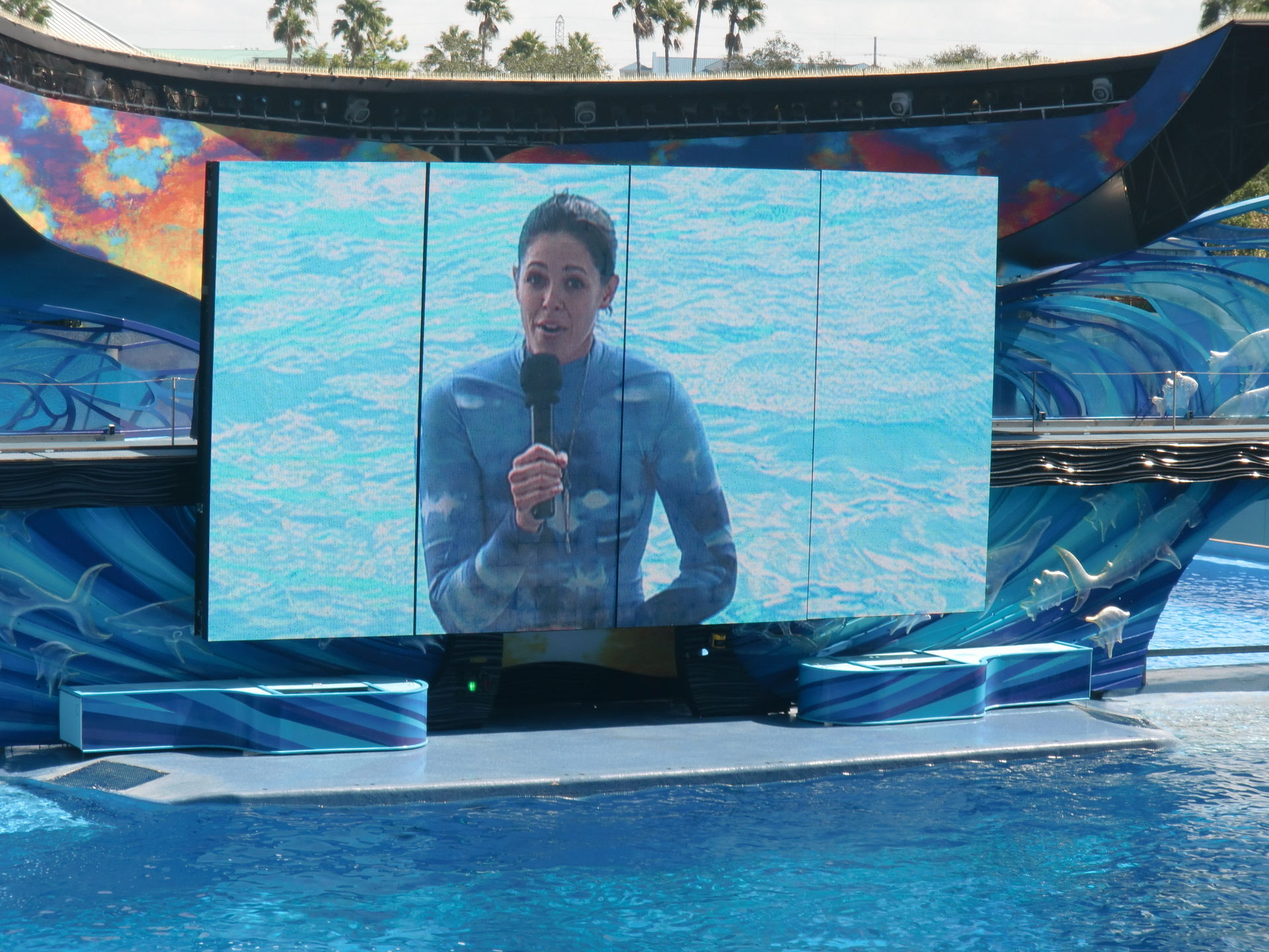 Kaum dass die Trainerin erklärt, was für eine Welle so ein Wal mit seiner Schwanzflosse erzeugen kann und dass man das nur zu gerne demonstrieren würde...