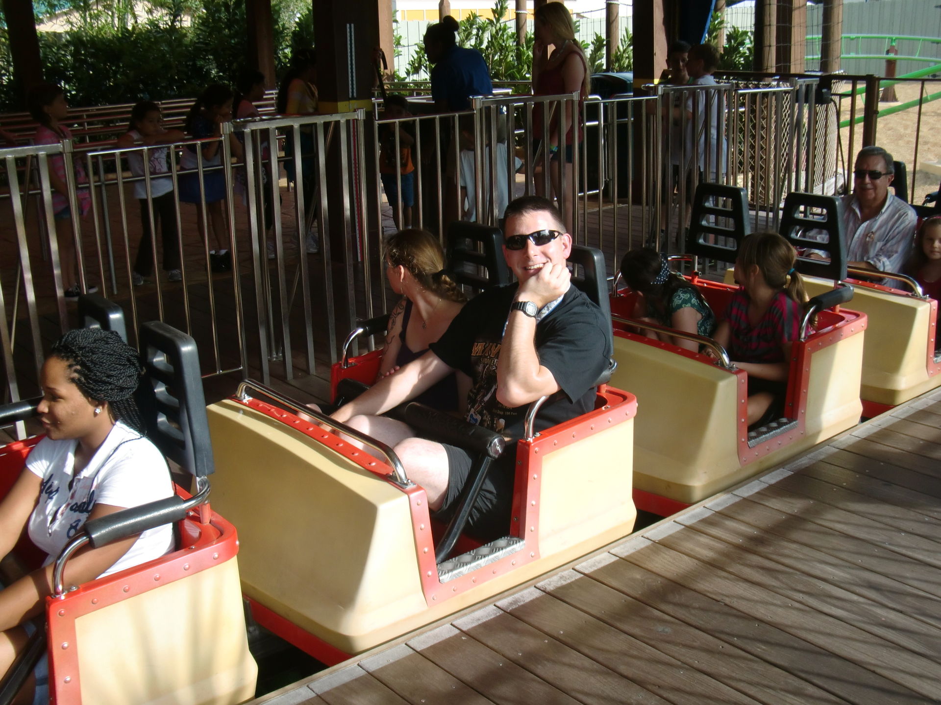 Viel Spass hatten wir auch auf der wilden Maus, vor allem aufgrund der amerikanischen Sicherheitsbestimmungen bei Bügeln für zwei Sitze: Da saß neben mir einer unserer dünneren Onrider, jedenfalls weit schlanker als ich. Mit dem Ergebniss, dass er noch eine Handbreit Platz bis zum Bügel hatte. So wollte man ihn aber nicht mitfahren lassen, öffnete den Bügel wieder und steckte ihm eine Bügelverdickung aus Schaumstoff drauf. Das Gelächter war groß...
