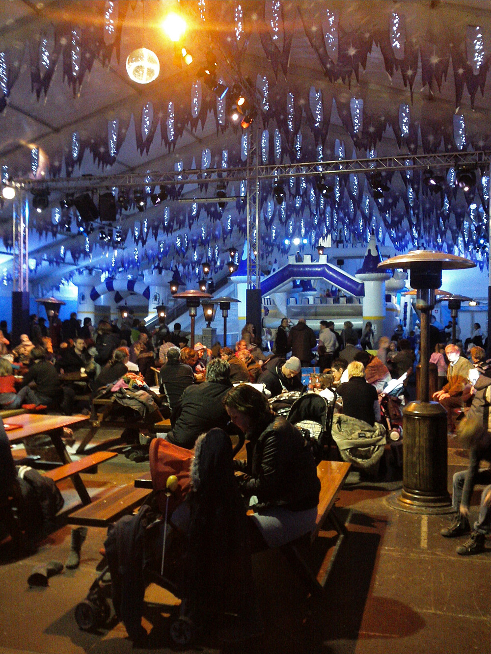 Blick in das Kinderspielzelt mit Eisrutsche und Hüpfburg im Hintergrund.