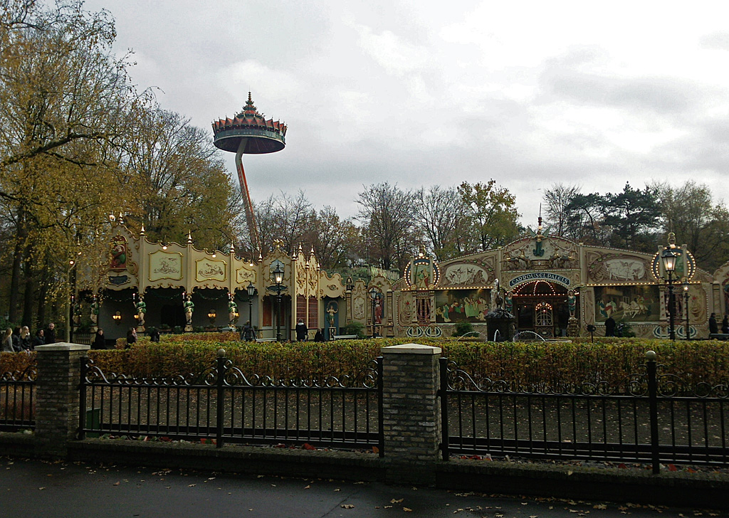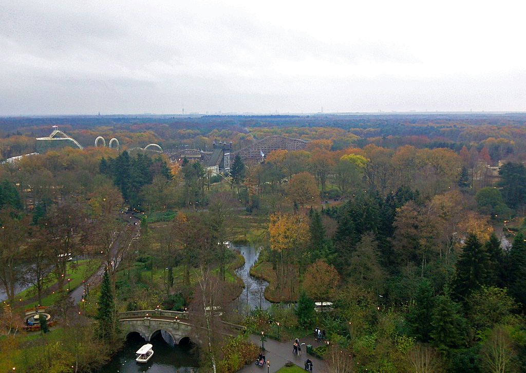 In der Ferne sind die Achterbahnen Python, Joris en de Draak und Fliegender Holländer zu sehen. Langsam schalten sich die Parklaternen an.