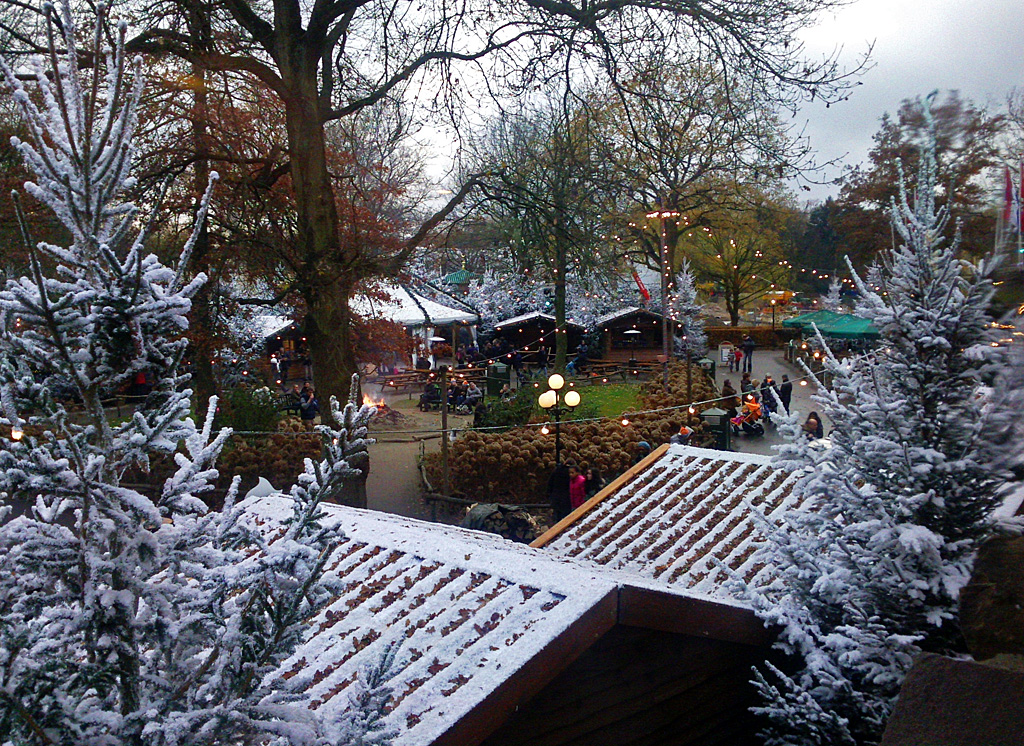 Das Weihnachtsdorf bzw. der Weihnachtsmarkt. Wenn schon kein echter Schnee liegt, die Dächer wurden mit Kunstschnee bedeckt.