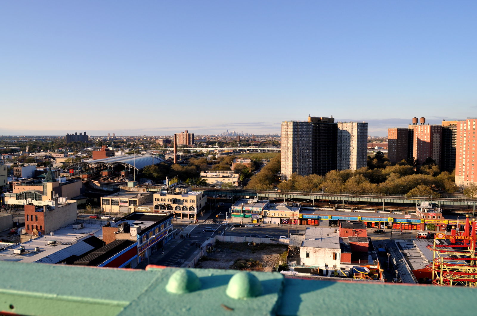 Da ich seit 3 Wochen von Schwindel geplagt war und ich die Gondeln überhaupt nicht einschätzen konnte, habe ich in einer normalen Gondel Platz genommen. War auch einfacher zum Fotografieren. Die Fahrt war trotzdem echt cool, konnte ganz Brooklyn sehen und sogar die Skyline von Manhattan. Unglaublich wie weit das ist, obwohl ich immer noch in New York City war. Selbst für 6$ hätte sich das gelohnt. Als die Fahrt vorbei war bin ich weiter gelaufen und habe ein paar Bilder in der Dämmerung gemacht. Und was hab ich da entdeckt? 2 Techniker am Cyclone!