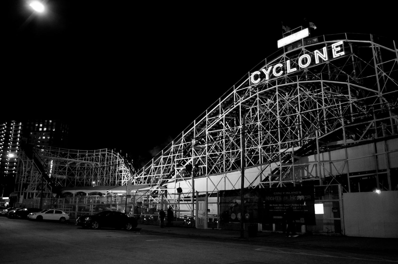 Da es etwas frischer wurde als die Sonne weg war, habe ich mich im Auto etwas aufgewärmt, ein paar Twinkies reingepfiffen und meinen Mountain Dew-Tank aufgefüllt. Um viertel vor 6 habe ich dann alles aus den Taschen raus, bis auf die kleine Sony und bin wieder zum Cyclone marschiert. Und tatsächlich... Licht an und eine Schlange am Ticket-Häuschen!