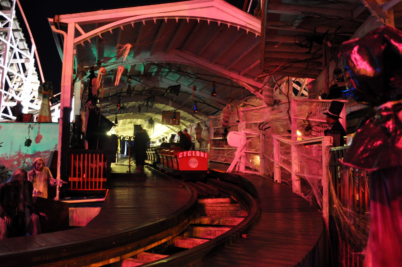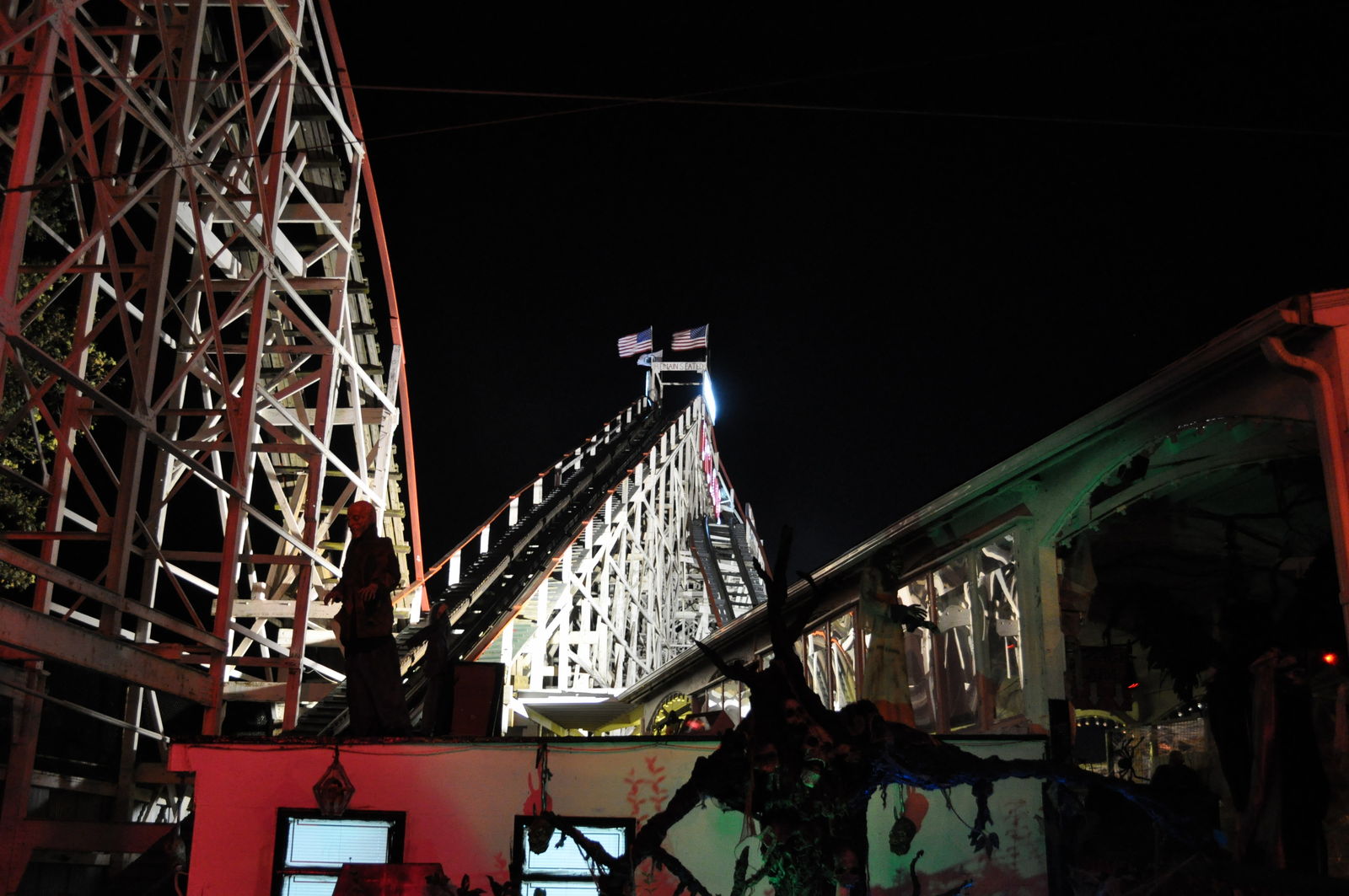 First Drop die Arme hoch gemacht, wie es sich gehört. In der Kurve wurde ich dann so dermaßen in dem Ding hin und her geschleudert, das war nicht mehr feierlich! Rolling Thunder im Six Flags war dagegen bequem und gemütlich. Die ist gnadenlos übers Holz gebrettert, hätte ich die Arme oben gelassen, wären die jetzt ab, der Zug ist von den Gleisen abgehoben, das Kind ist mir in die Rippen geflogen, aber ich war ihm nicht böse, er konnte nichts dazu! Hoch, runter, rechts, links in einem Rhythmus der für mich alles andere als gesund gewirkt hat. Aber es war geil! In der Station dachte ich nur, wie können die 1927 so ein Ding gebaut haben? Nostalgie pur, geile Fahrt! Besonders natürlich im Dunkeln, ich war wirklich sehr positiv überrascht. Mit Anstehen, Fahren und Bilder machen war dann aber schon wieder die...
