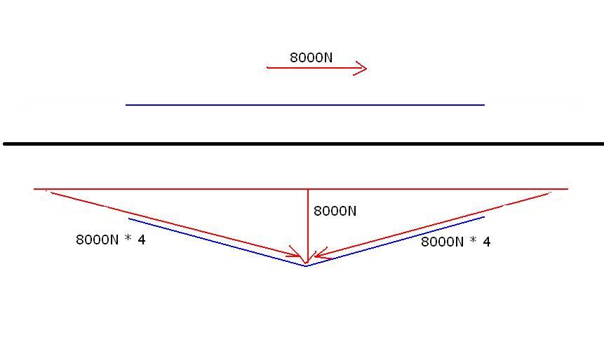 Bei Zugkraft in Seilrichtung gibt es nichts umzurechnen. Bei Zugkraft senkrecht zum Seil, wird die senkrechte Kraft in zwei zum Seil parallel laufenden Kräfte aufgeteilt - mittels eines Dreiecks. Da sieht man, dass die Zugkräfte auf das Seil um ein Vielfaches (hier grob geschätzt 4 -faches) größer sind und das Seil dementsprechend eine viel viel größere Bruchkraft aushalten muss ...