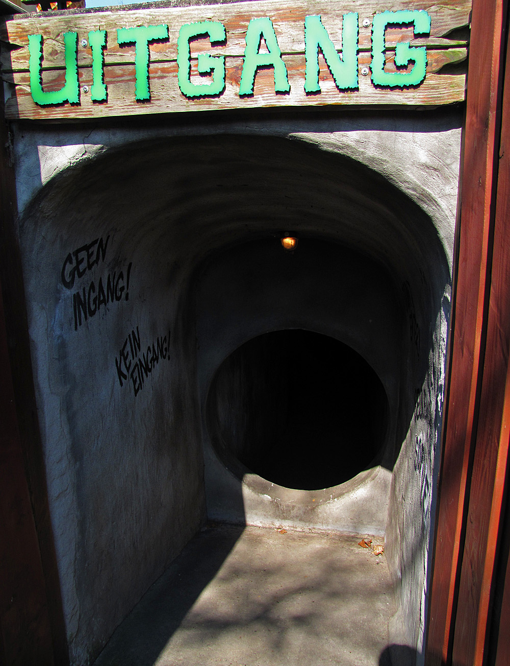 Also hier kann man dem Park mal ein Lob aussprechen. Die Thematisierung ist sehr einfach aber wirklich gut gelungen. Man hat tatsächlich das Gefühl, in einer Kanalisation zu stecken. Fehlen nur noch die Ratten. Aus Rohren kommt Wasser und von oben hört man Straßenlärm. Der eingesetzte Nebel trägt zur beklemmenden Atmosphäre bei.